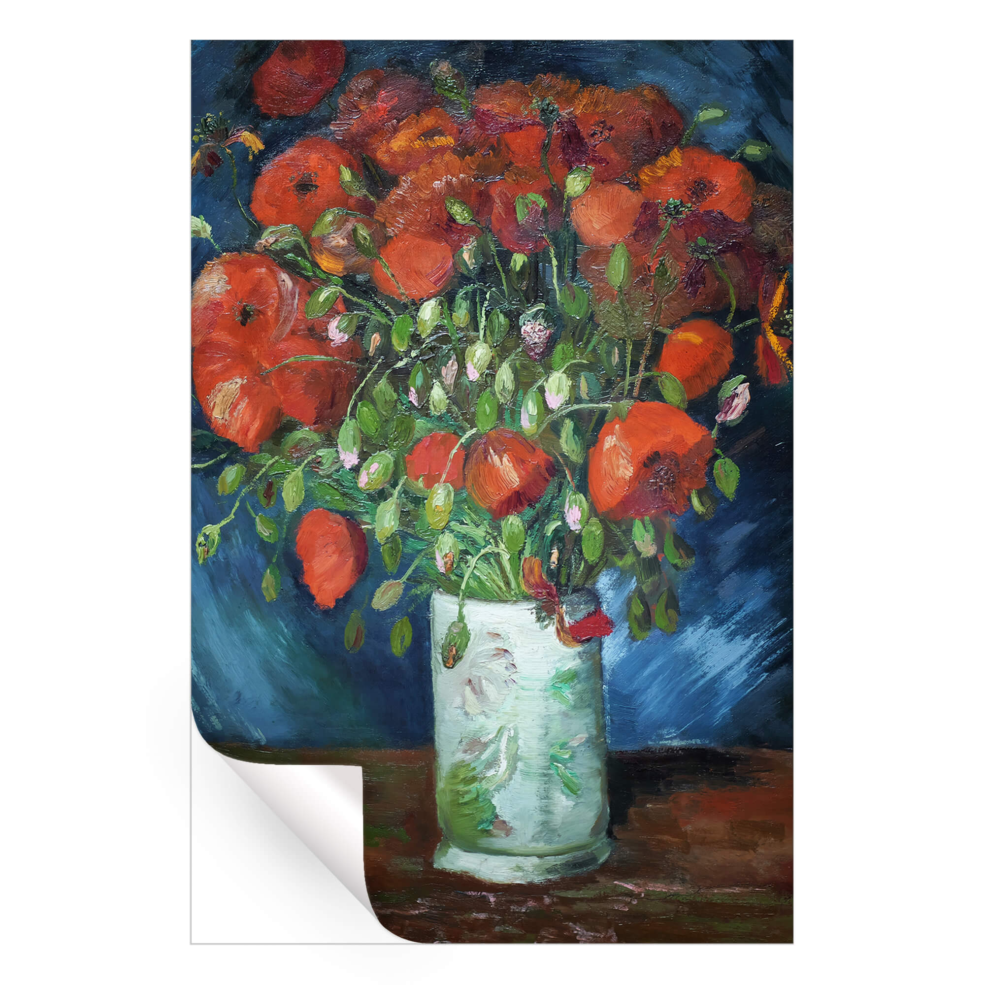 Vase with Poppies by Vincent van Gogh shows petals the color of fresh embers crowd together in a porcelain vessel, leaning softly into a deep ultramarine night. The red blossoms glow, their velvety edges touched by hints of amber and magenta while unopened buds peek through bright green stems. Shadowed strokes in the background create a quiet swirl of indigo that feels almost like evening air. Rough, visible brushwork leaves a lively texture that keeps the flower wall art feeling immediate and intimate.