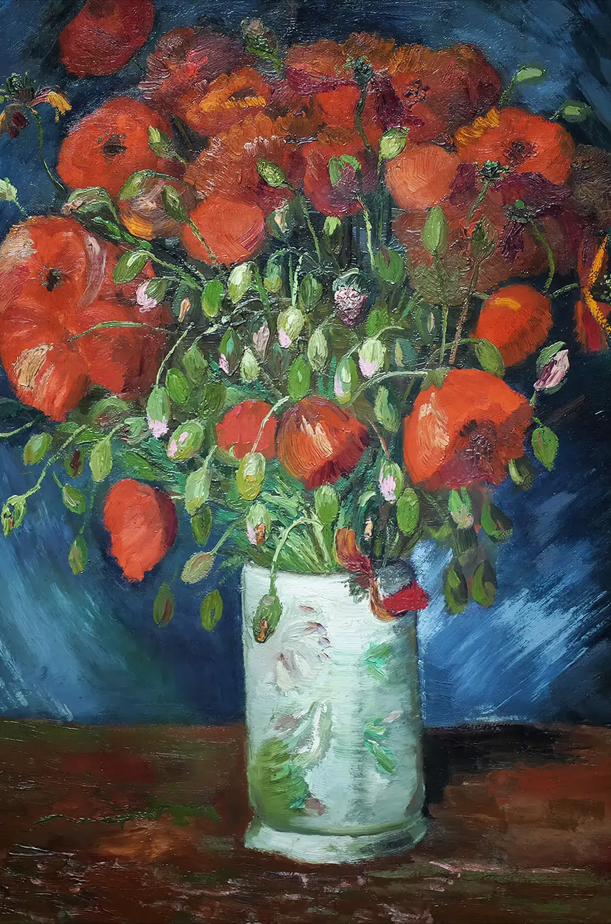 Artist Information – Curated by The Classics Collective gallery, the image echoes Post-Impressionist still lifes that celebrate everyday beauty through bold color and loose strokes. The Collective hand-selects historic public-domain paintings and meticulously restores them for high-definition reproduction, making iconic artwork available in contemporary oversized formats. Their catalog focuses on emotive color palettes, and the vibrant poppies here perfectly suit that mission.
