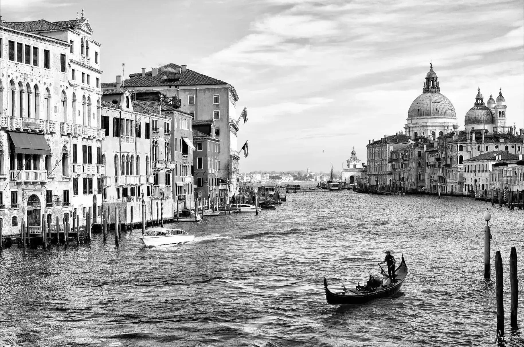 A single gondola with a gondolier is prominent, adding a touch of the city’s romantic and traditional charm. In the distance, the majestic dome of Saint Mark’s Basilica underlines Venice’s rich architectural heritage and the timeless allure of this unique city.