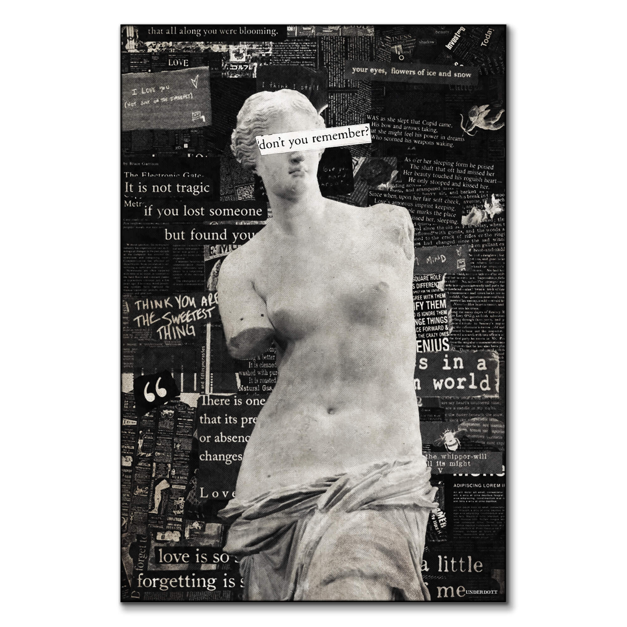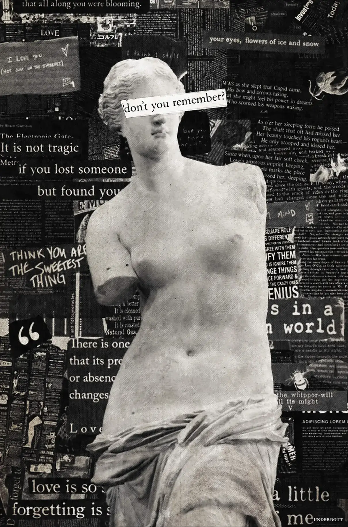 Broken marble meets jagged poetry. The armless Venus de Milo rises in soft gray, her gaze obscured by a torn strip that reads “don’t you remember?” Around her, scraps of song lyrics, typewritten confessions, and hand-scrawled quotes fill a black field like swirling thoughts. White doves and whisper-thin flowers interrupt the darkness, adding faint hope to the crowded text. Rough newspaper textures fade in and out, while chalk hash-marks and quotation marks hang like falling confetti.