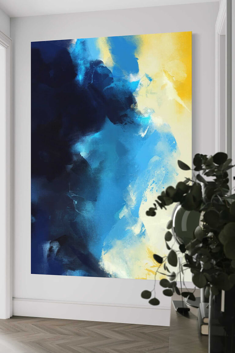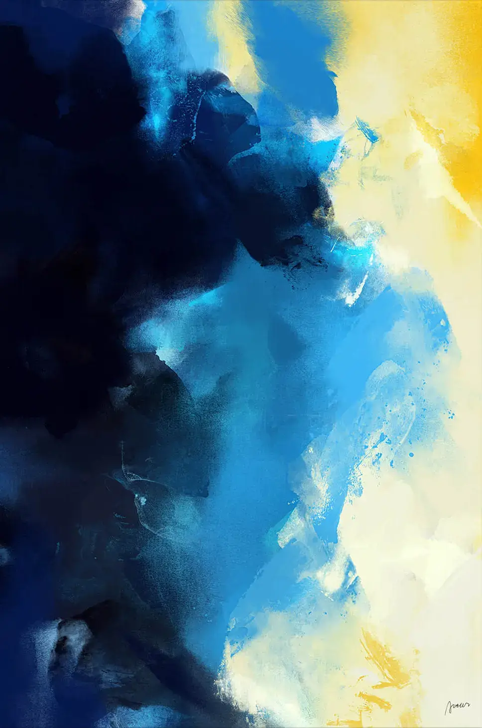 Swathes of deep and light blues collide, creating a textured work that feels both energetic and introspective. A luminous patch of yellow cuts through the cool tones, offering a bold contrast that could be interpreted as a moment of clarity or inspiration amidst a flurry of thought and emotion.