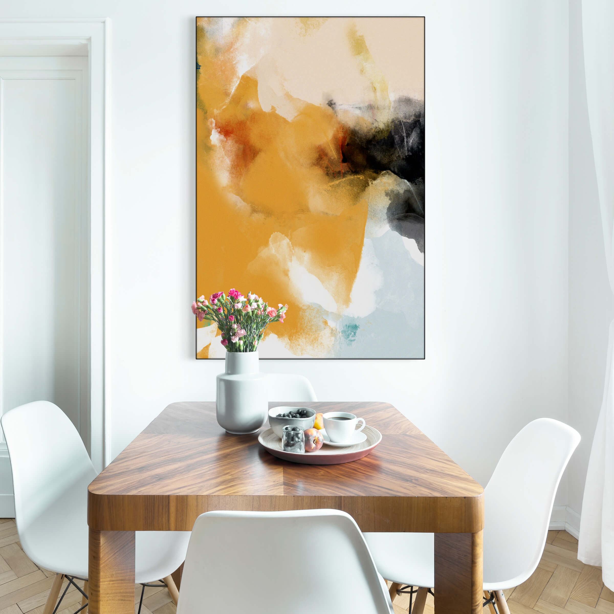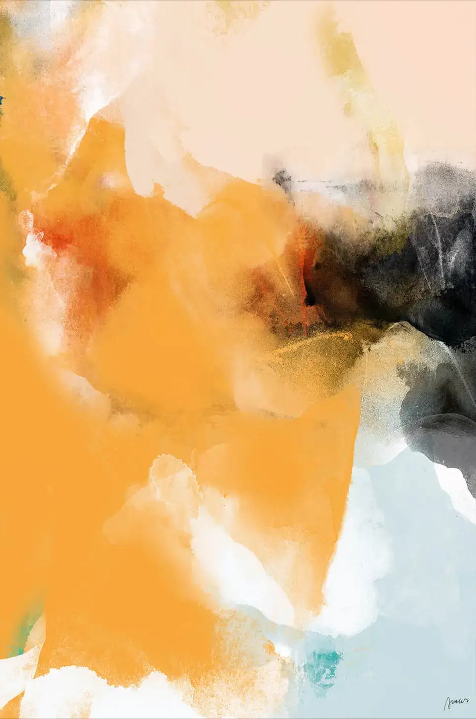 A vibrant expanse of golden and amber hues dominates, evoking the warmth of a sunlit afternoon. Soft washes of pale blue and white cut through the warmth, adding a distant cool breeze. Touches of deep grey and hints of red add a grounding contrast, creating a sense of depth and dimension.