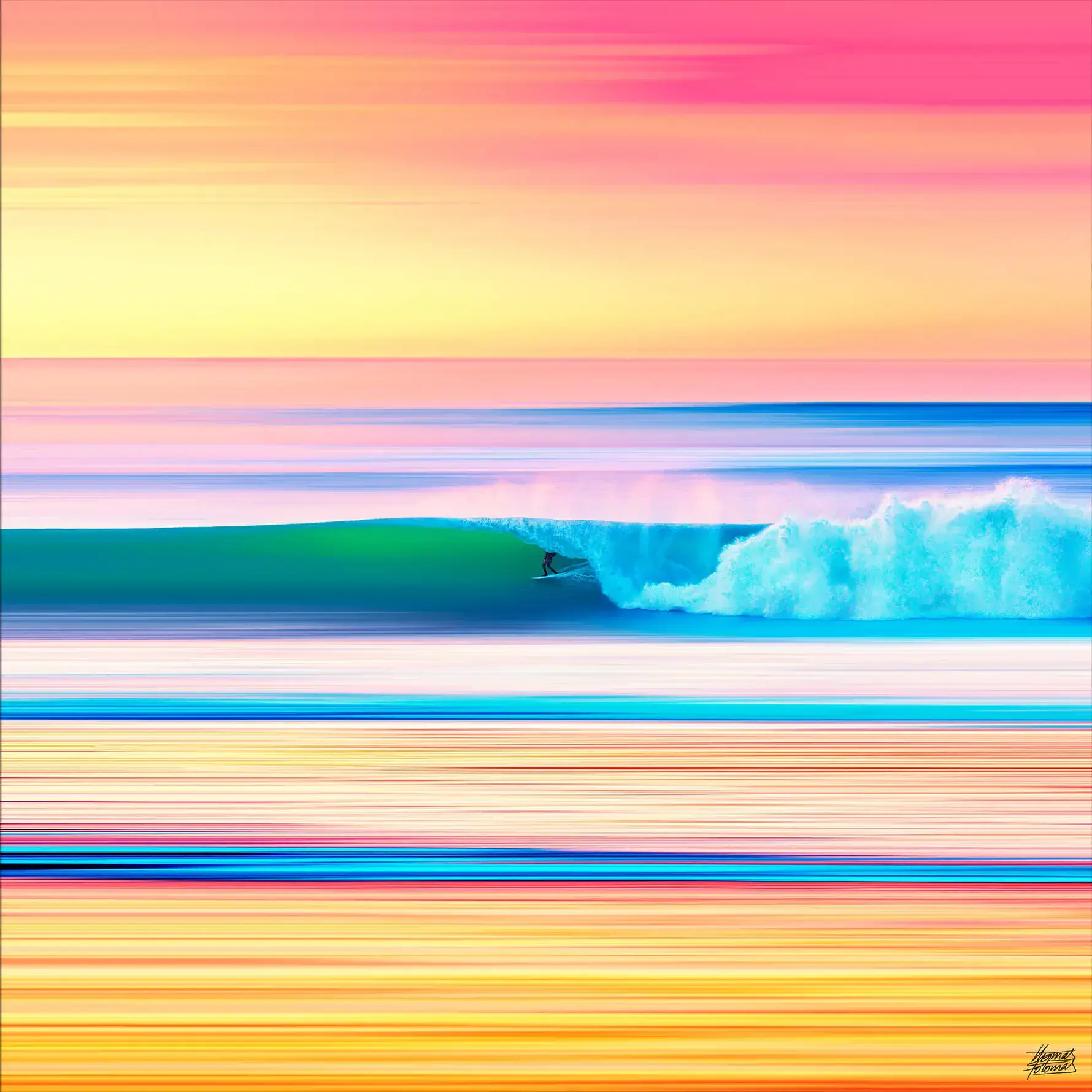 A lone surfer rides a smooth turquoise wave, framed by streaks of sunset color stretching across the sky and water. Warm pink, peach, yellow, and deep blue tones blend into long horizontal bands, giving the scene a dreamy, slowed-down feeling. The wave curls with crisp white spray, creating a bright burst of texture against the soft, flowing color around it. Even with the movement of the surf, the moment feels calm and almost meditative, like that quiet pause before the ocean picks up again.