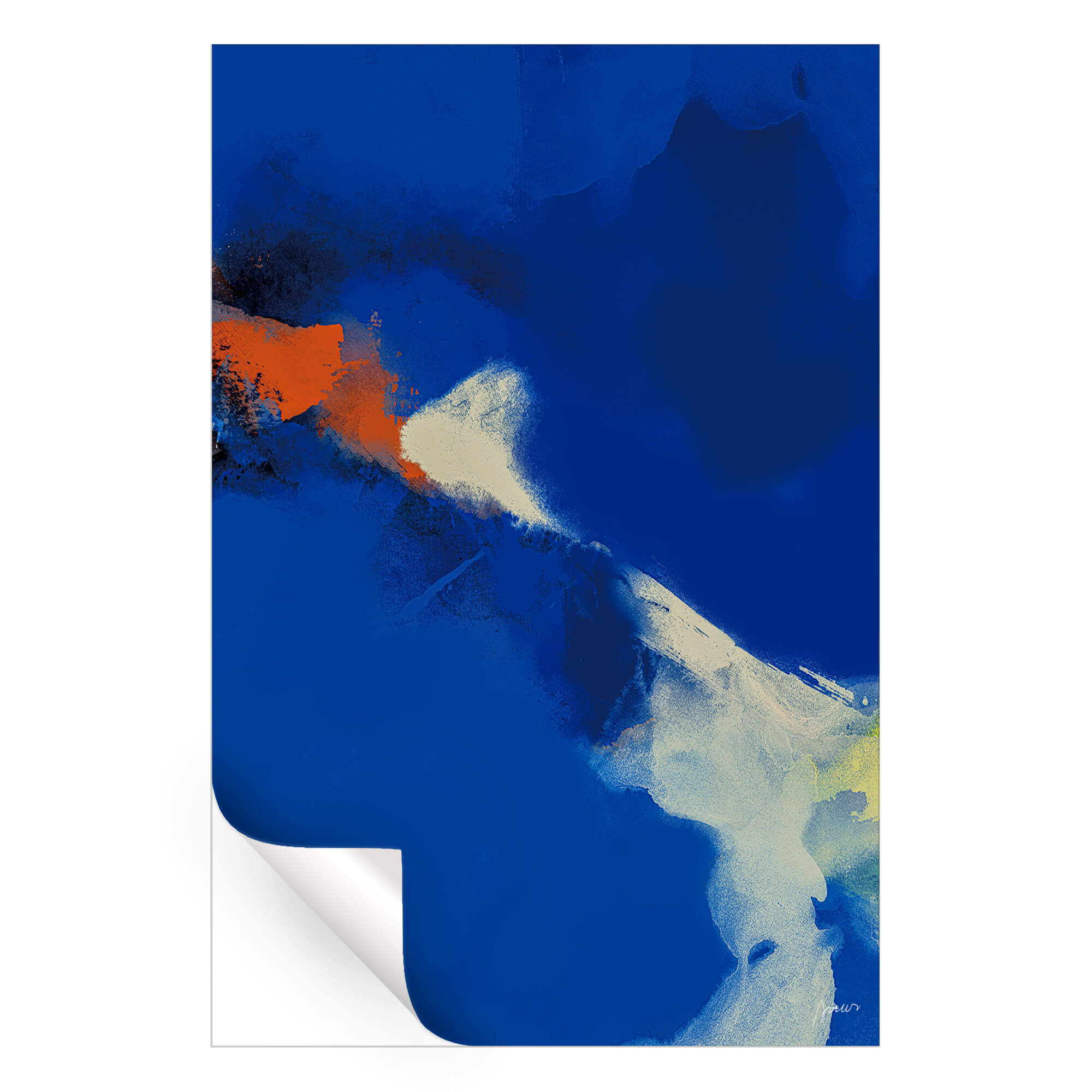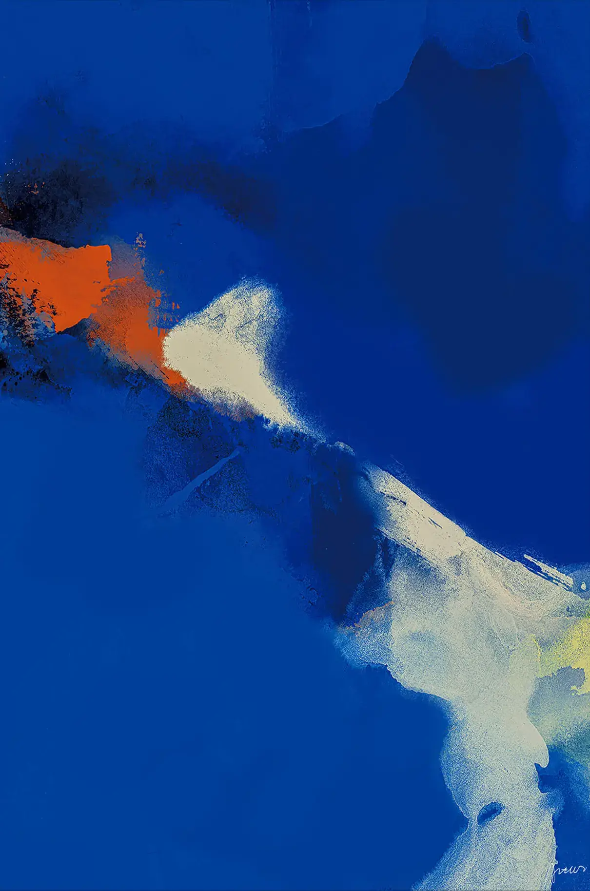 The vivid blue tones take center stage in this abstract painting, complemented by soft white hues. The bright orange accents add warmth, creating a balance between cool and warm colors. This striking composition brings depth and intrigue with its fluid brushstrokes and emotive swirls.