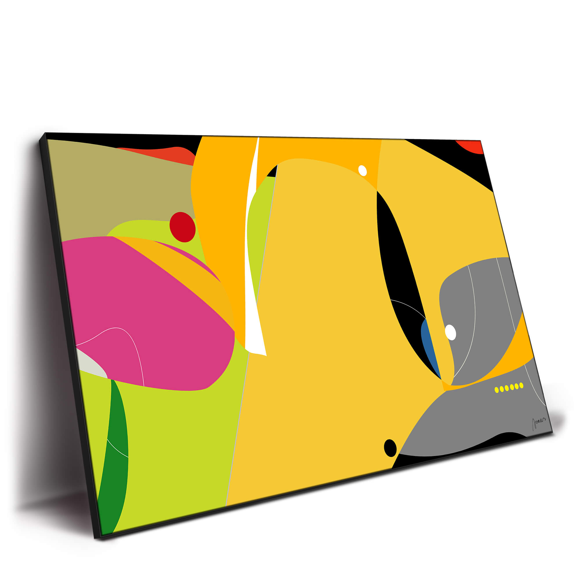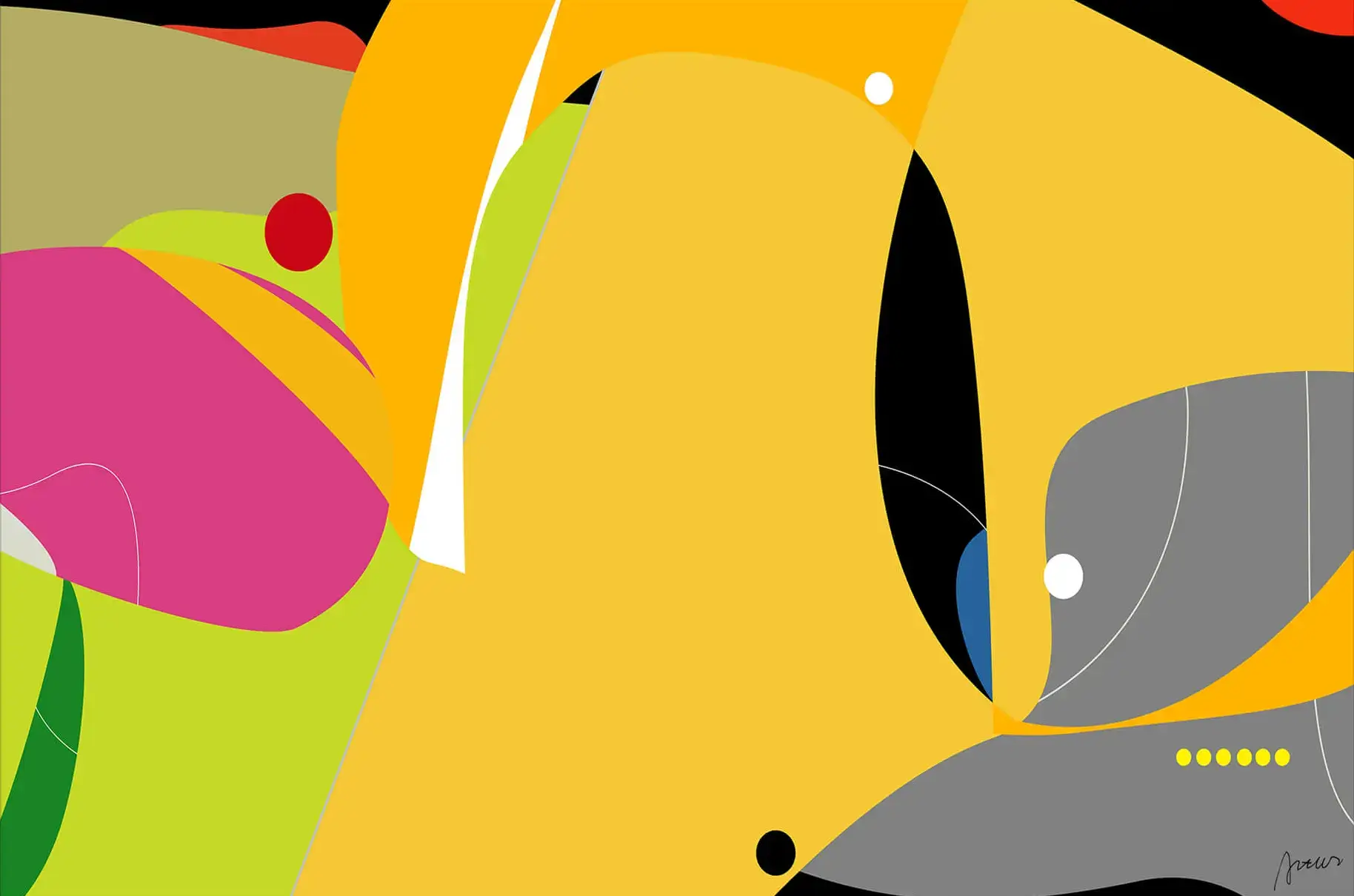 Vivid shapes in a playful array of colors—mustard yellow, soft pink, bold green, and deep black—converge to create a vibrant, abstract landscape. Circular forms and fluid lines add a sense of motion, giving the impression of a playful dance of forms and hues across the artwork.