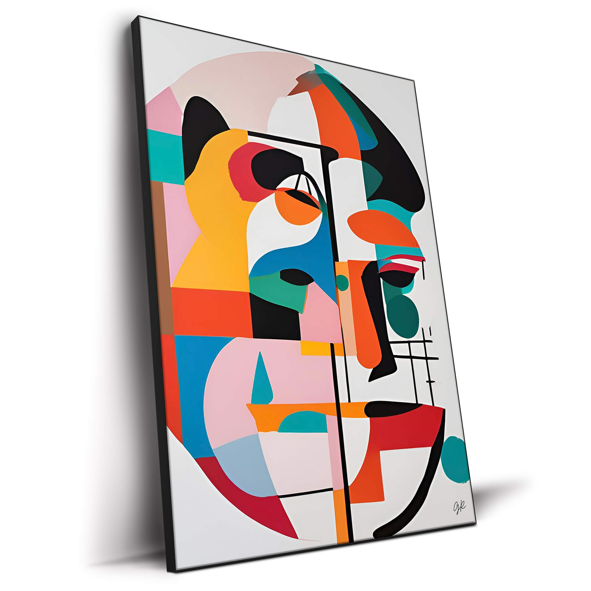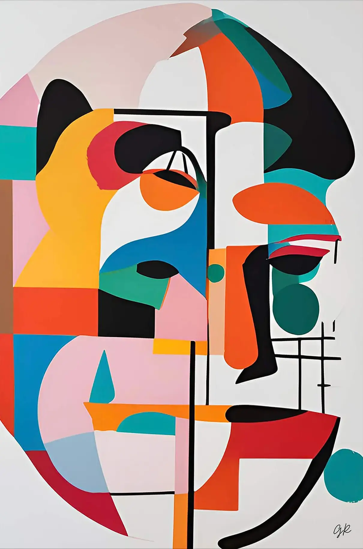 The image shows an abstract face split into interlocking planes of turquoise, tangerine, blush, and teal. Jagged black lines anchor the composition while soft arcs lighten the mood. Blocks of saturated red and deep green meet airy pastel sections, keeping the eye moving across every inch of the vertical format. Negative space outlines cheeks and brows, turning absence into line. Subtle grid marks in the lower right hint at urban architecture. A sweeping half-circle in the lower left balances a dark swoop on top, giving the silhouette a playful symmetry.