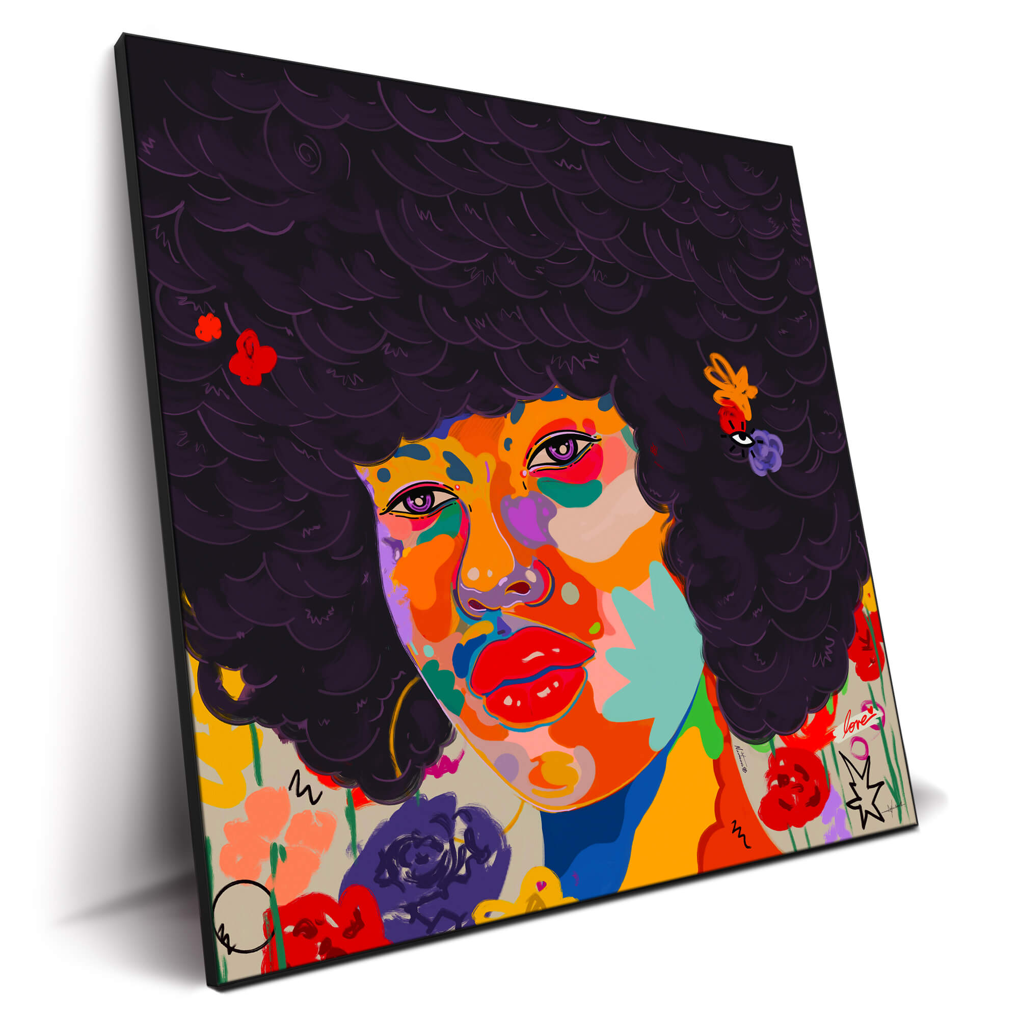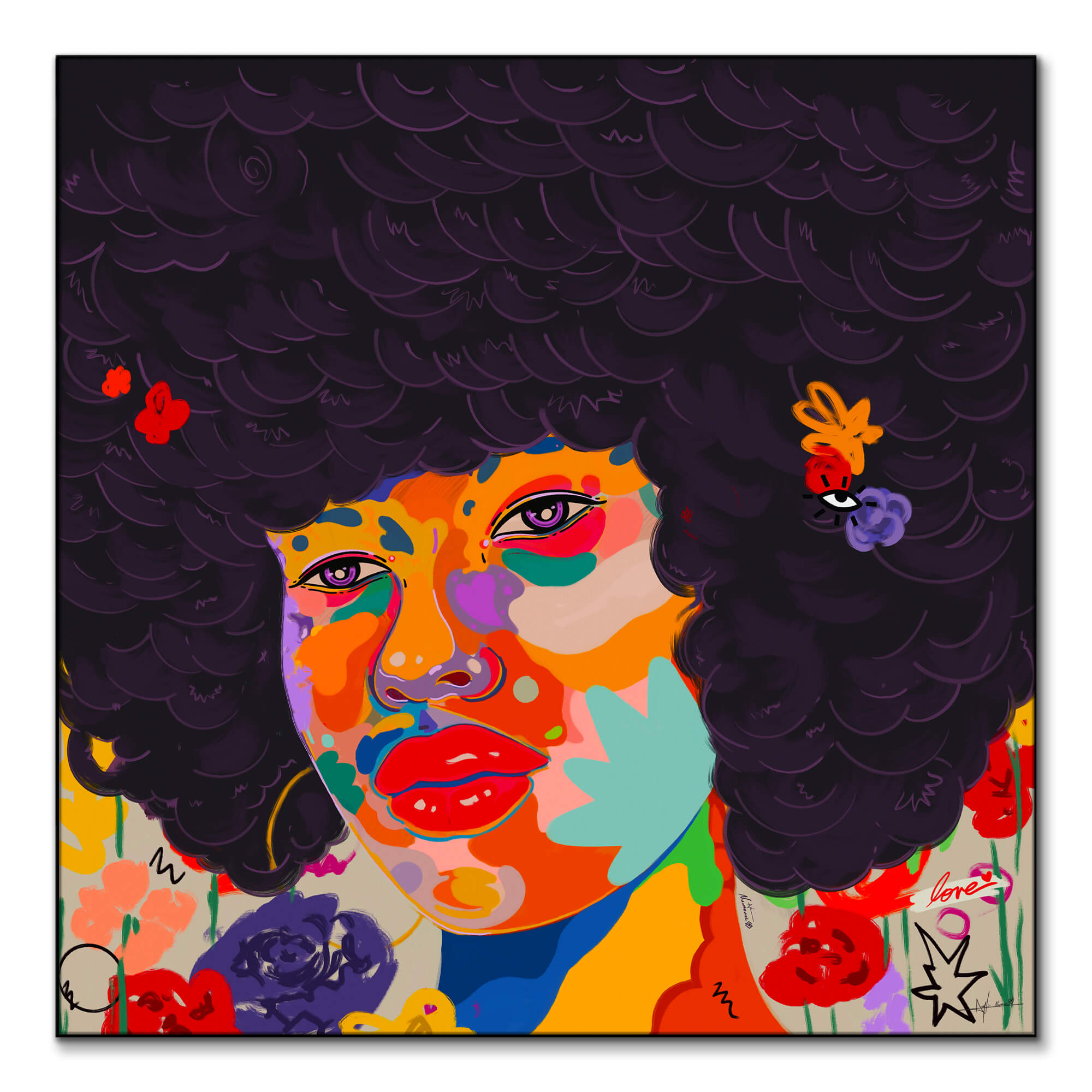 A woman with voluminous hair, pinned with flowers, is depicted in this vibrant digital painting. Her is face a canvas of bold, contrasting colors. Streaks of green accentuate her expressive eyes. Her lips are a vivid red, creating a powerful and lively presence. The background is a playful combination of abstract shapes and graffiti-like elements, giving the portrait’s energetic and modern feel.