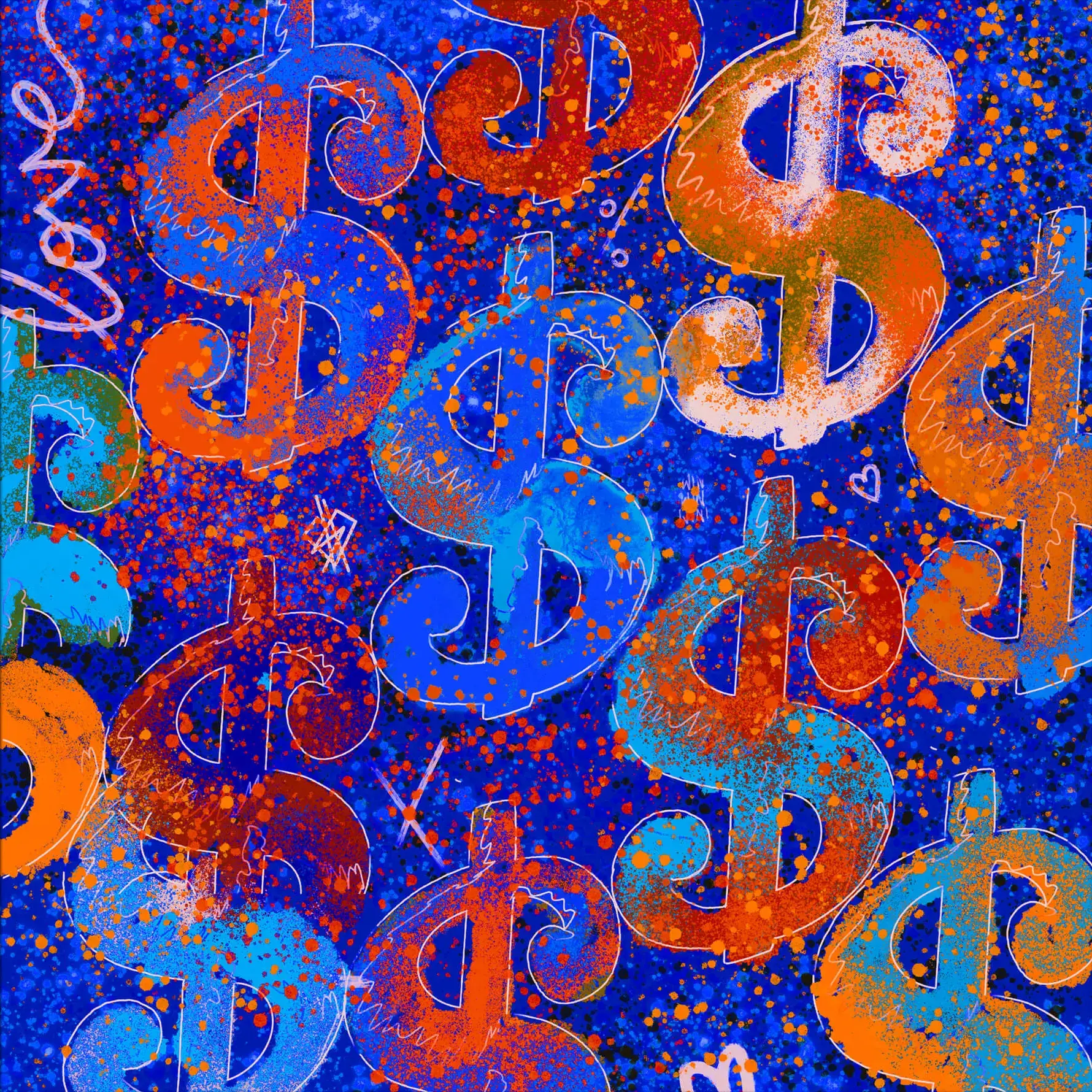 Overlapping dollar signs in shades of blue and orange stand out against a deep blue background speckled with orange and white. The currency symbols vary in opacity and size, creating a layered and textured effect.