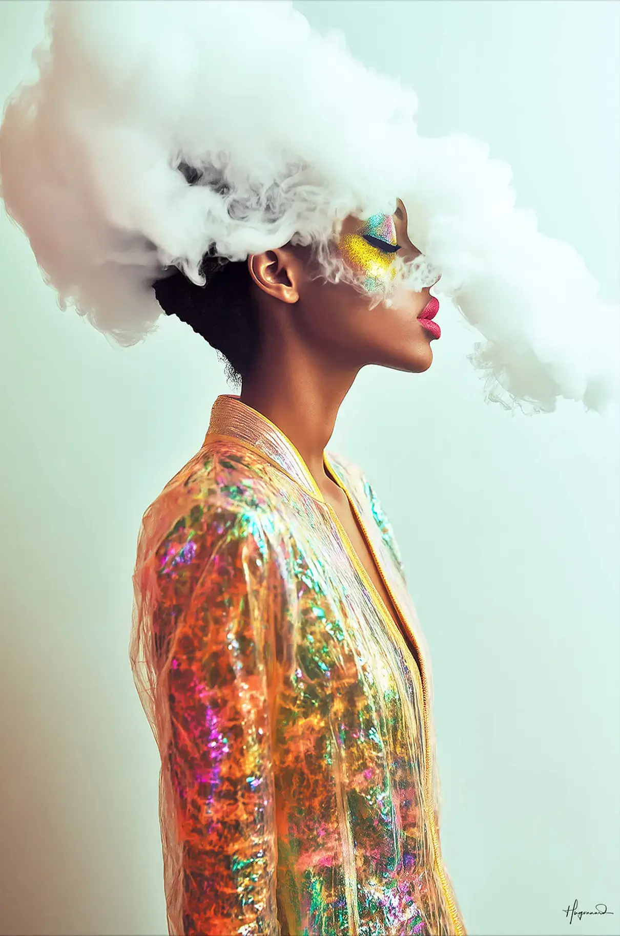 Pearl mist floats where hair should be, shaping a billowy crown that drifts across the model’s profile. Her skin, rendered in gentle cocoa tones, stands out against the soft aqua backdrop. A slick iridescent jacket scatters rainbow sparks that glint against the pastel field. The model holds a quiet side pose, lips touched with hot pink while her eyes vanish beneath cloud vapor. Light gathers along the garment, pulling metallic amber and green fragments into focus. The look feels futuristic yet dreamy, offering a soothing pause. Color harmony leans toward pale mint, warm gold, and cotton white for a relaxed vibe. As high-style fashion wall art, the print blends runway attitude with surreal calm.
