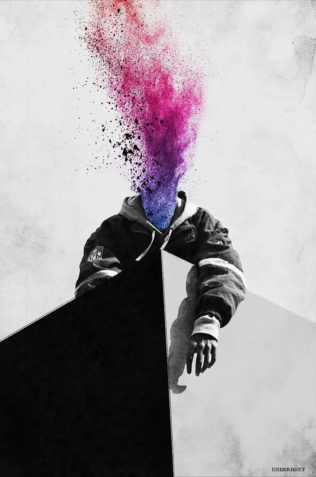 Known for merging digital collage with spray-painted textures, creating hybrid visuals that question identity and conformity. Burnout echoes the artist’s fascination with fragmented faces and explosive color trails that symbolize thought overload. Explore more in the Underdott art collection to see how monochrome bodies and vibrant particle clouds recur throughout his punk-inspired portfolio.