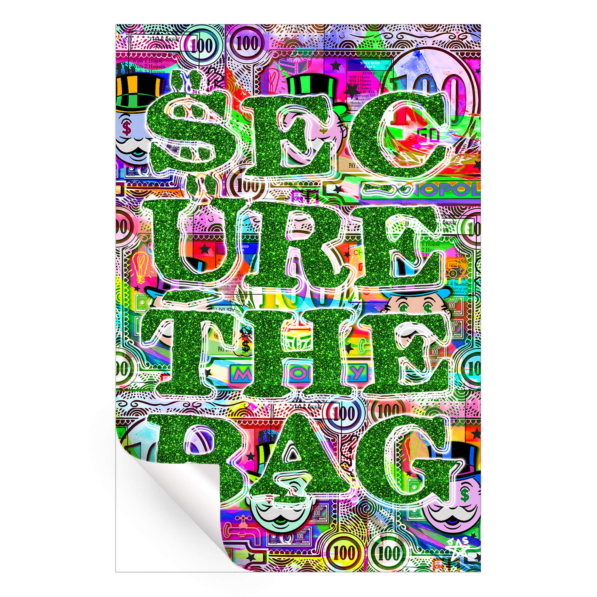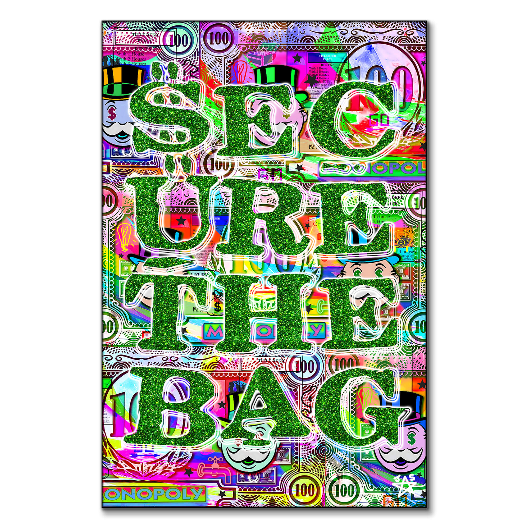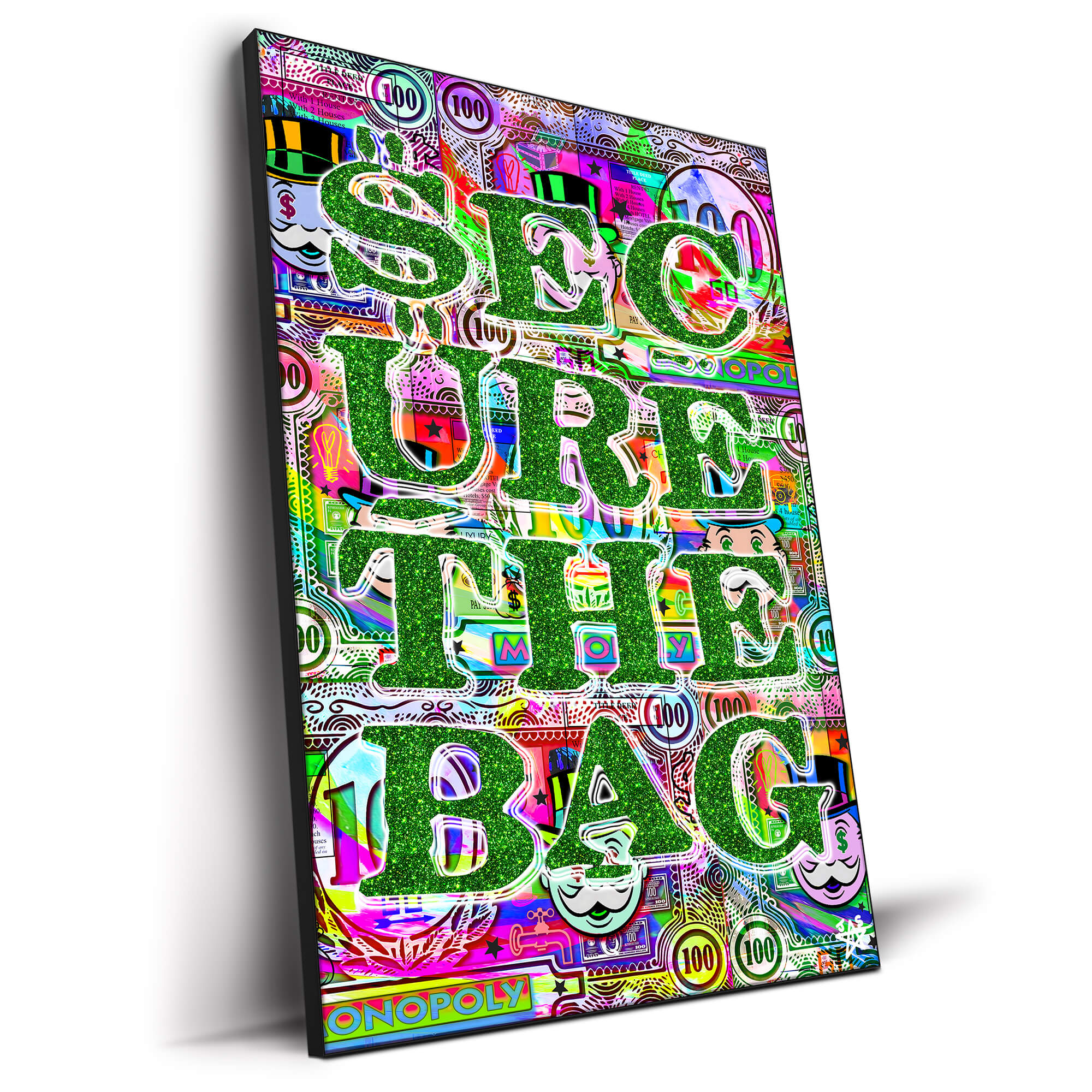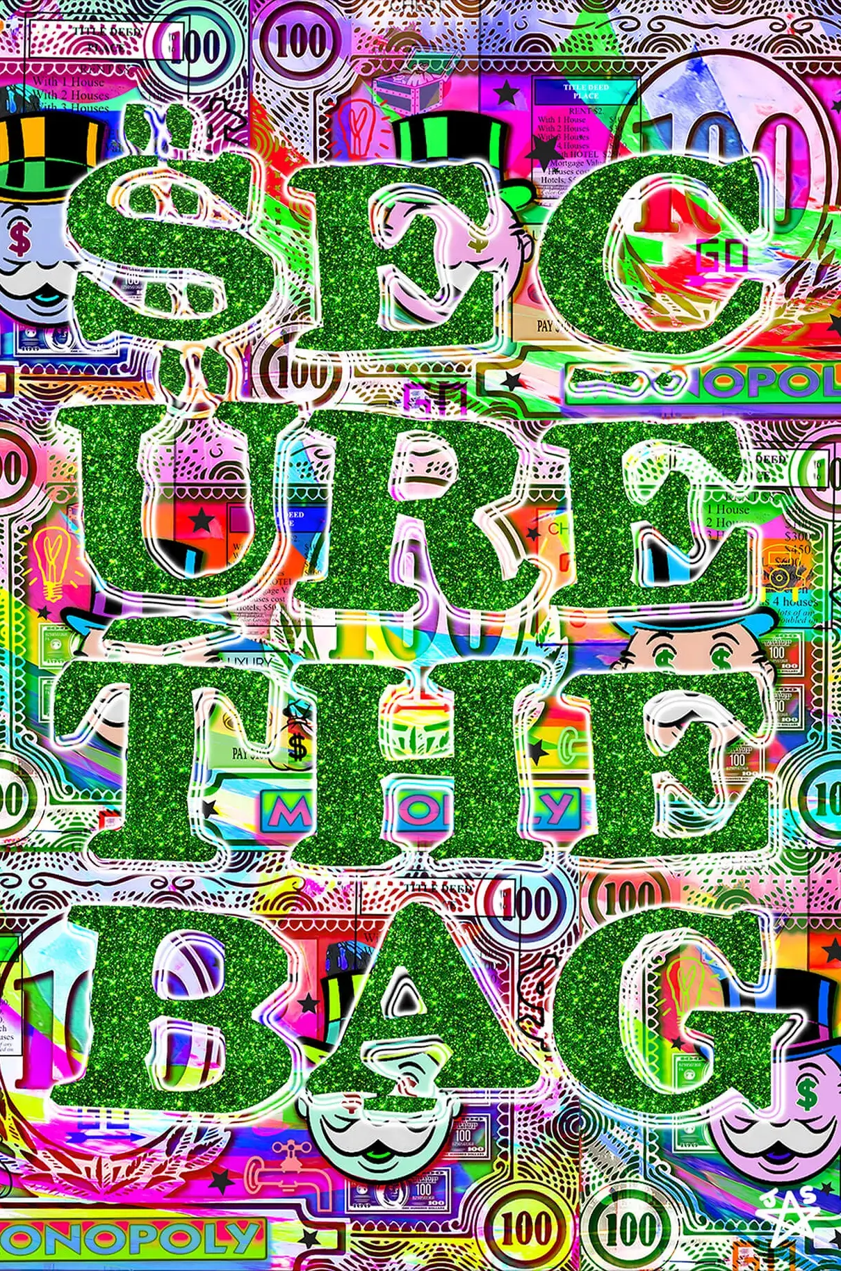 Bold and vibrant piece with “SECURE THE BAG” in glittering green letters over a colorful Monopoly money collage. Bright hues and patterns create an energetic composition celebrating wealth and ambition.