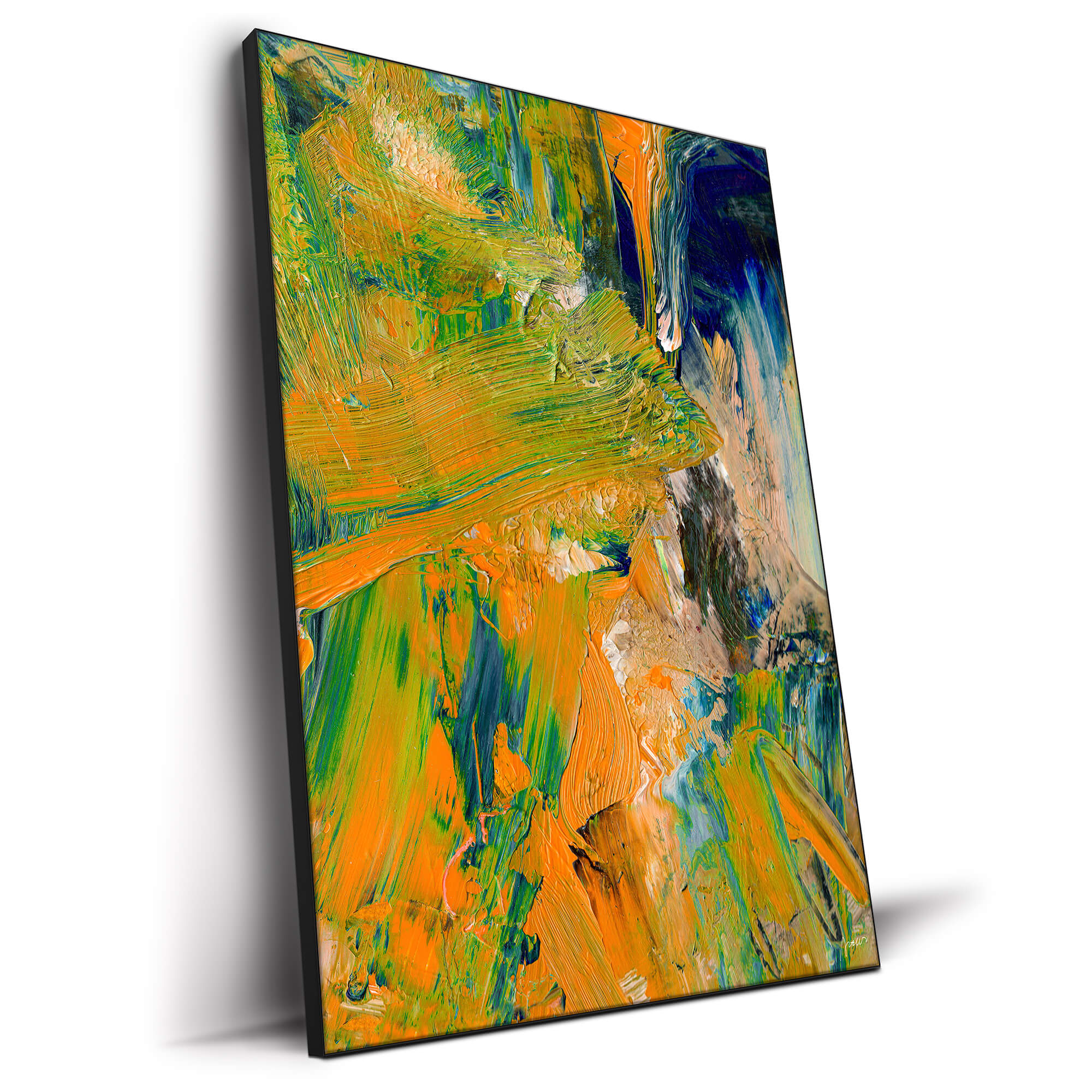 The contrast between the fiery oranges and rich greens creates visual tension that feels both raw and deliberate. It’s abstract art at its most expressive—intense, textured, and impossible to ignore.
