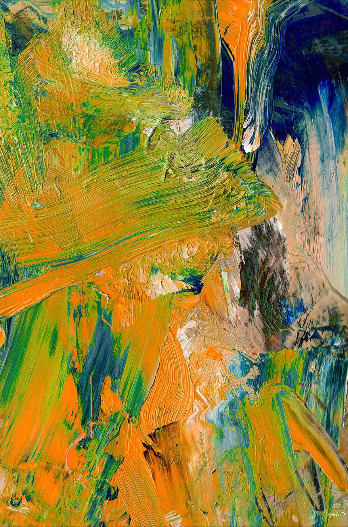 Vivid strokes of orange, green, and deep blue collide with raw energy in this bold abstract painting. The texture is thick and expressive, each layer revealing the artist’s confident movement and rhythm. The colors feel alive—warm, earthy, and dynamic, yet balanced by cooler undertones.