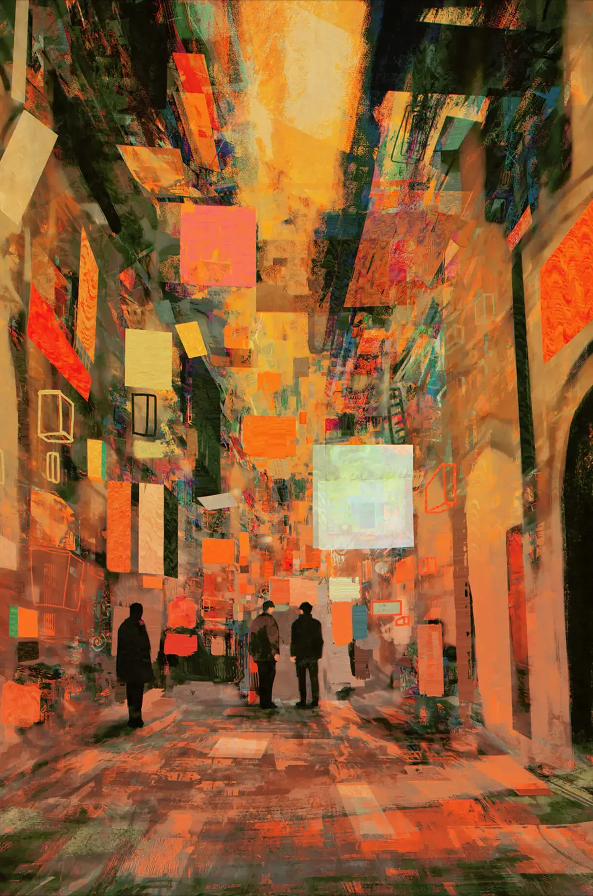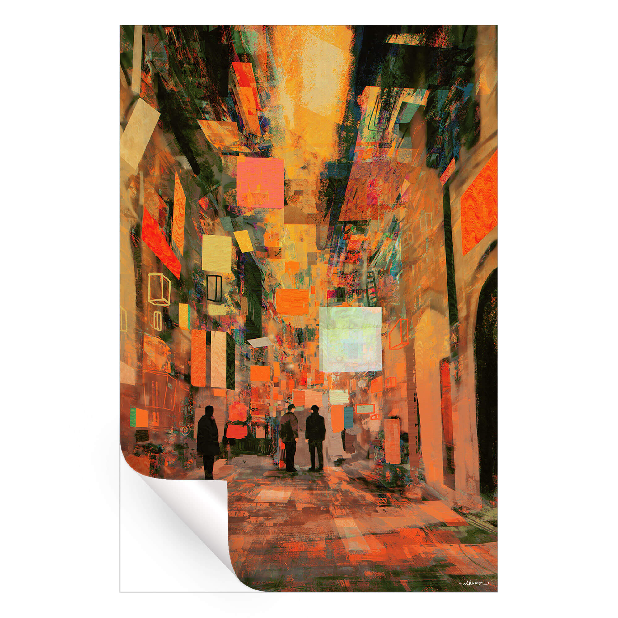 People pause in a narrow street painted with bright orange shapes that turn the walls into a wild, jumbled art piece. The sharp colors twist around them, making a plain alley look like a cool painting.