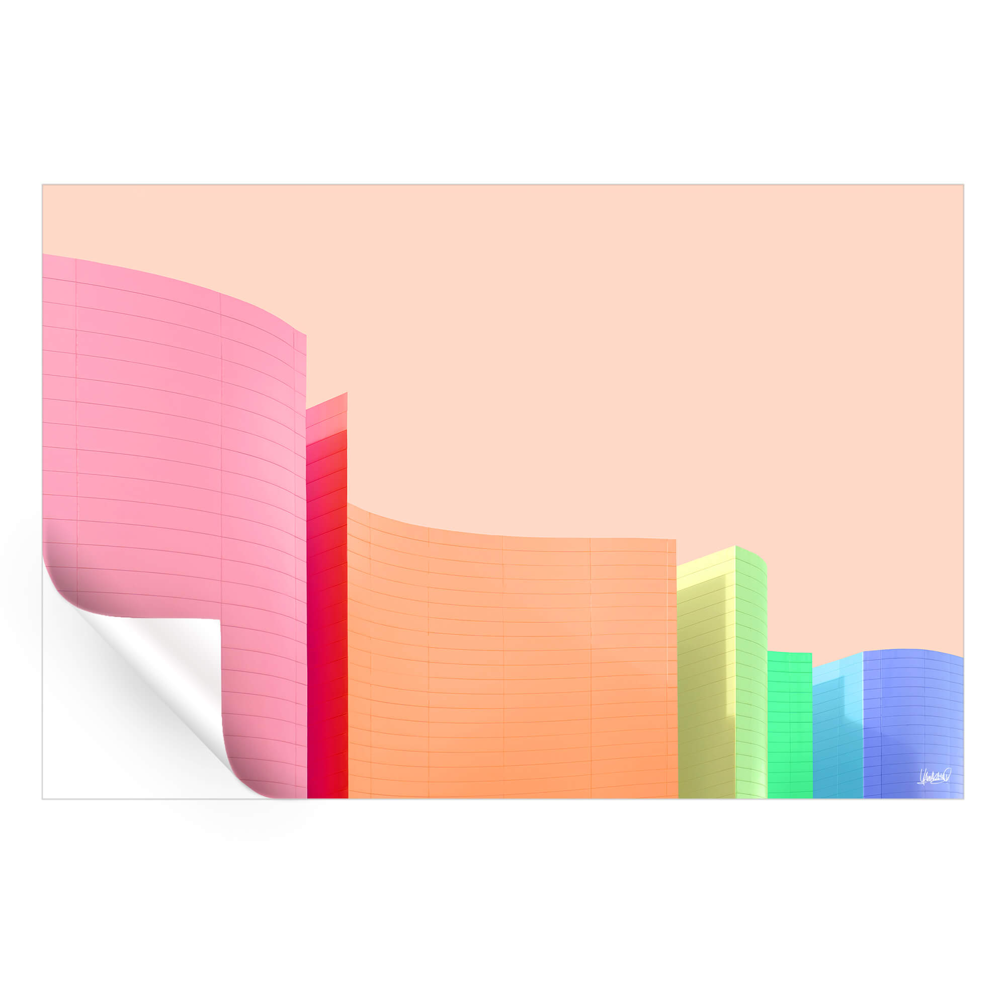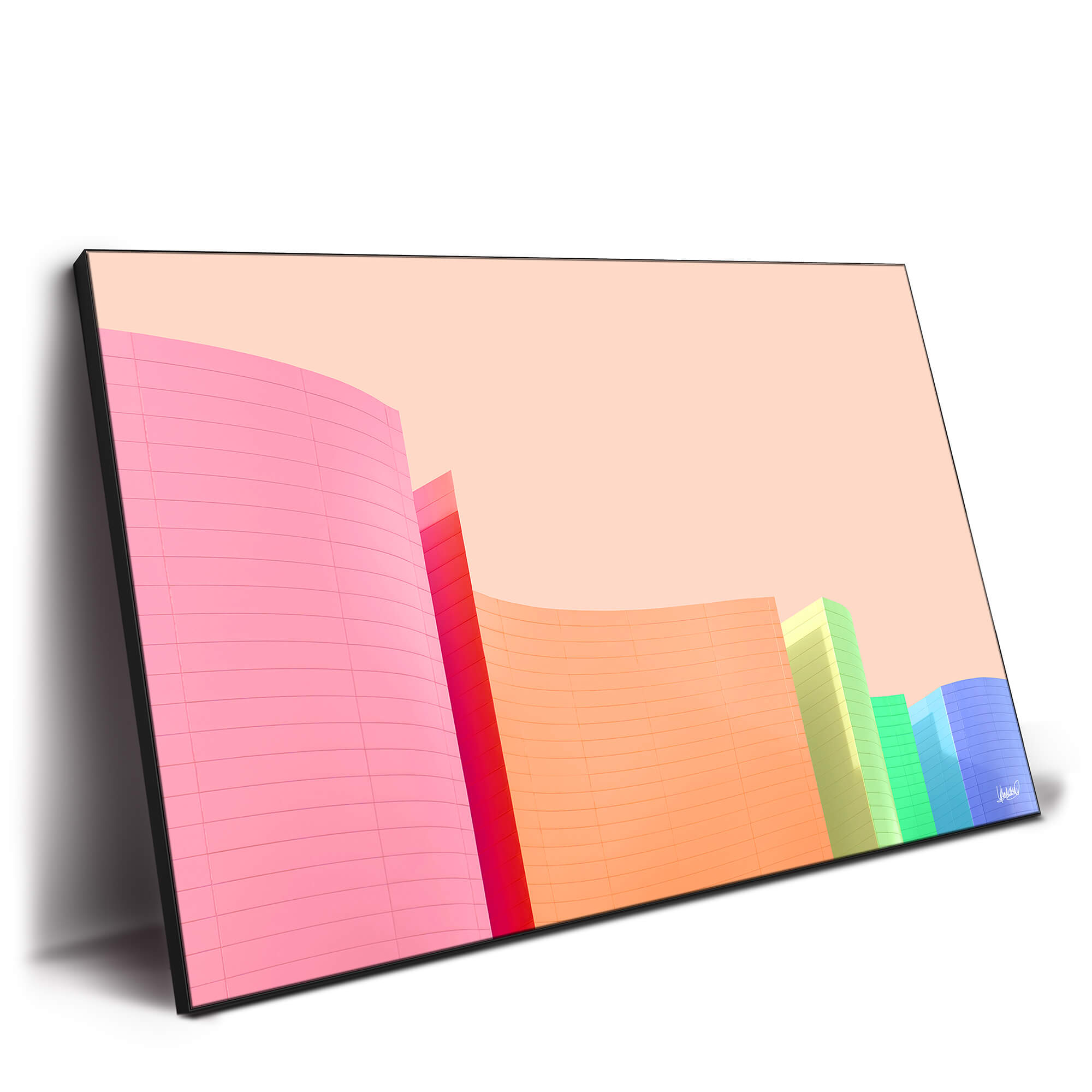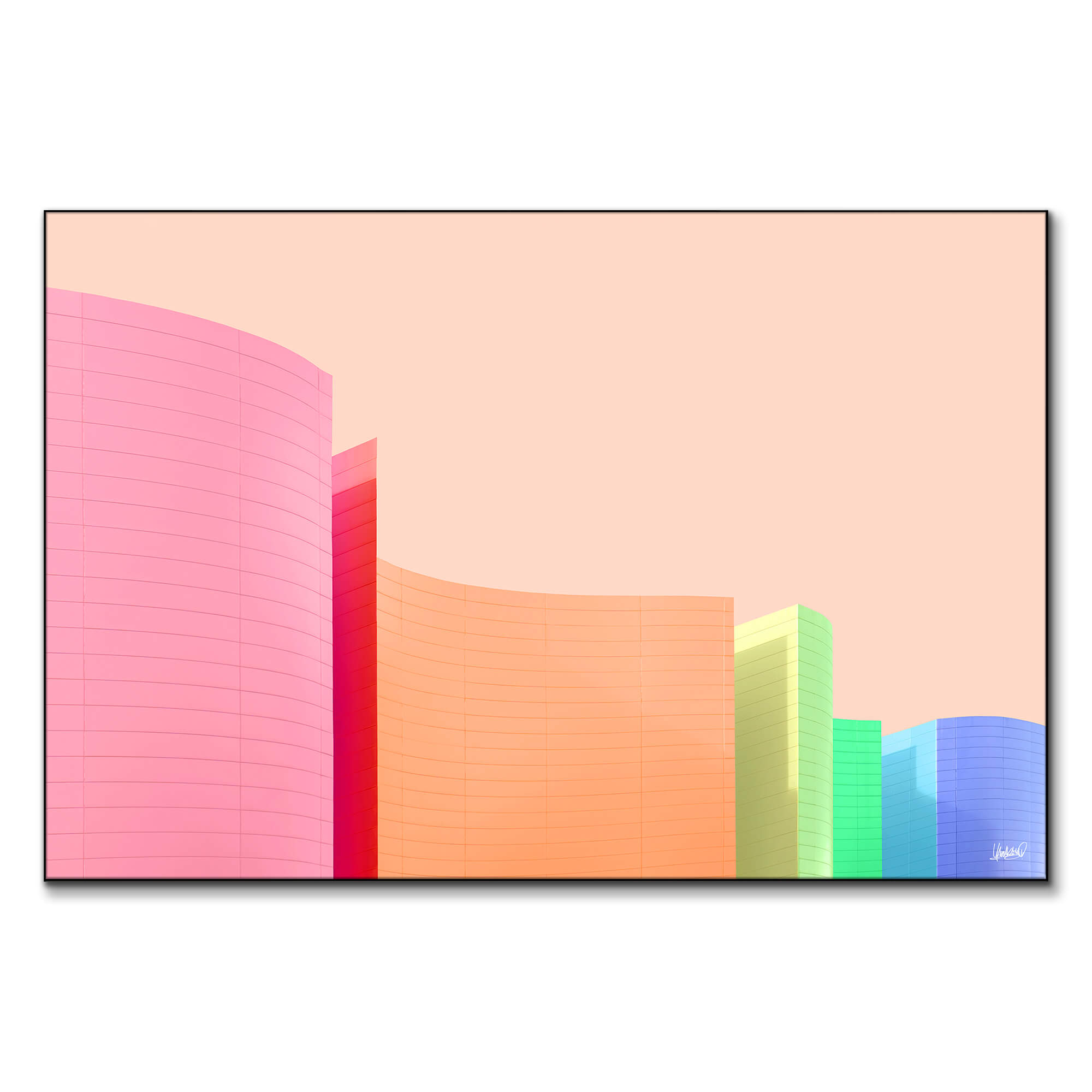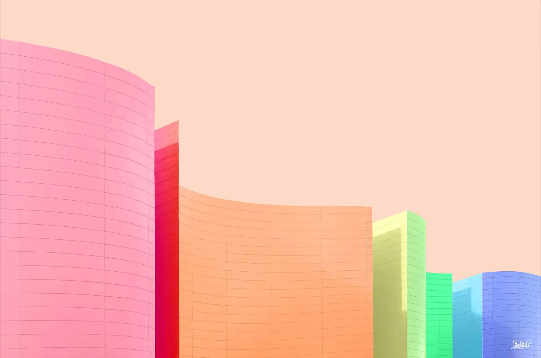 Vibrant color and smooth form meet in this architectural abstract. A gradient of pink, orange, yellow, green, and blue curves across the canvas, creating a playful rhythm that feels modern and optimistic. The pastel tones are bright yet balanced, giving the piece a polished, airy quality.