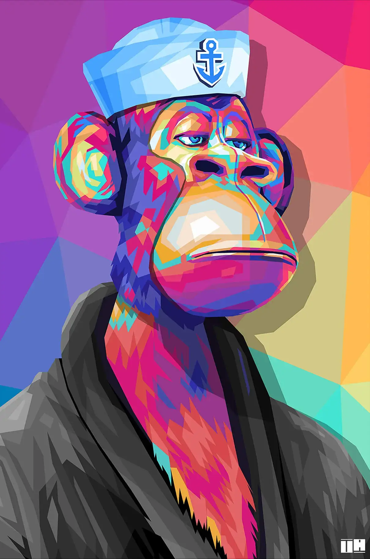A vibrant pop-art style depiction of a bored-looking chimp wearing a sailor hat with an anchor emblem. The colorful geometric patterns in shades of purple, pink, orange, and blue create an energetic visual, contrasting with the chimp’s calm expression. The “Vibrant Sailor Hat Ape Pop Art” piece adds a playful and modern edge to any space.