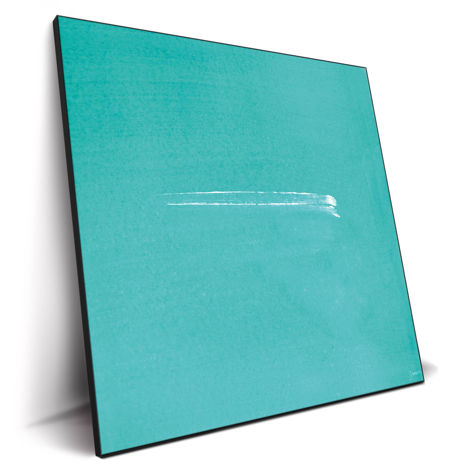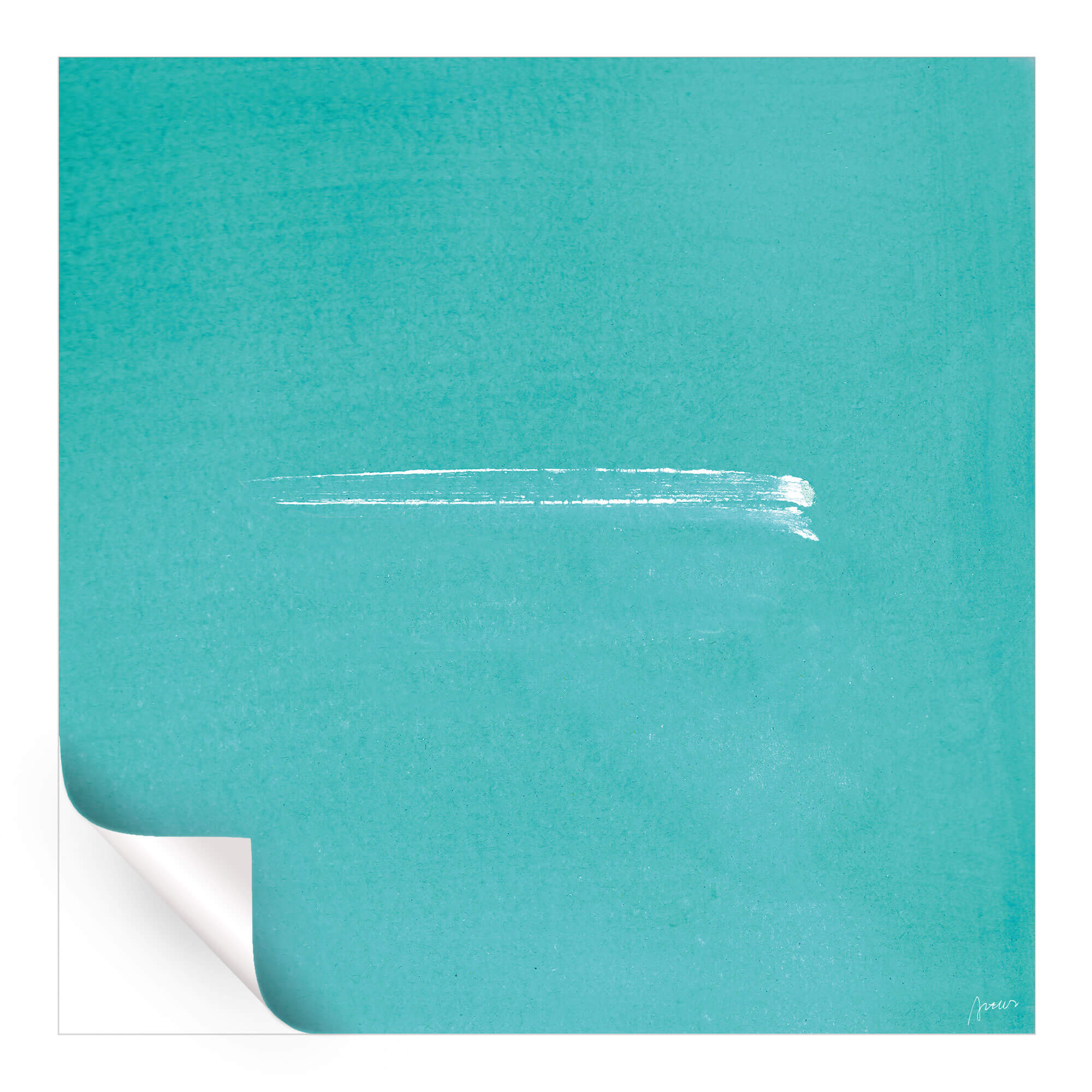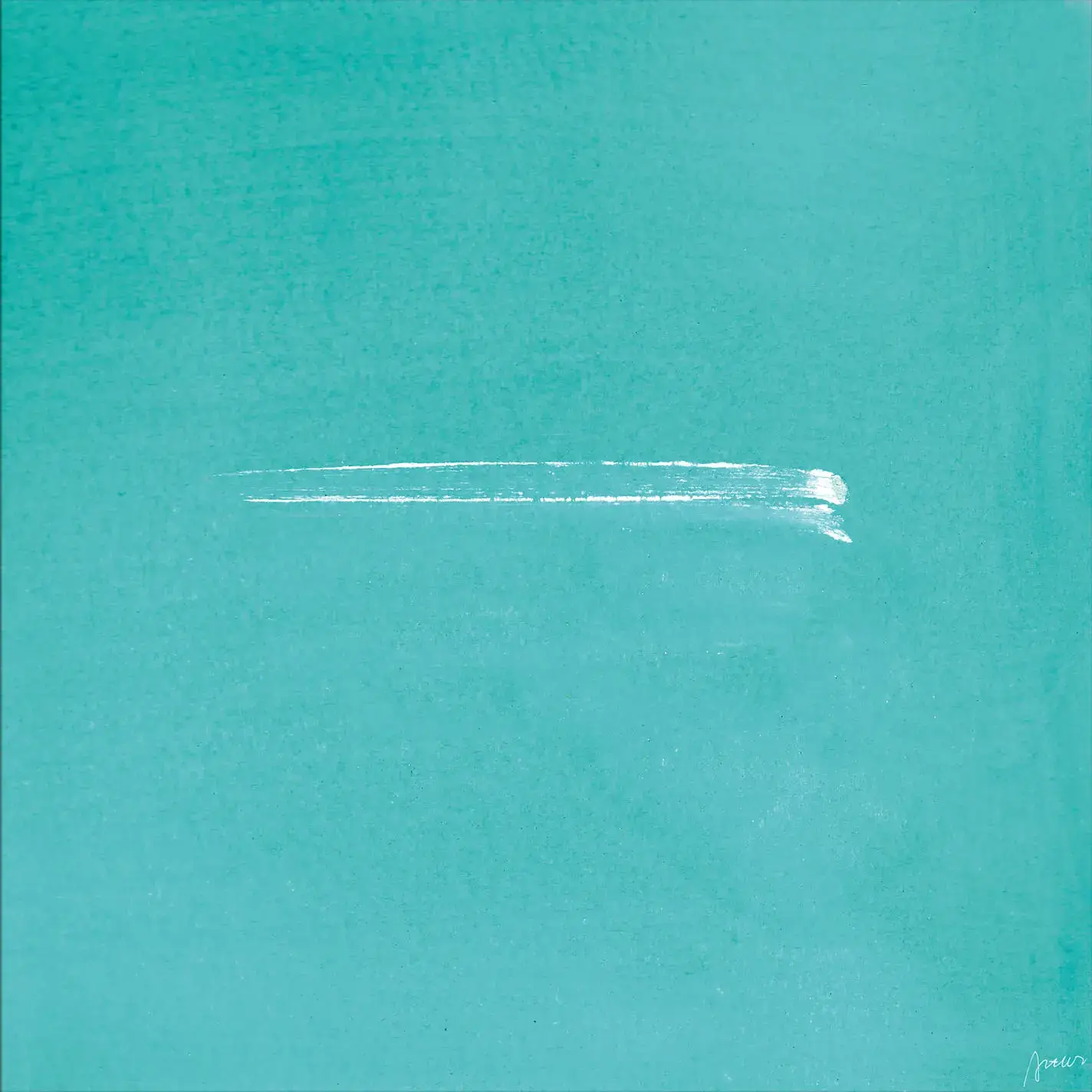 A tranquil aqua background is softly textured, with a singular, delicate white stroke drawn across. This minimalistic gesture stands out, a stark, solitary line of brightness, embodying simplicity and the essence of clarity in a vast sea of calm.