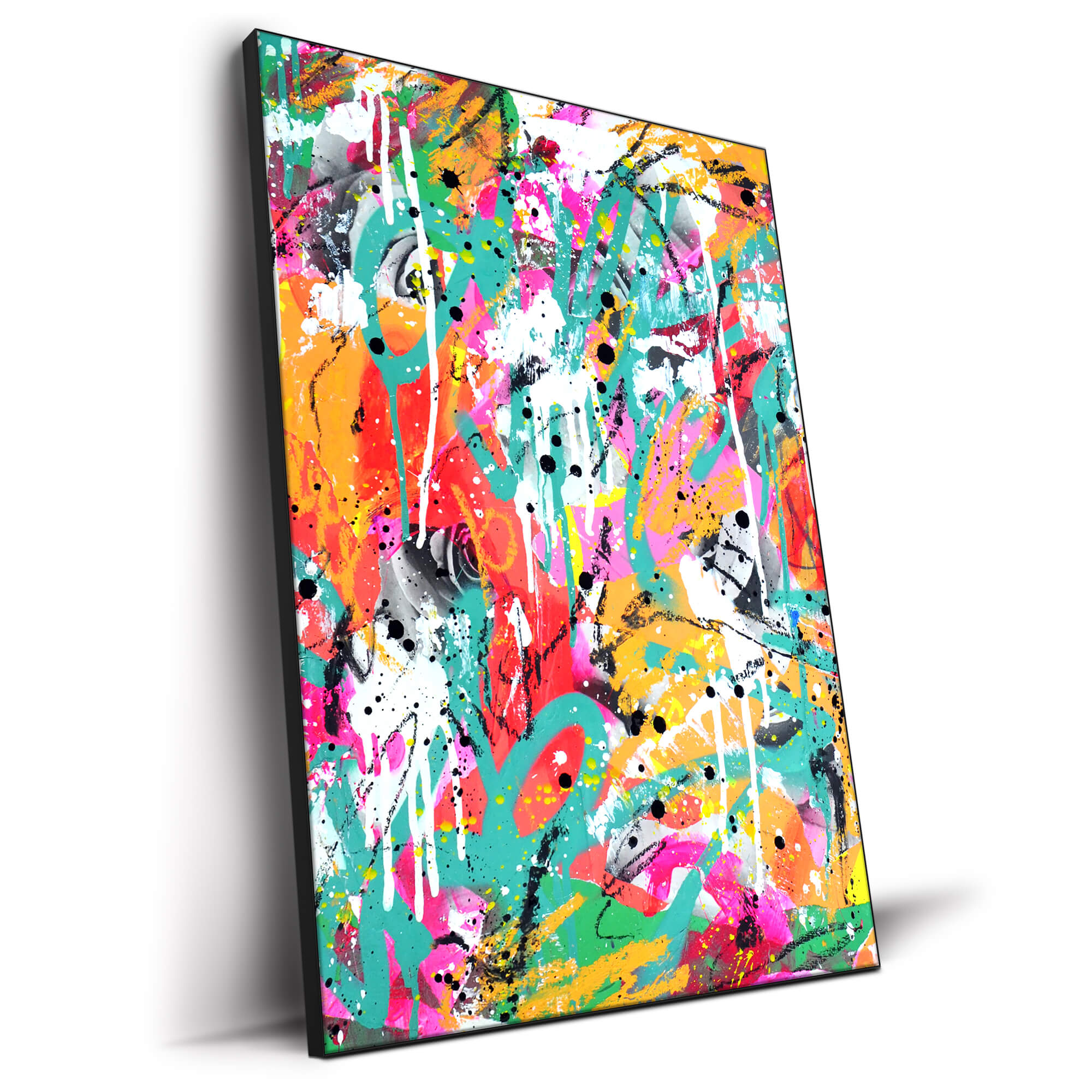 Bright turquoise, orange, pink, and yellow colors splash across the artwork, mixed with black and white dots and streaks. The colorful pattern is energetic and bold.