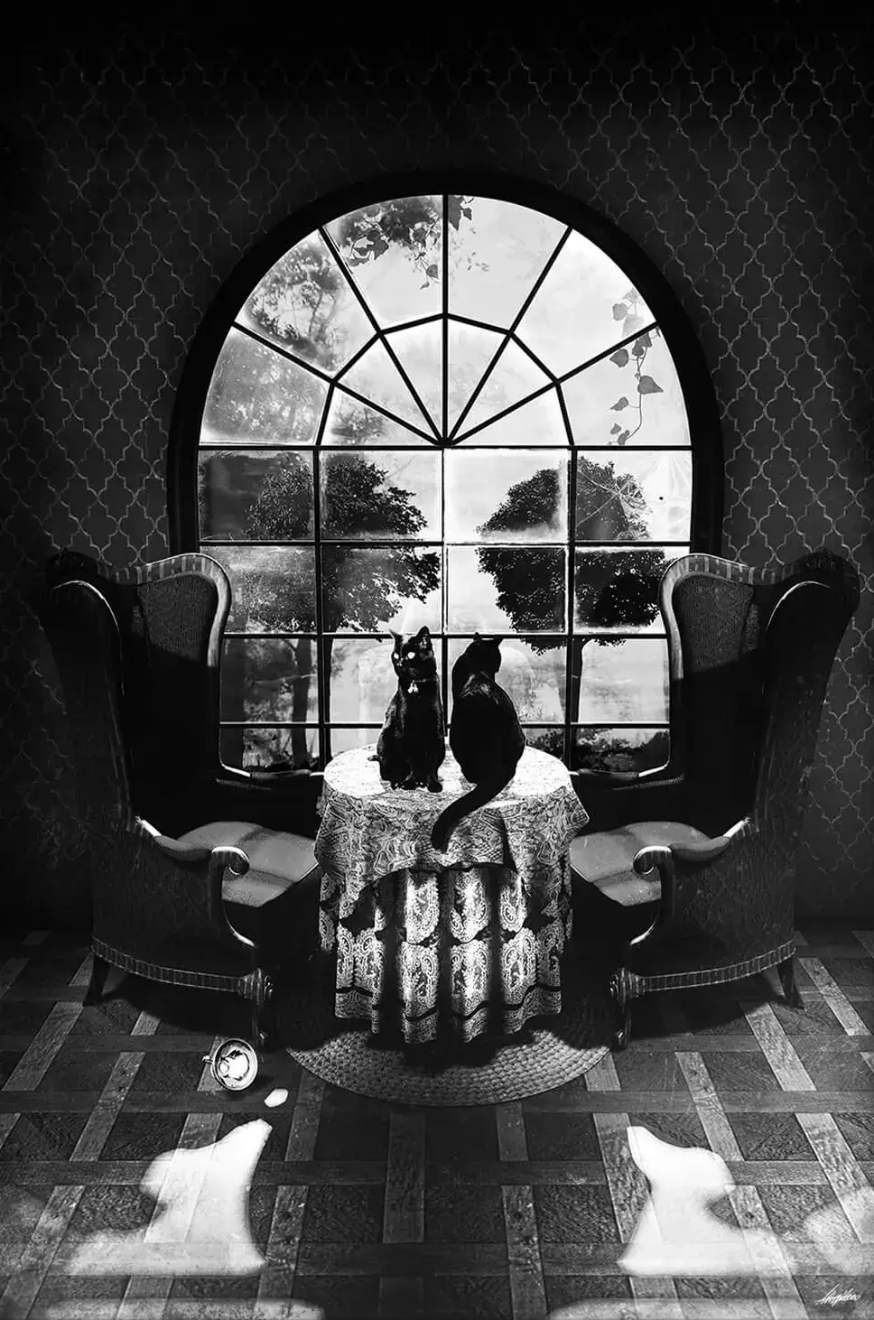 In a cozy nook with a checkerboard floor, a cleverly hidden skull by Ali Gulec sits quietly on a lace-covered table, surrounded by two comfy armchairs. It’s just another lazy afternoon with sunlight streaming through a big window, casting patterns on everything it touches.