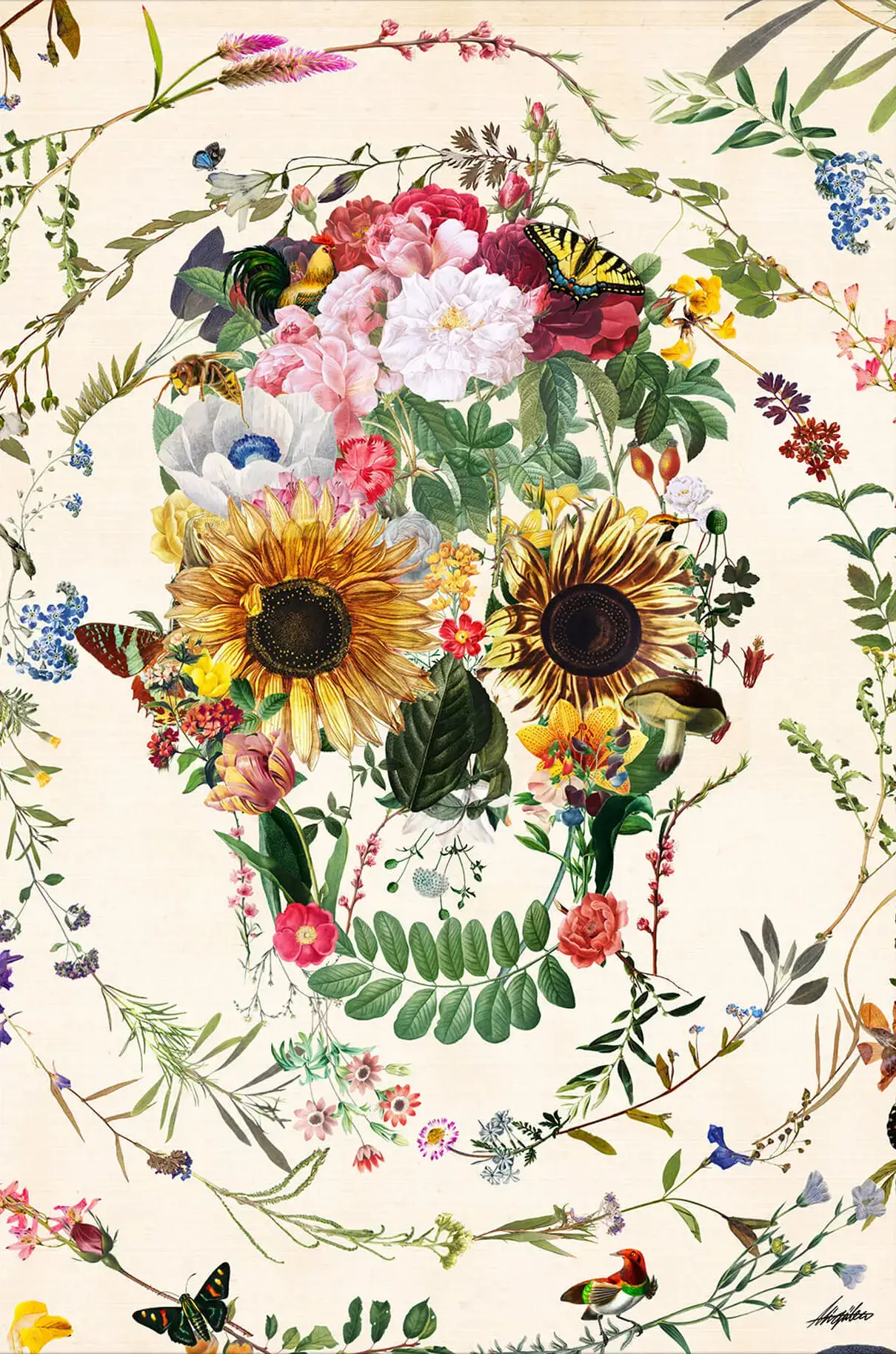 A skull is beautifully formed from a vibrant assortment of flowers and foliage, creating a harmonious composition. Sunflowers make up the eye sockets, while various other blooms, including roses and daisies, define the rest of the skull’s features against a light background. Butterflies and leaves are interspersed throughout, adding a sense of life and movement.