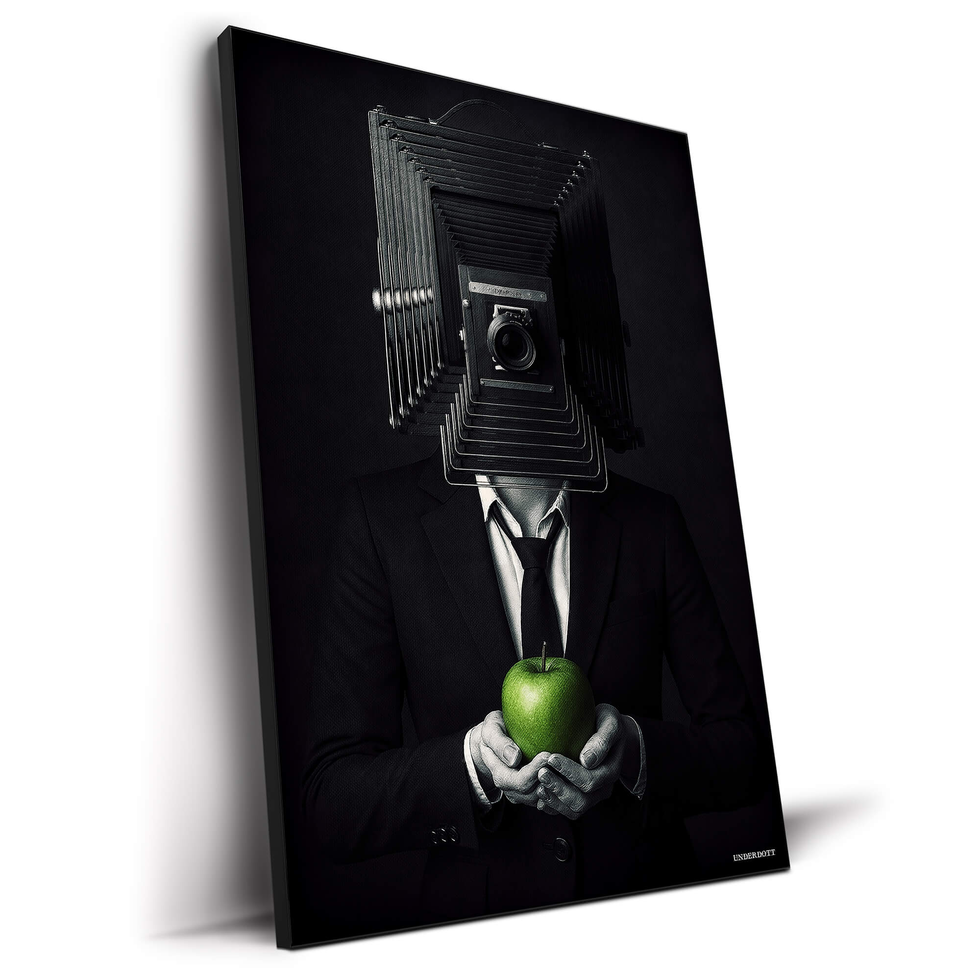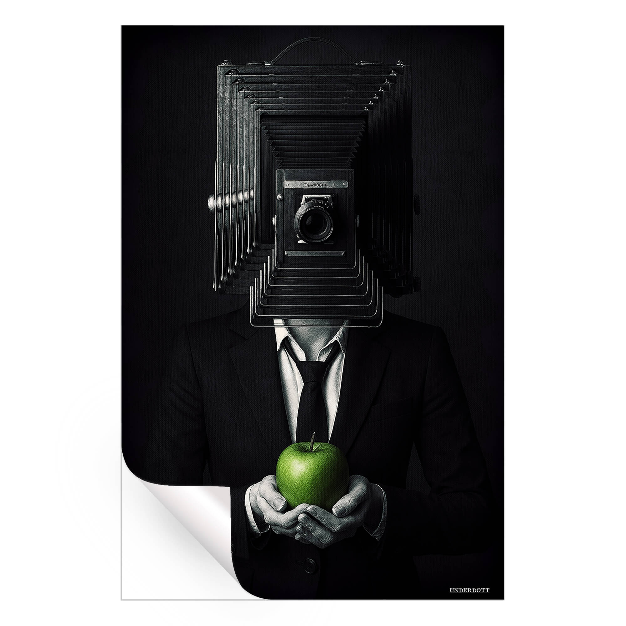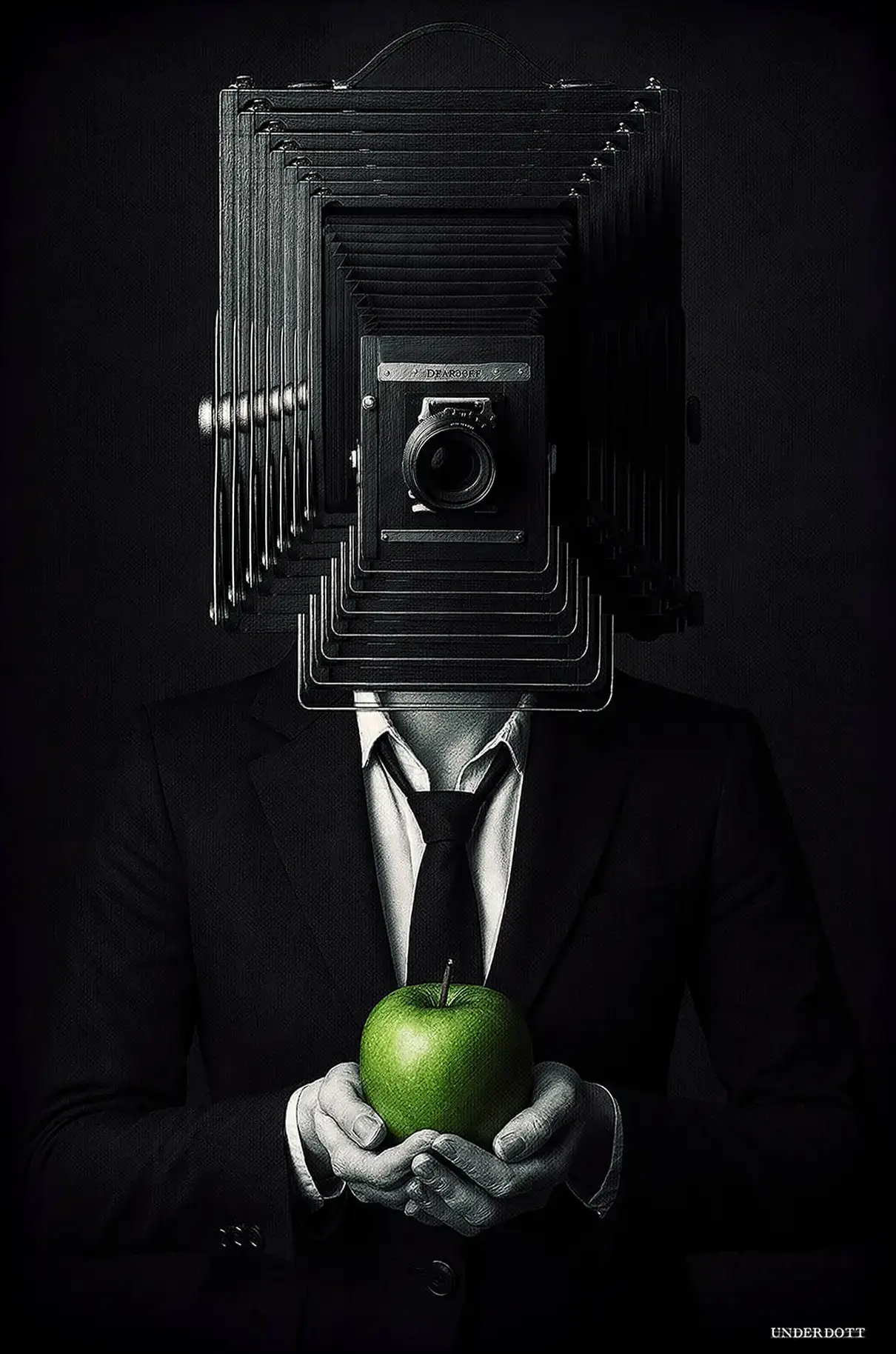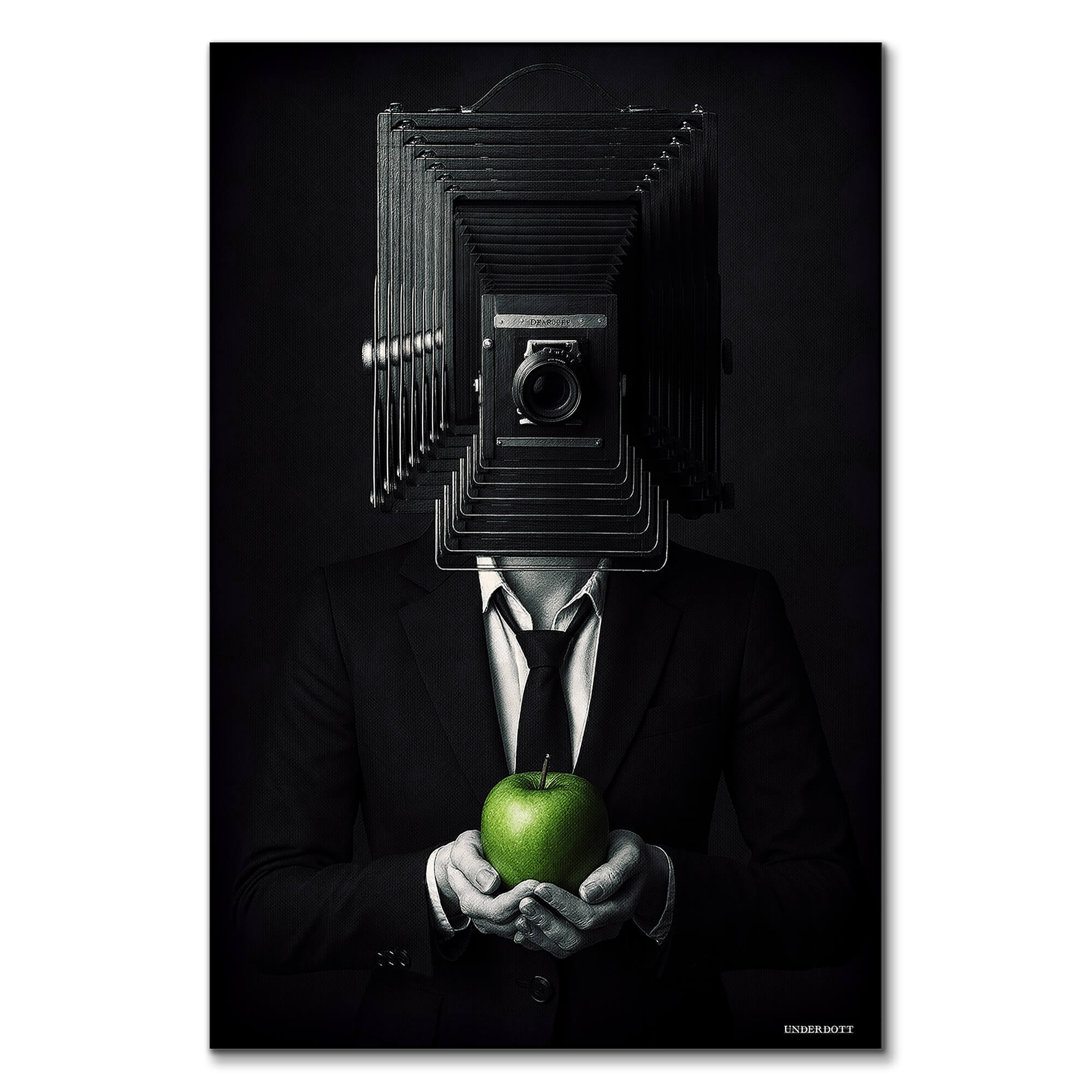 This artwork blends surrealism with dark sophistication. A man in a black suit stands poised against a moody backdrop, his head replaced by the bellows of a vintage camera. In his hands, a green apple glows softly—the only splash of color in the grayscale scene. It’s mysterious, symbolic, and thought-provoking, playing with ideas of identity, perception, and the human lens through which we see the world.