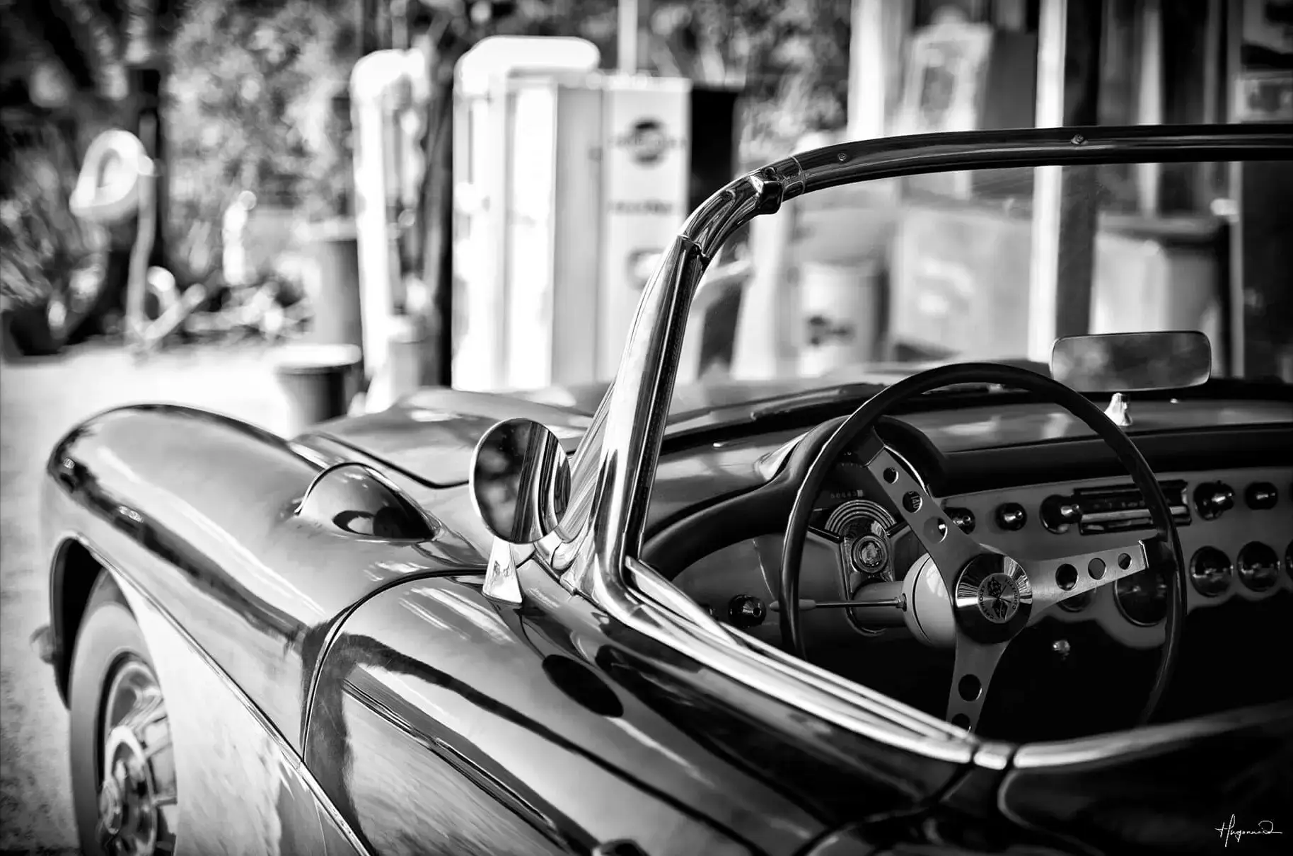 This black and white photograph showcases the sleek lines and polished chrome of a classic Chevrolet Corvette, an emblematic representation of American muscle and automotive innovation.