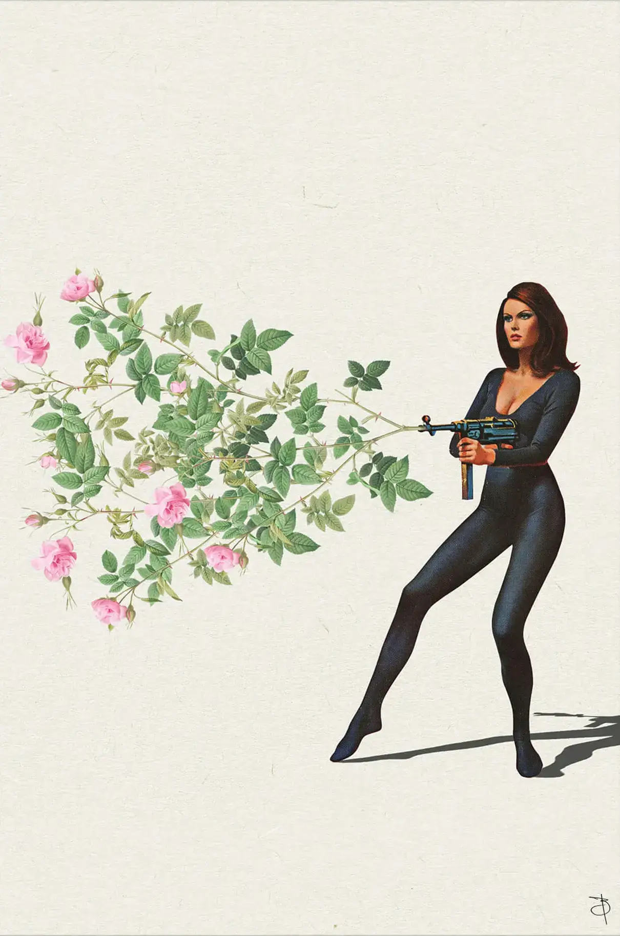 Surreal collage that combines vintage and modern elements. It features a woman dressed in a tight, black bodysuit aiming a gun that bizarrely extends into a flourishing branch of pink roses. The backdrop is plain and textured, giving the artwork a classic feel. The juxtaposition of the weapon and the delicate flowers creates a striking visual contrast.