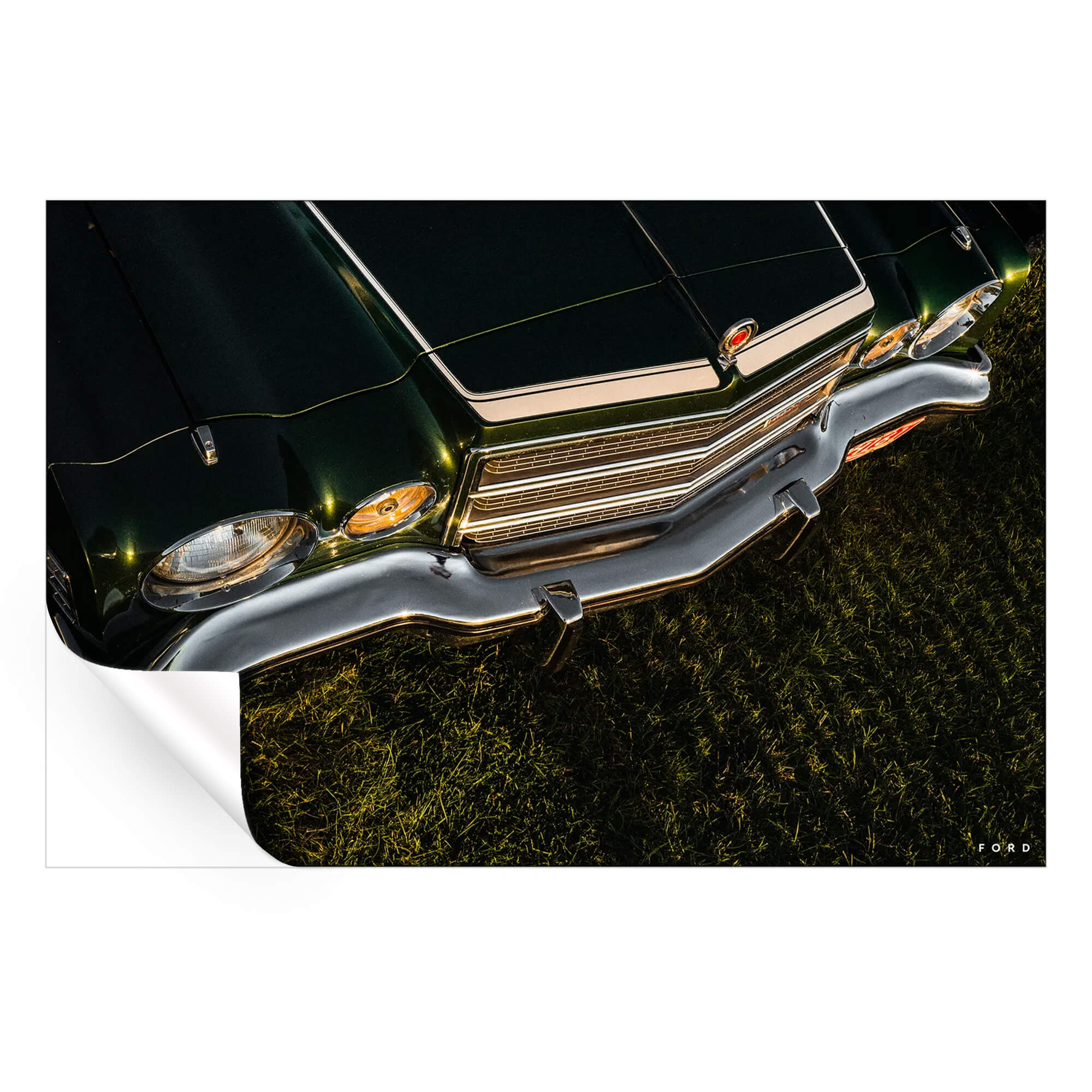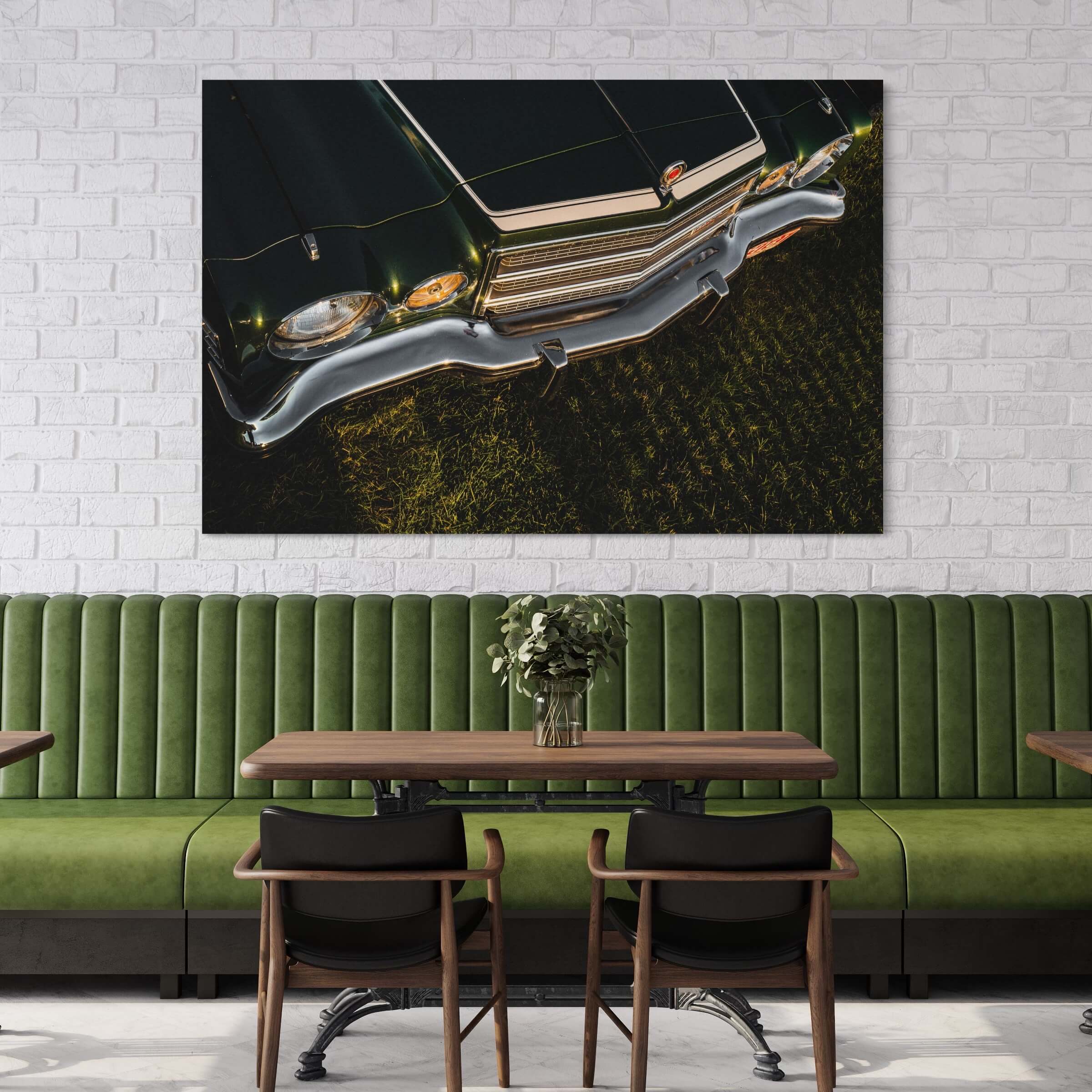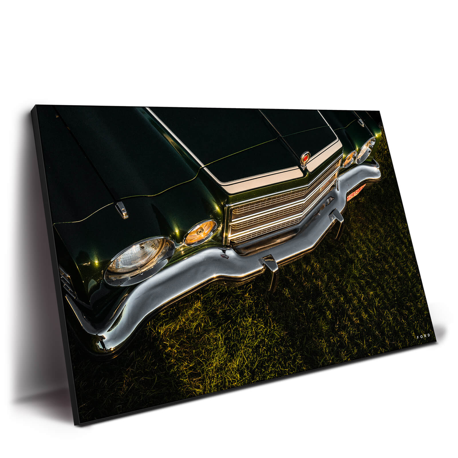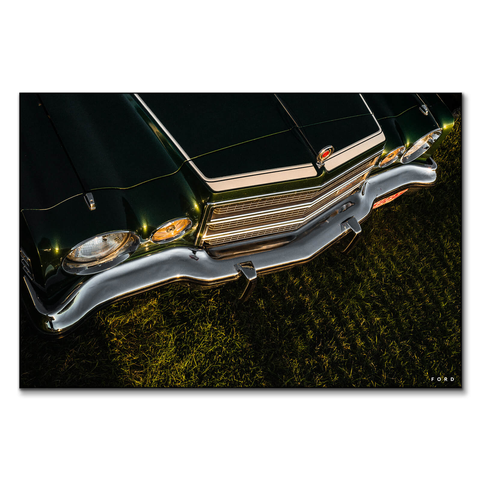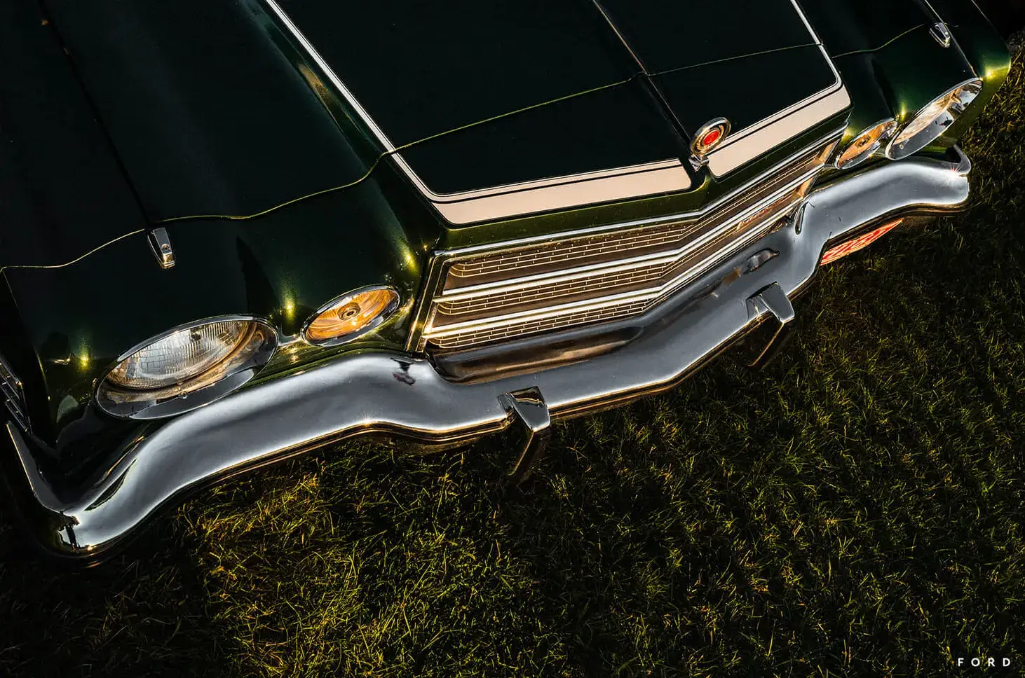 The image captures the front end of a classic car bathed in golden light. The car’s polished dark green body and gleaming chrome accents reflect the sunlight, highlighting its immaculate condition and the elegant design typical of a bygone era. The lush green grass beneath suggests the vehicle is at a car show or parked on a well-kept lawn, ready for admirers to appreciate its vintage charm.