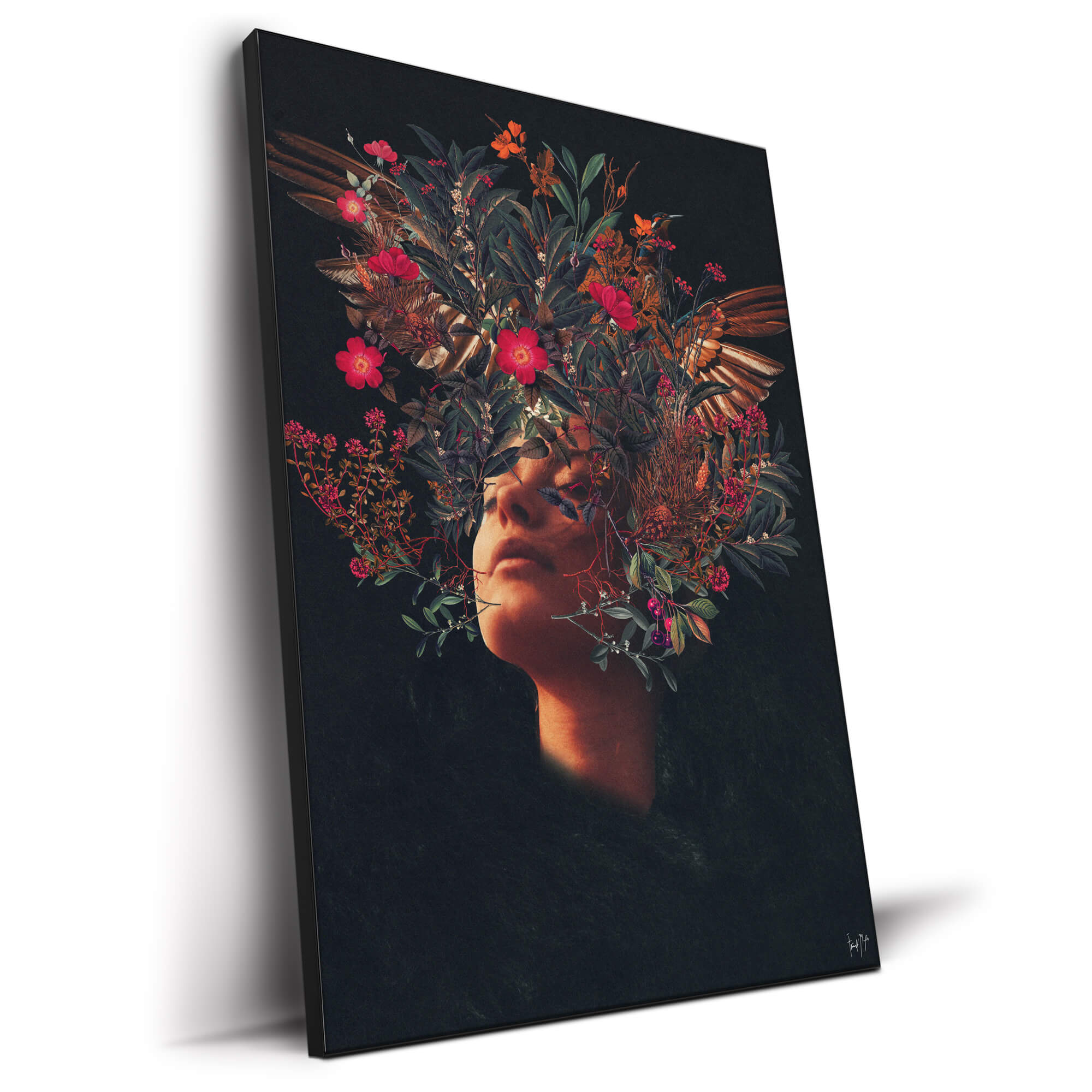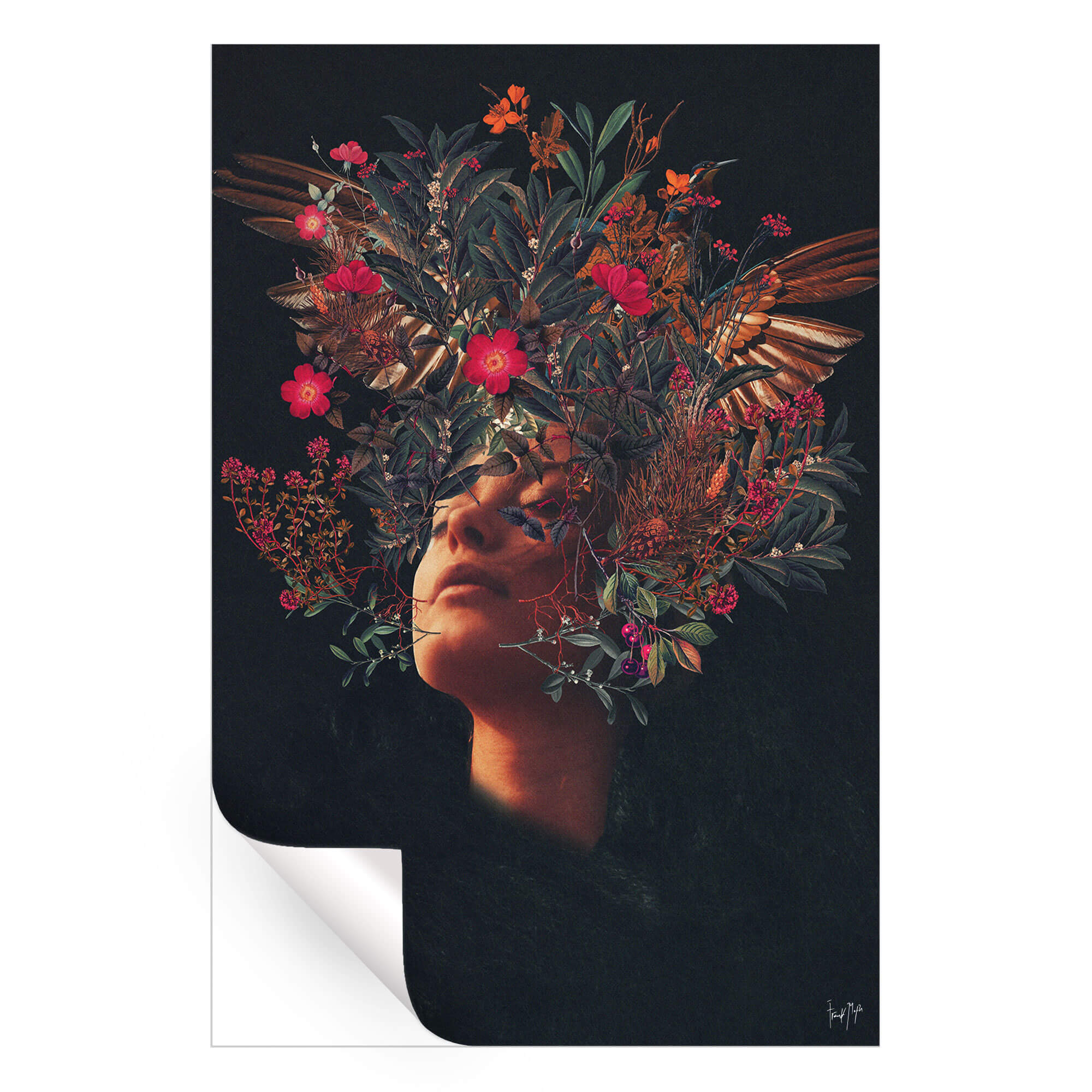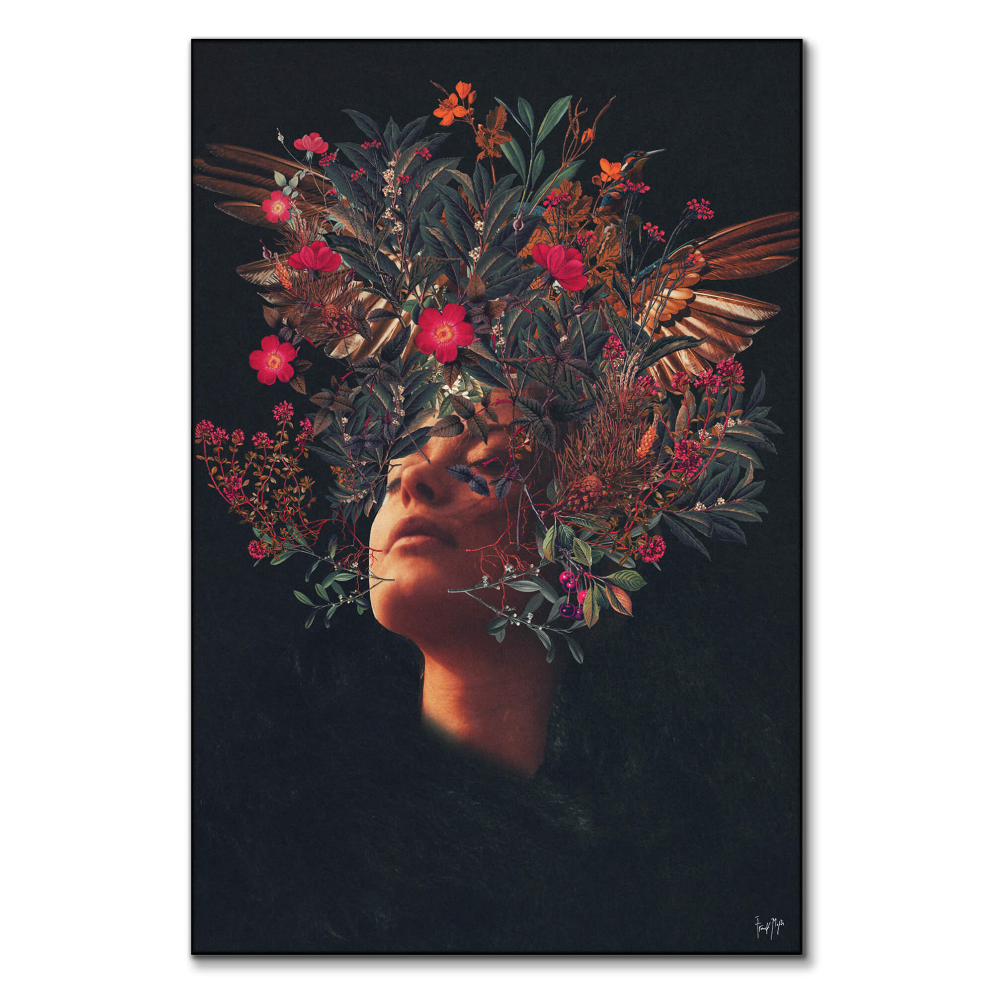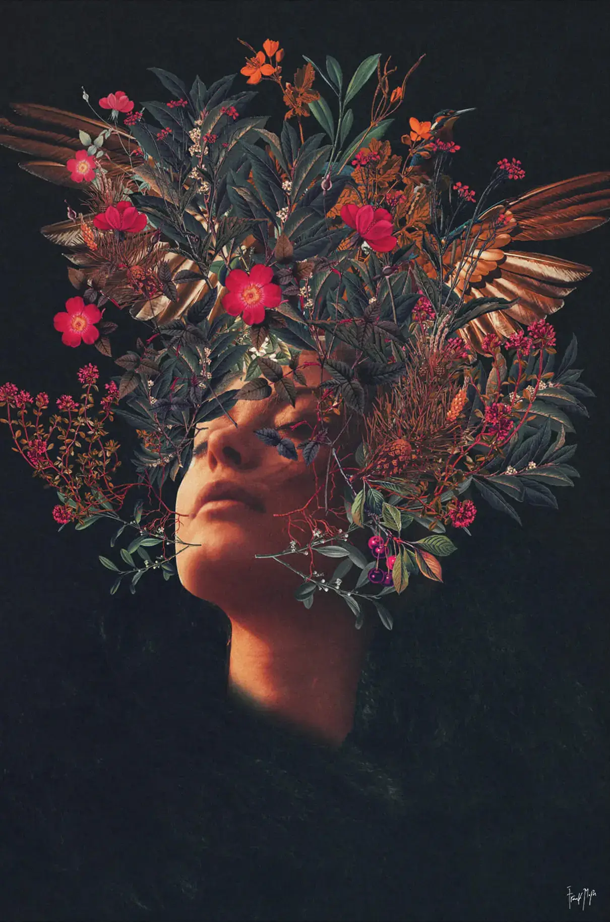 This striking floral composition captures mystery and power. A woman’s face is partly obscured by a flourishing crown of rich red and magenta flowers against a deep, velvety black background. The lighting highlights her serene expression while the intricate petals and leaves radiate texture and depth.