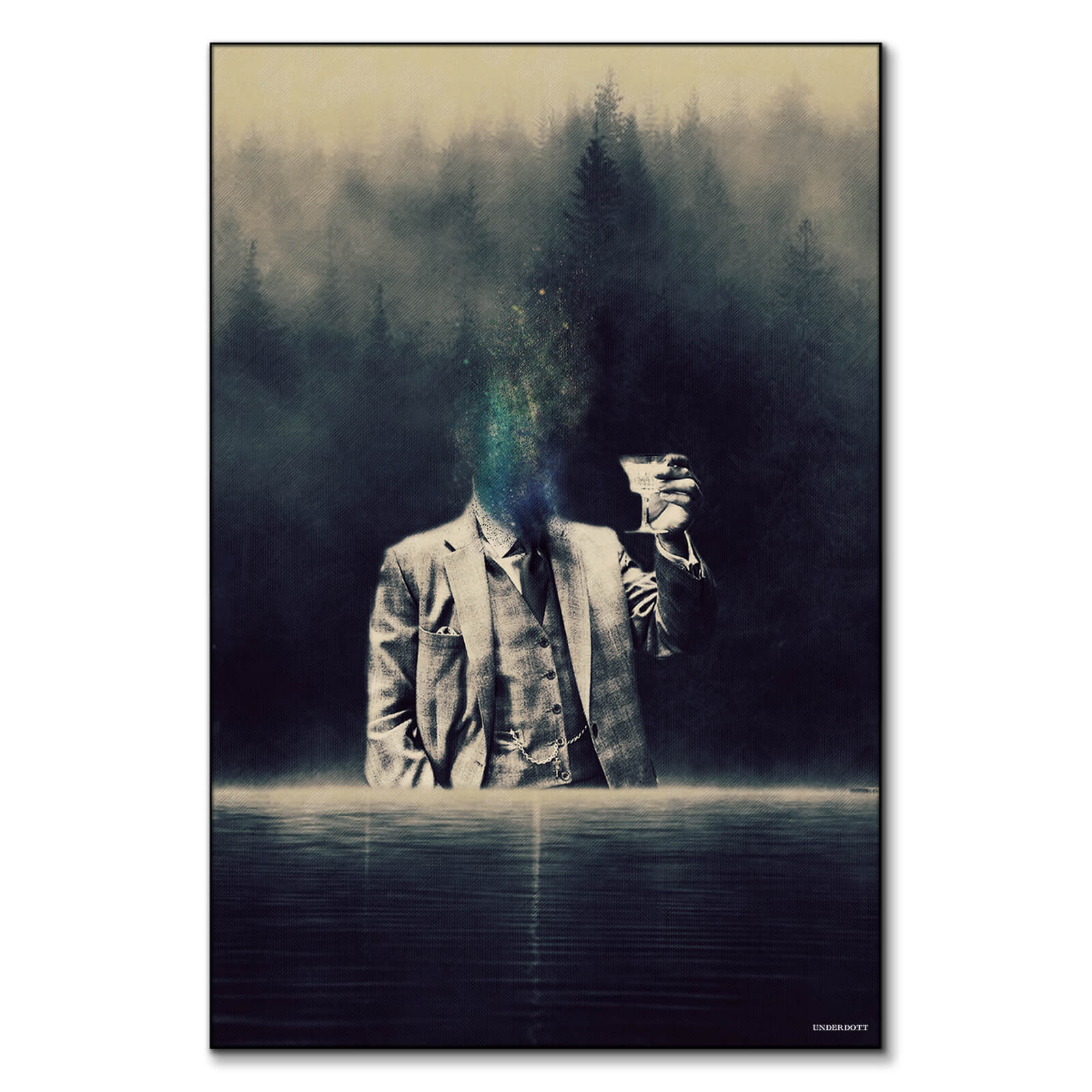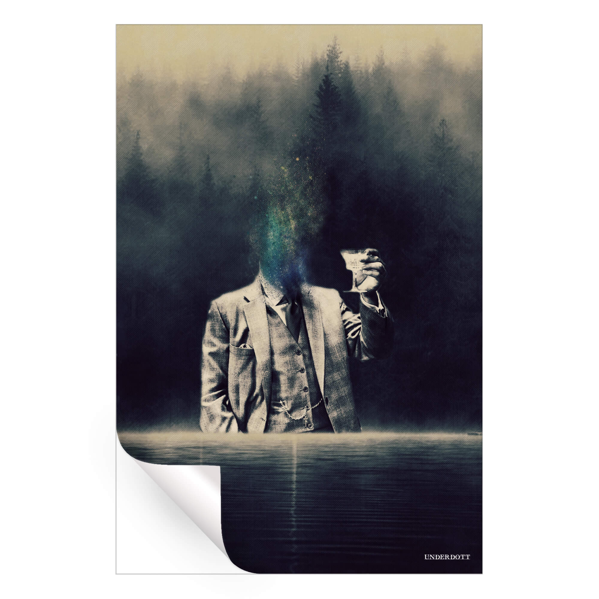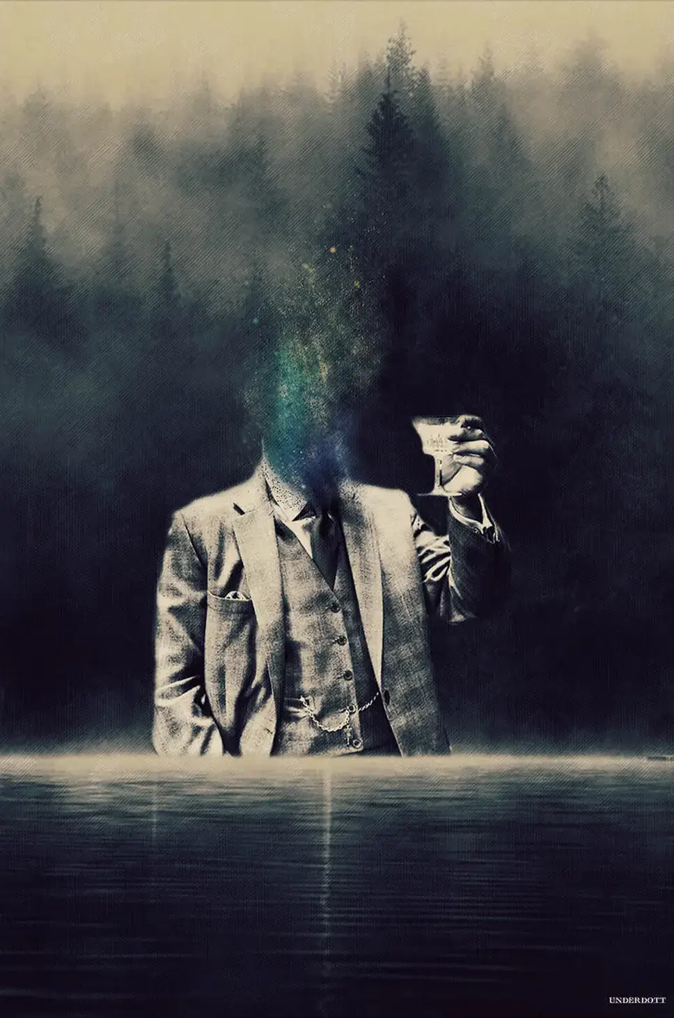 Holding up a transparent glass, the figure is posed mid-toast, its body is rising from a tranquil body of water. The image contains an obfuscating texture that adds to its mystery.