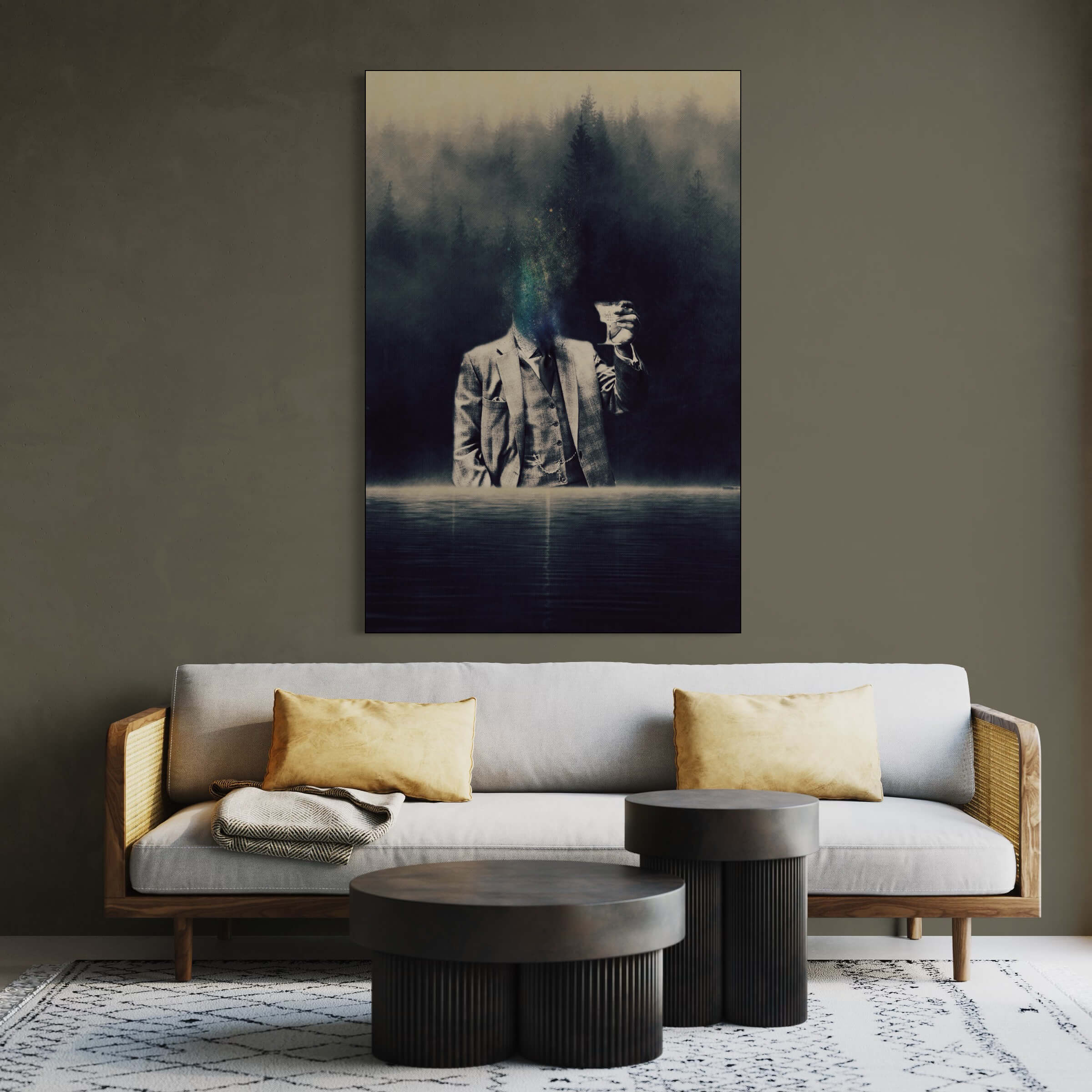 Surreal and atmospheric, a figure in a textured tweed suit stands before a misty forest backdrop. The figure’s head is obscured by a cloud of colorful smoke that billows from its head.