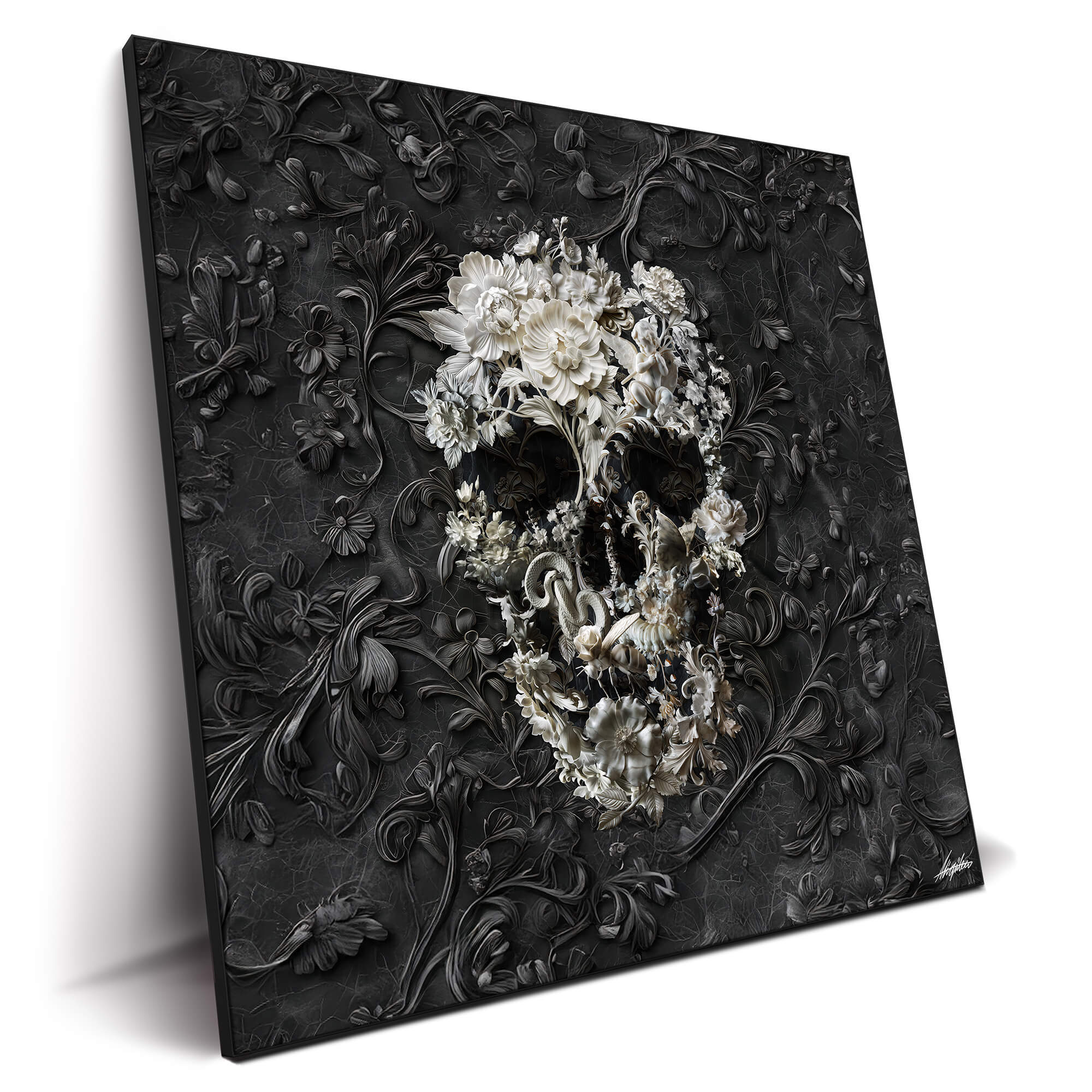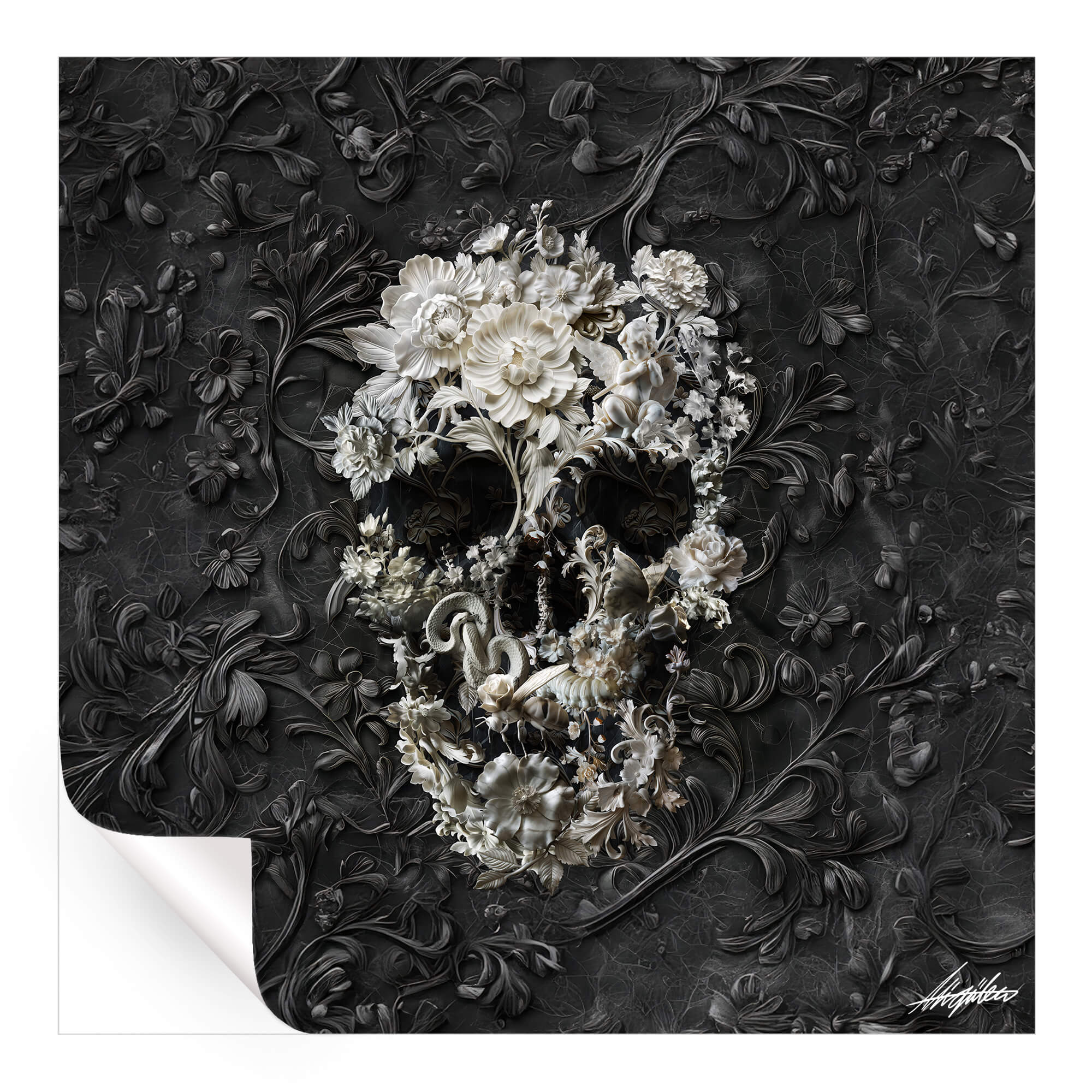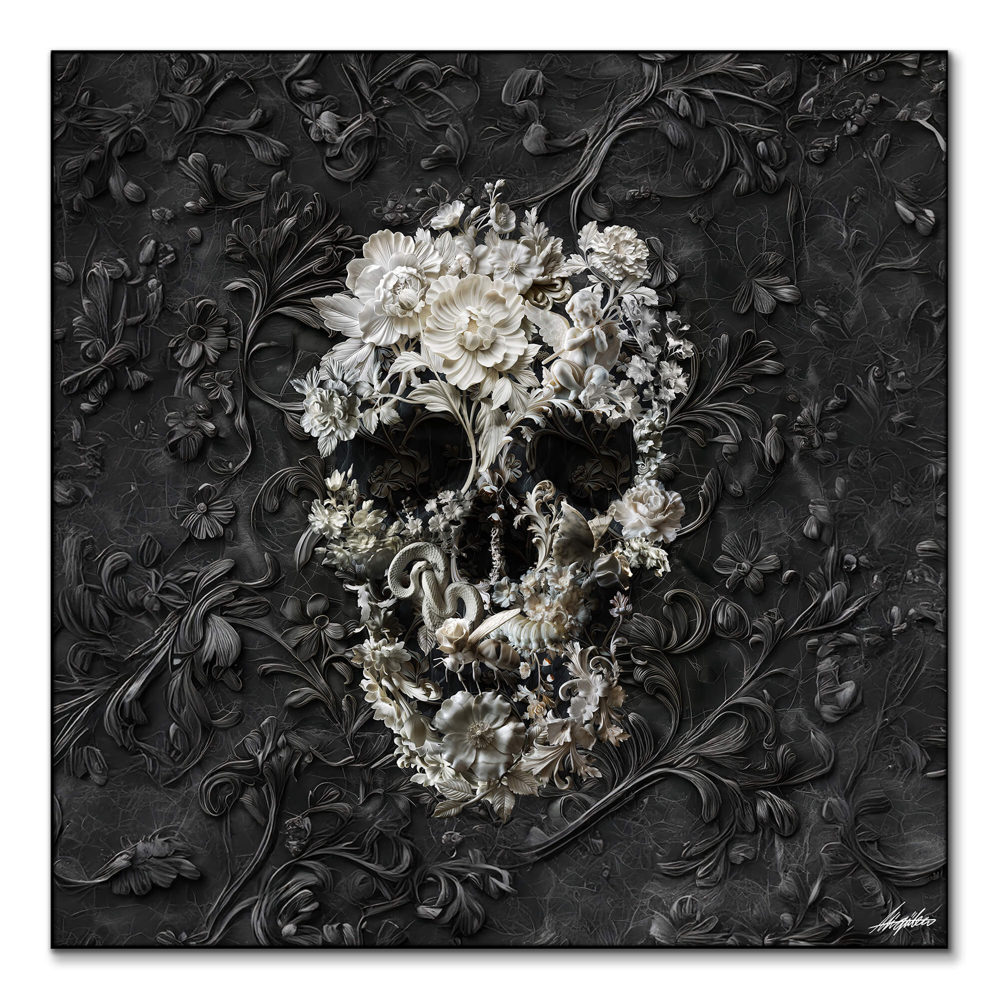 The flower cluster grows outward in perfect symmetry, echoing the square layout of the print. Delicate leaves curl along the temples, adding quiet motion to an otherwise still subject. High-contrast lighting carves sharp highlights on the marble surface, amplifying every ridge of the bone. Each element is precisely centered, creating a graphic impact that works brilliantly in larger sizes such as 60×60 inches. From afar, the design reads as bold iconography; up close, fine line work reveals intricate botanical details. Viewers are invited to linger between the opposites of organic bloom and cold stone.