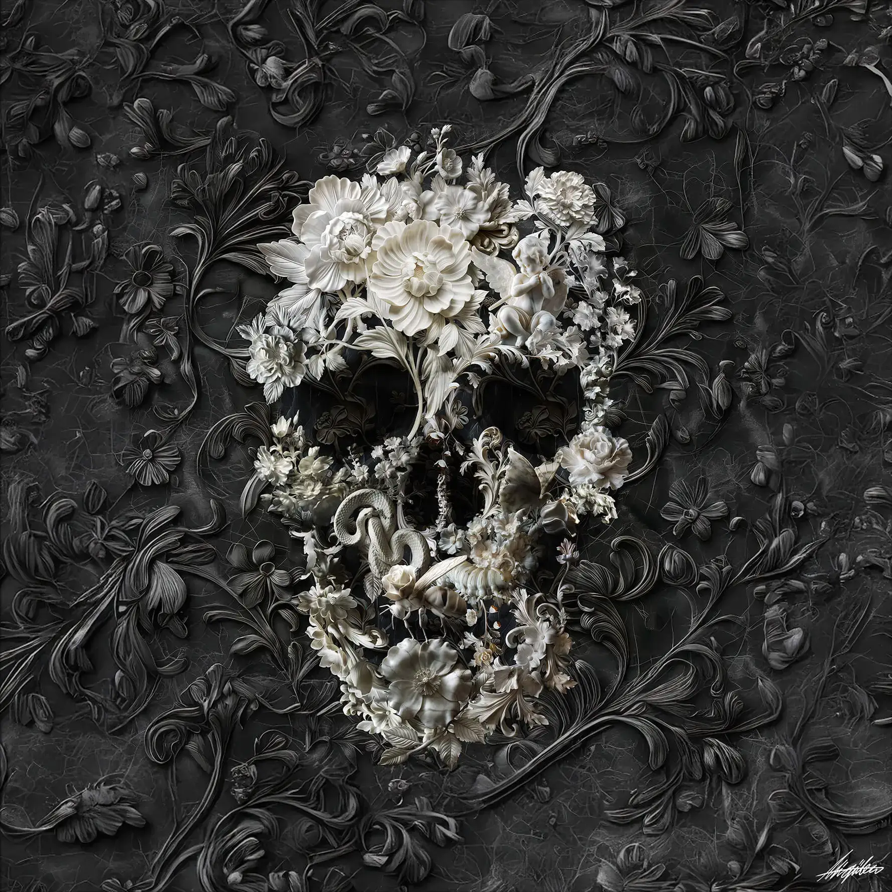 Polished stone veins ripple across a human skull rendered in pure white. Petals unfurl from the eye sockets, their grayscale tones glinting like silver against a deep charcoal background. Tiny cracks and subtle shadows give the bone realistic depth while the flowers feel almost soft enough to touch. Drips of ink stream downward, blurring the boundary between sculpture and painting. Negative space surrounds the form, letting the imagery breathe and placing full focus on the strange beauty of life sprouting from death. This surreal composition balances elegance with defiance, making the image at once haunting and peaceful.
