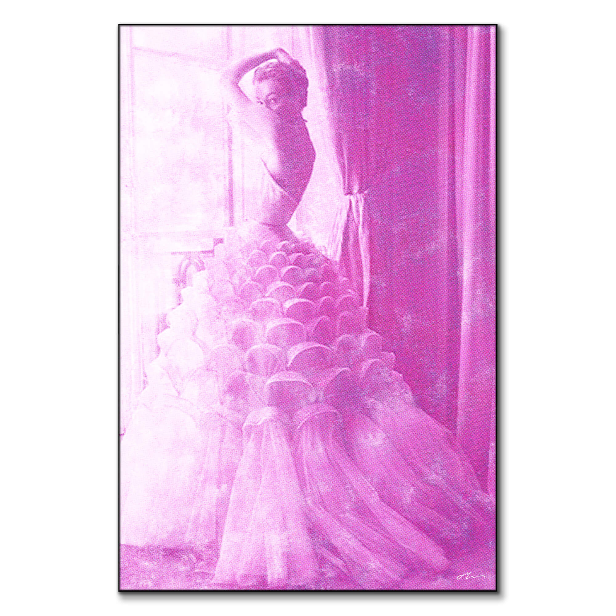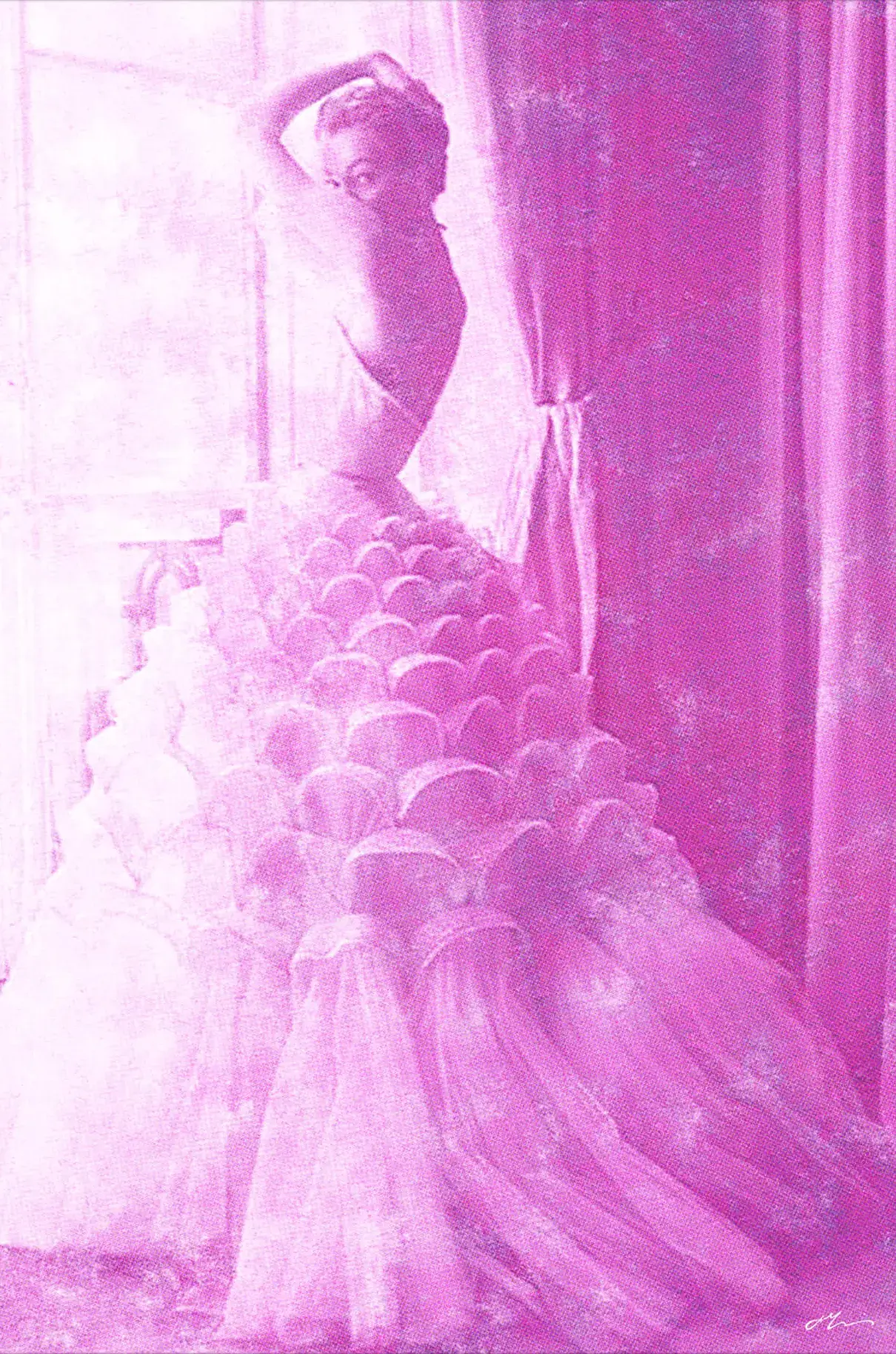 The monochromatic lavender hue of the image adds to its timeless allure, while the texture and worn edges suggest a photograph steeped in history.