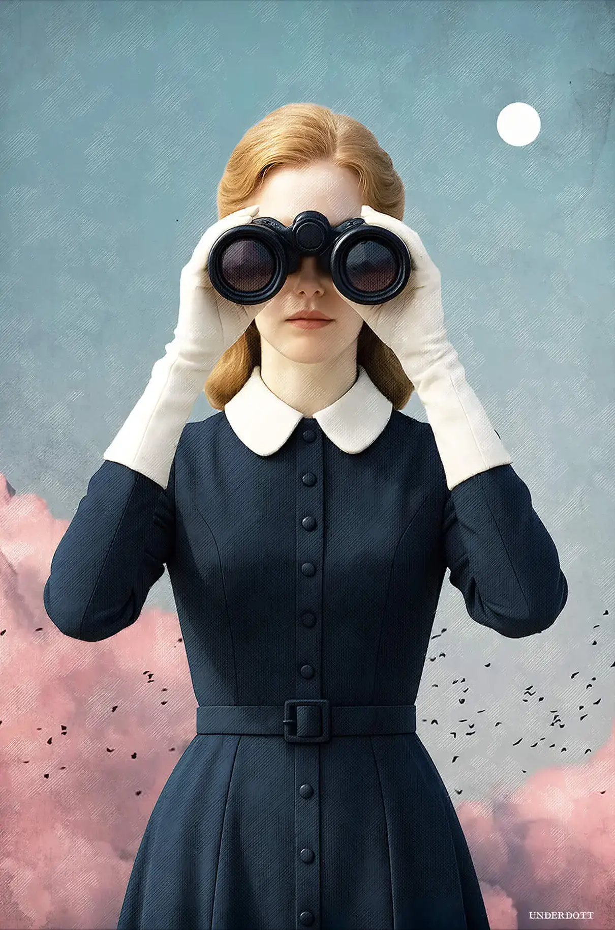 This image captures a sense of curiosity and quiet wonder. A woman in a navy dress and white gloves gazes through binoculars, her expression calm and focused as clouds and birds drift behind her. The soft pastel tones and vintage styling make the piece feel cinematic—like a still from a dream or an old film.