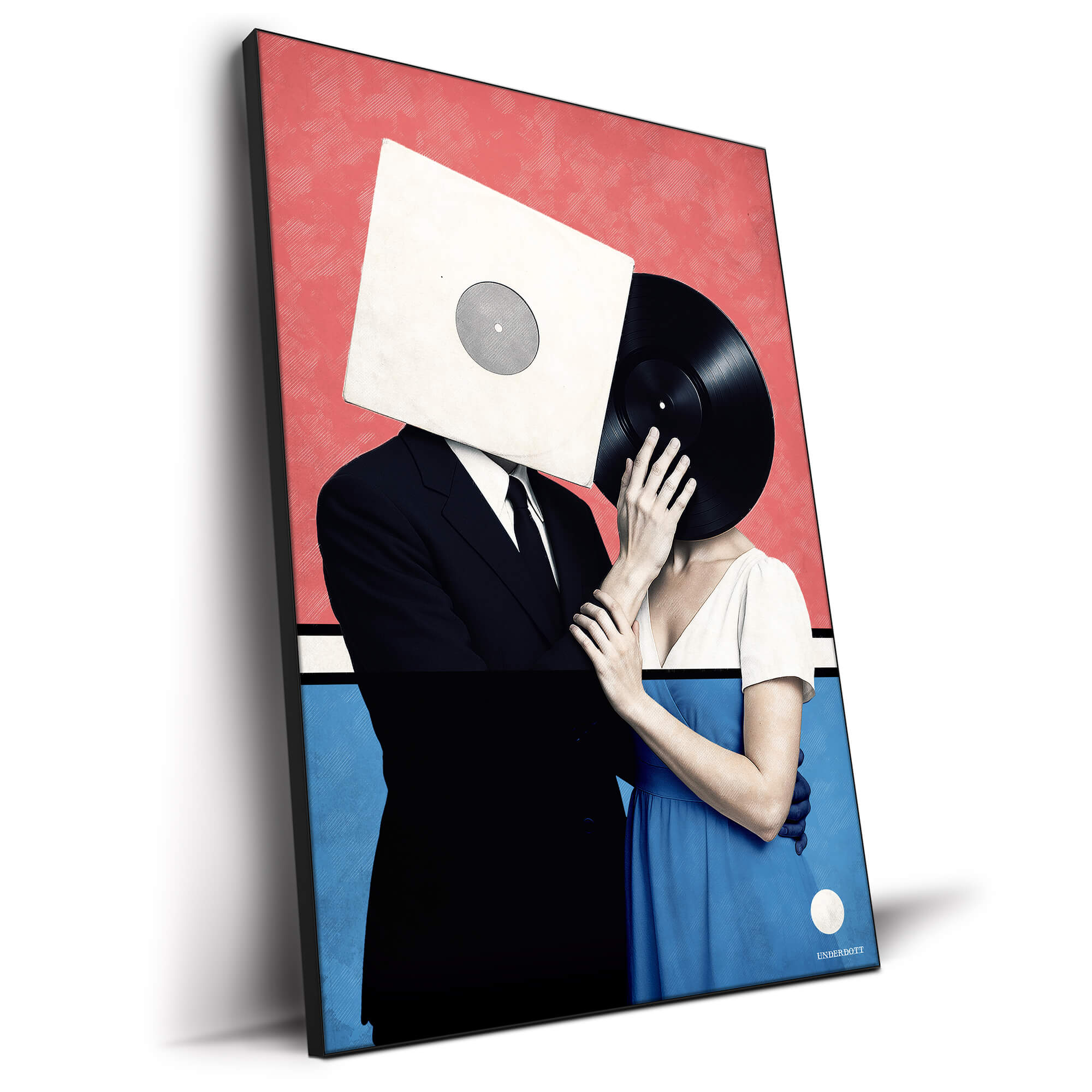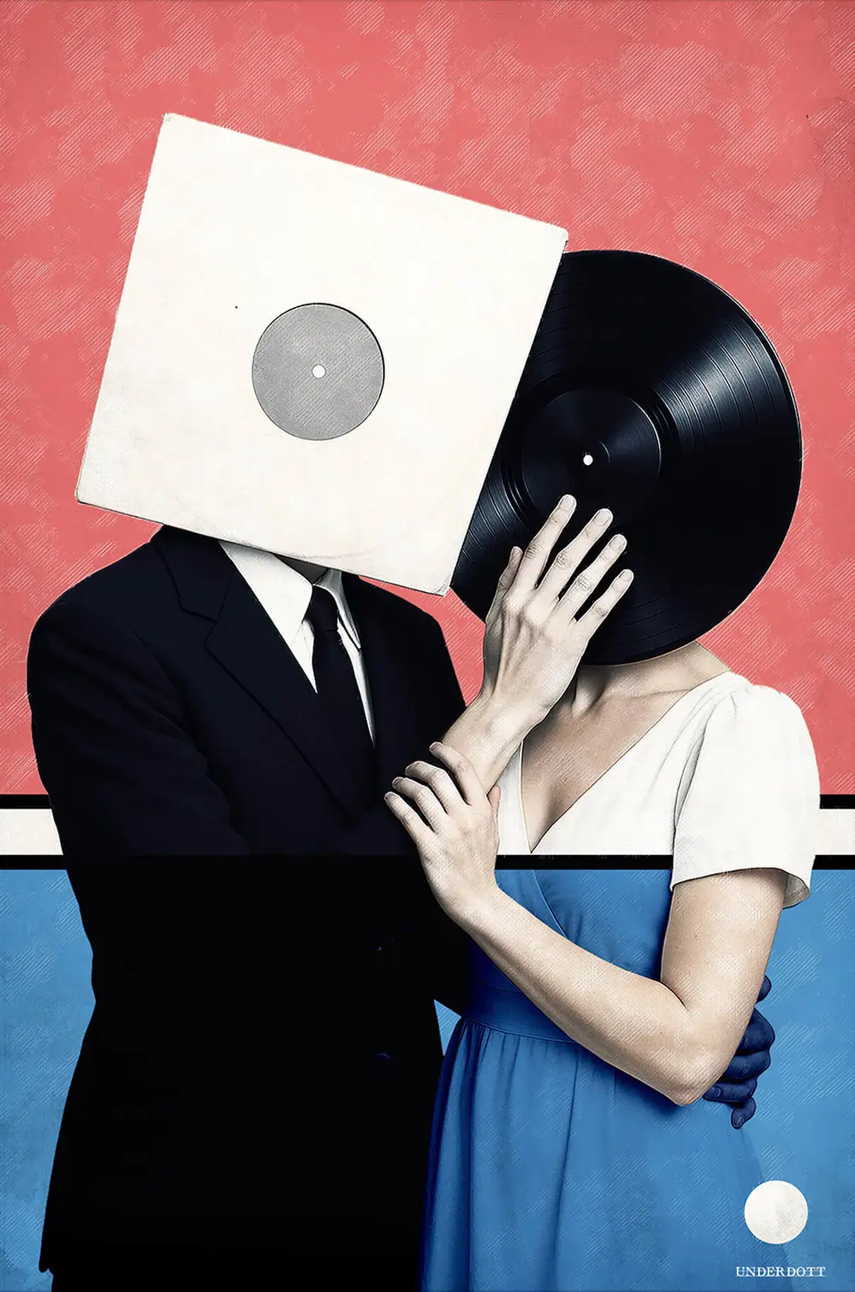 This artwork turns nostalgia into a visual love story. A couple stands embraced, their heads replaced by a vinyl record and its sleeve, frozen mid-kiss. The contrasting red and blue background divides the composition with bold simplicity, while the monochrome figures add a timeless cinematic quality.