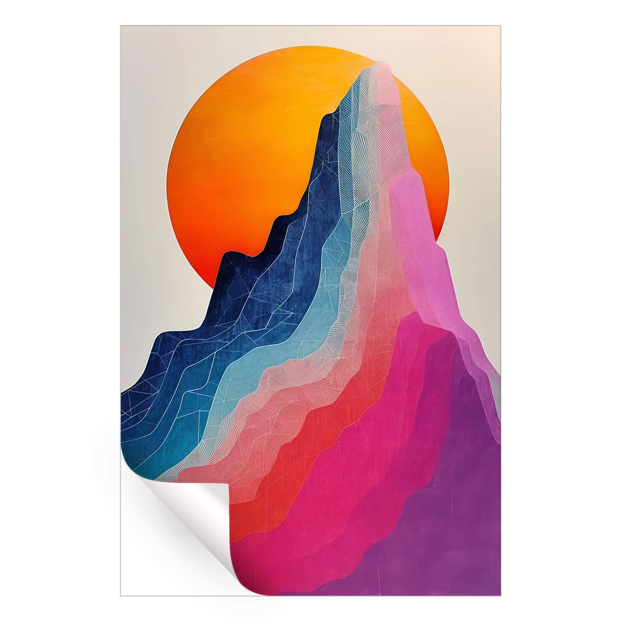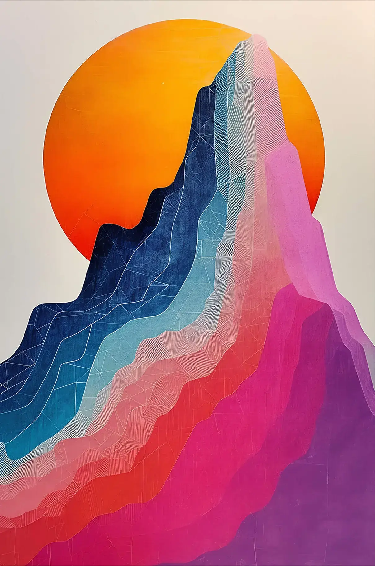 This vibrant composition captures the essence of a towering mountain bathed in the glow of a rising sun. Layered hues of deep blues, soft pastels, and rich pinks create a mesmerizing gradient that mimics the natural beauty of shifting light. The delicate line work woven through each layer adds depth and movement, blending geometric precision with organic flow.