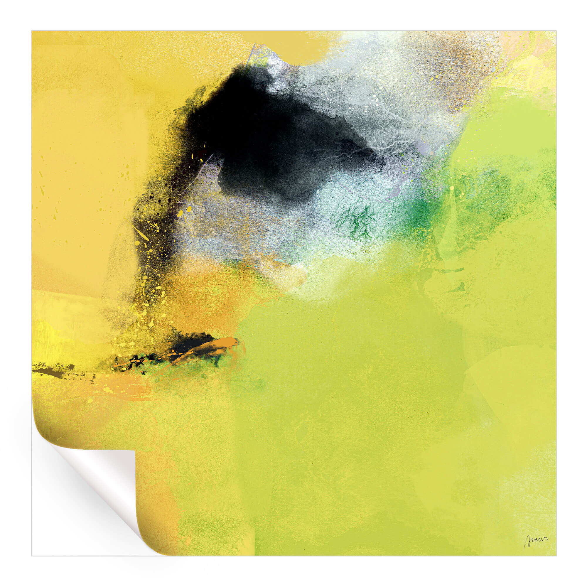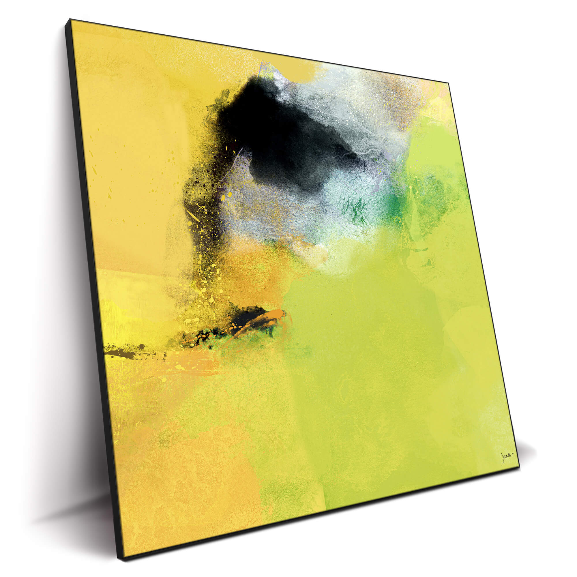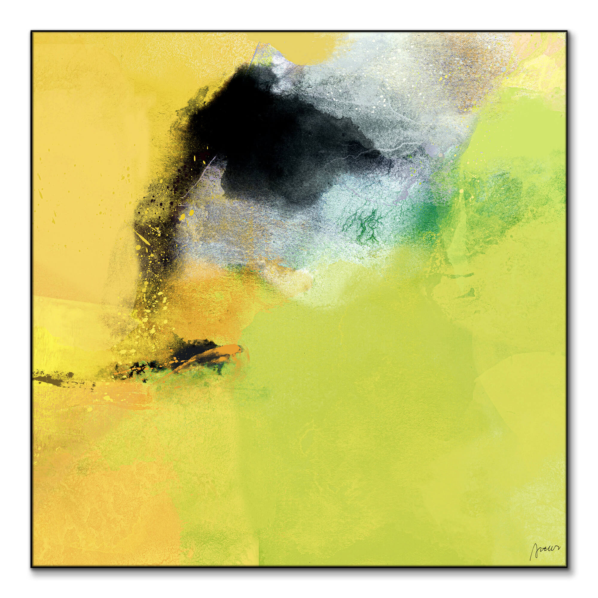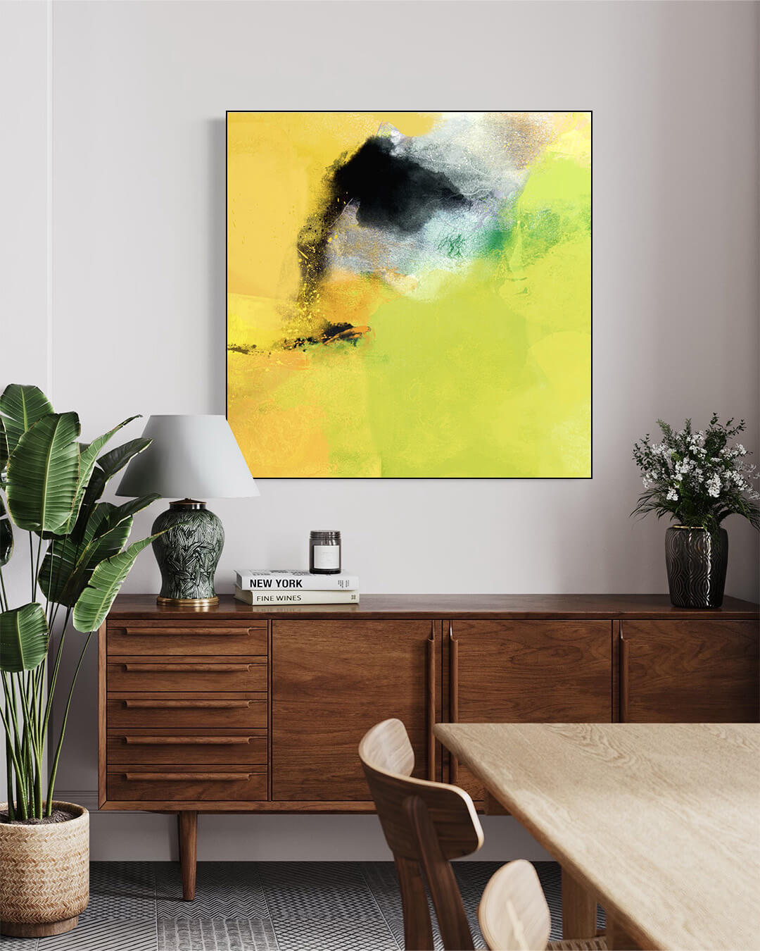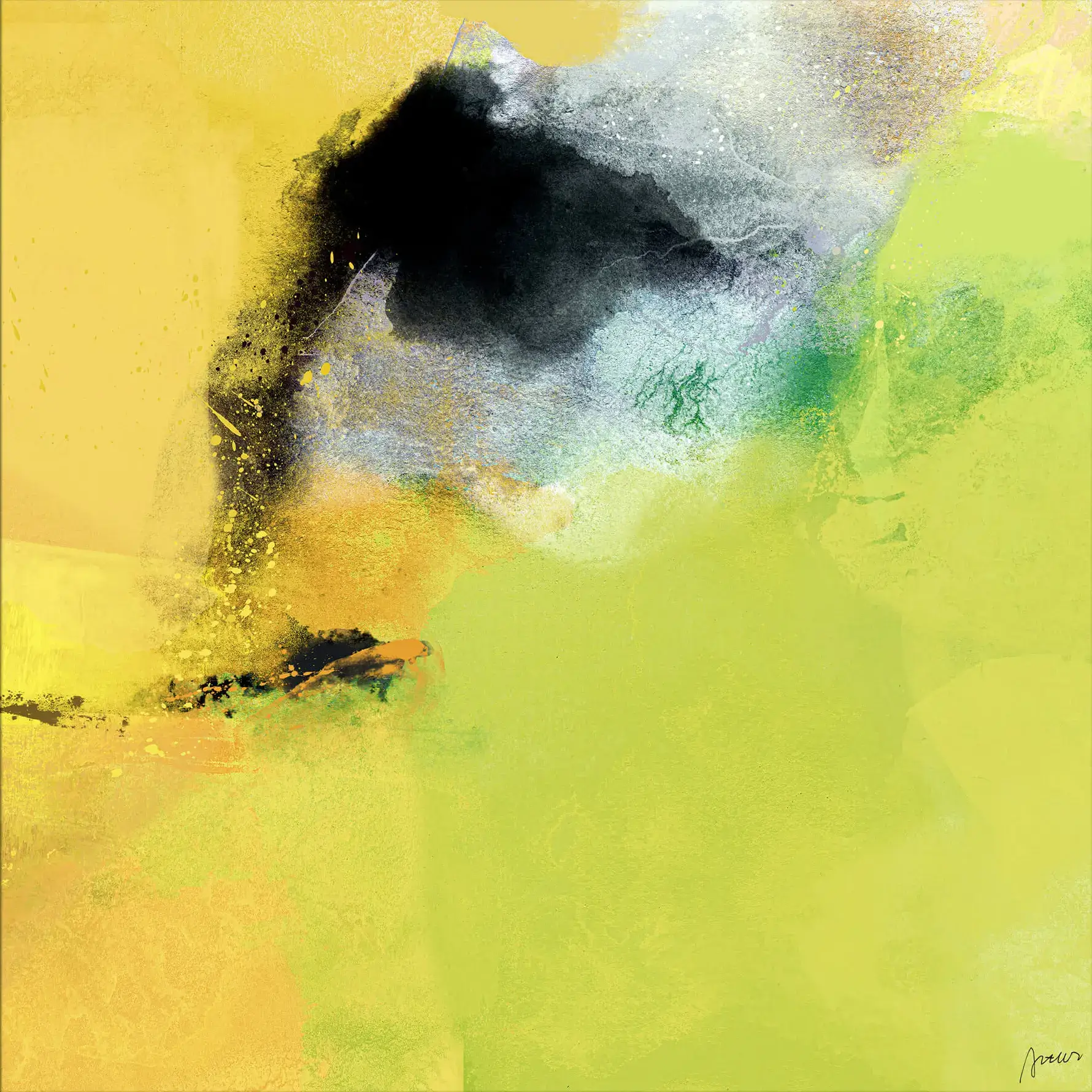 A burst of sunny yellow encompasses the space, as if the morning sun itself has graced the scene. Amidst the light, a tumultuous cloud of black and gray broods and churns, captured at the height of its power. Specks of white and hints of greenery peek through, reminiscent of a landscape touched by the light and shadow.