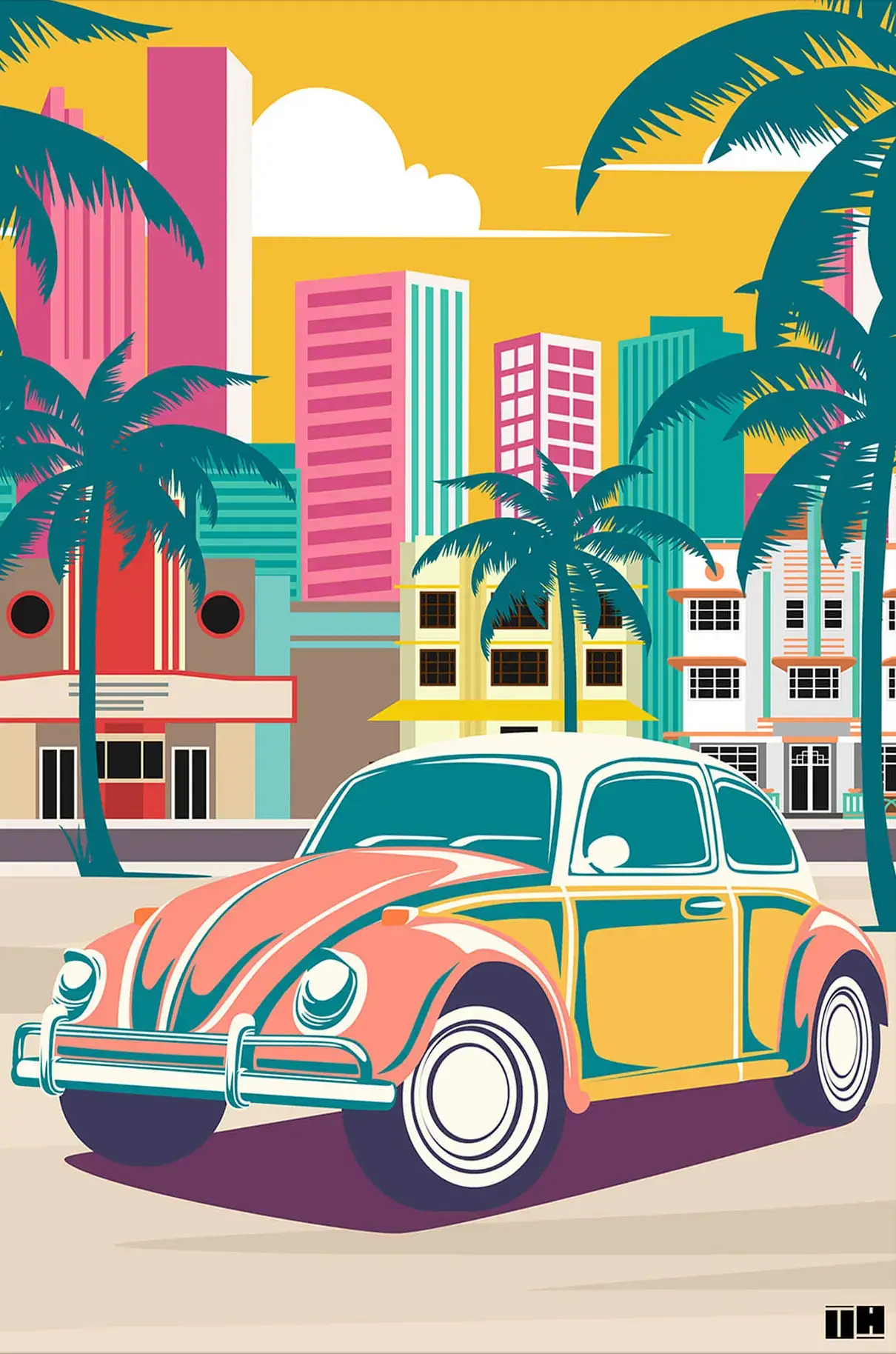 Created by Unfilter Art, the work blends bright hues, bold characters, and a love for music culture that defines the studio’s Indie style. The artist’s signature saturated gradients and cartoon-clean linework are instantly recognizable, aligning this piece with other oversized pop art wall art in the collection. Unfilter Art often pays homage to vintage cars and palm-lined streets, making Bold in the 305 a perfect snapshot of that ongoing theme.