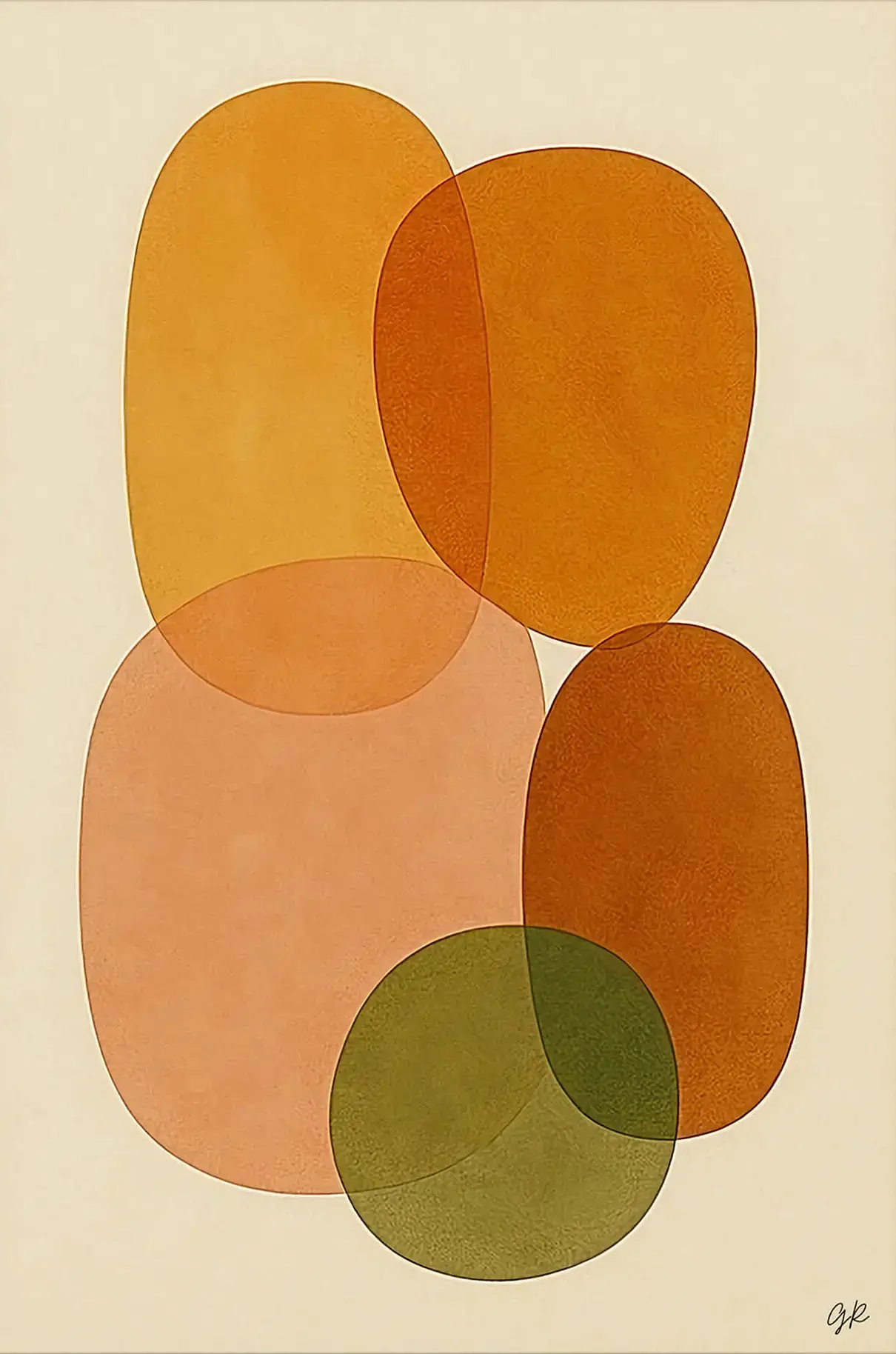 This piece is a study in color harmony and balance. Overlapping organic shapes in warm orange, amber, and soft rose tones create a layered composition that feels fluid and modern. The subtle texture gives each form a tactile depth, while the addition of muted green adds grounding contrast.