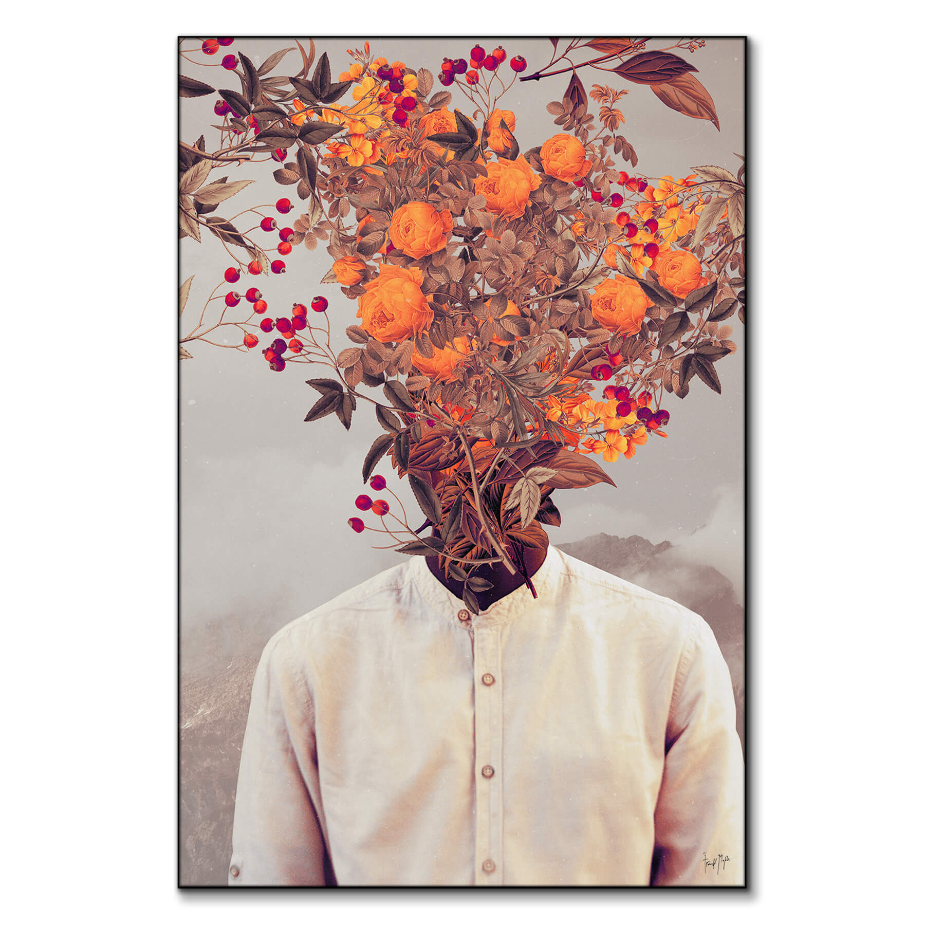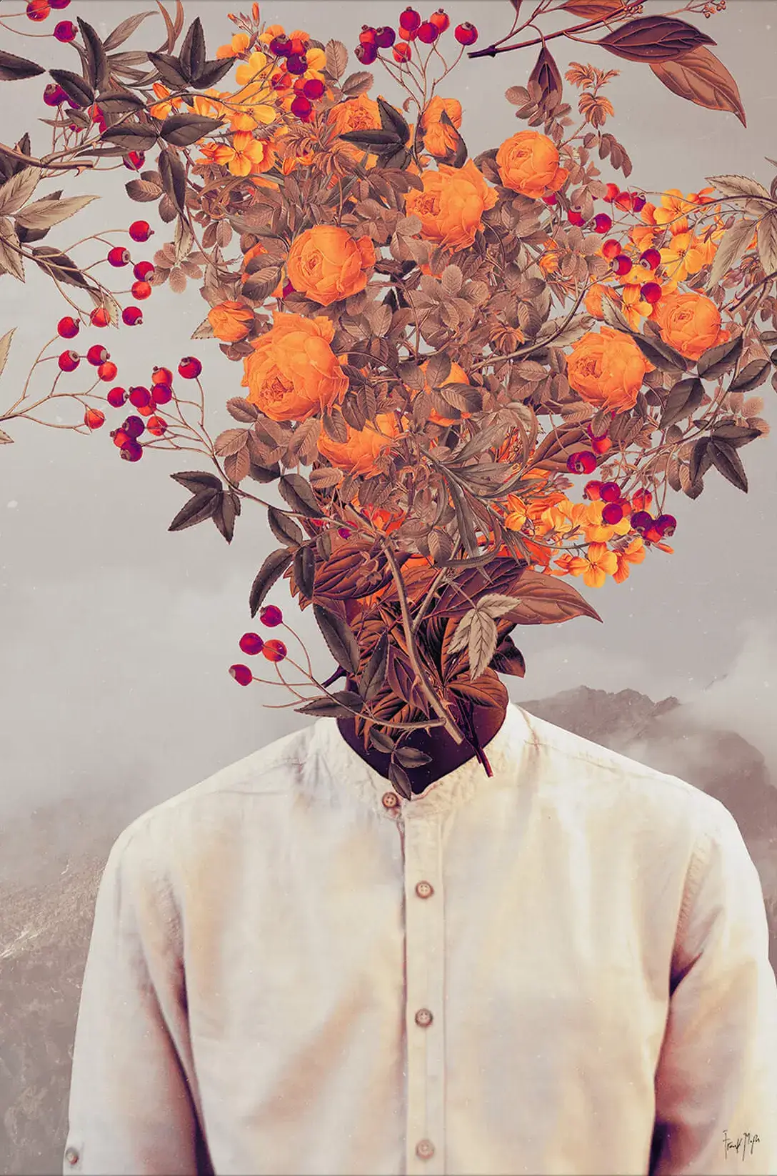 This striking surrealist composition replaces a man’s head with a lush arrangement of orange roses, crimson berries, and golden leaves. Set against a misty neutral background, the vivid florals seem to pulse with warmth and life. The crisp shirt and natural hues ground the fantastical imagery, making it both powerful and approachable.