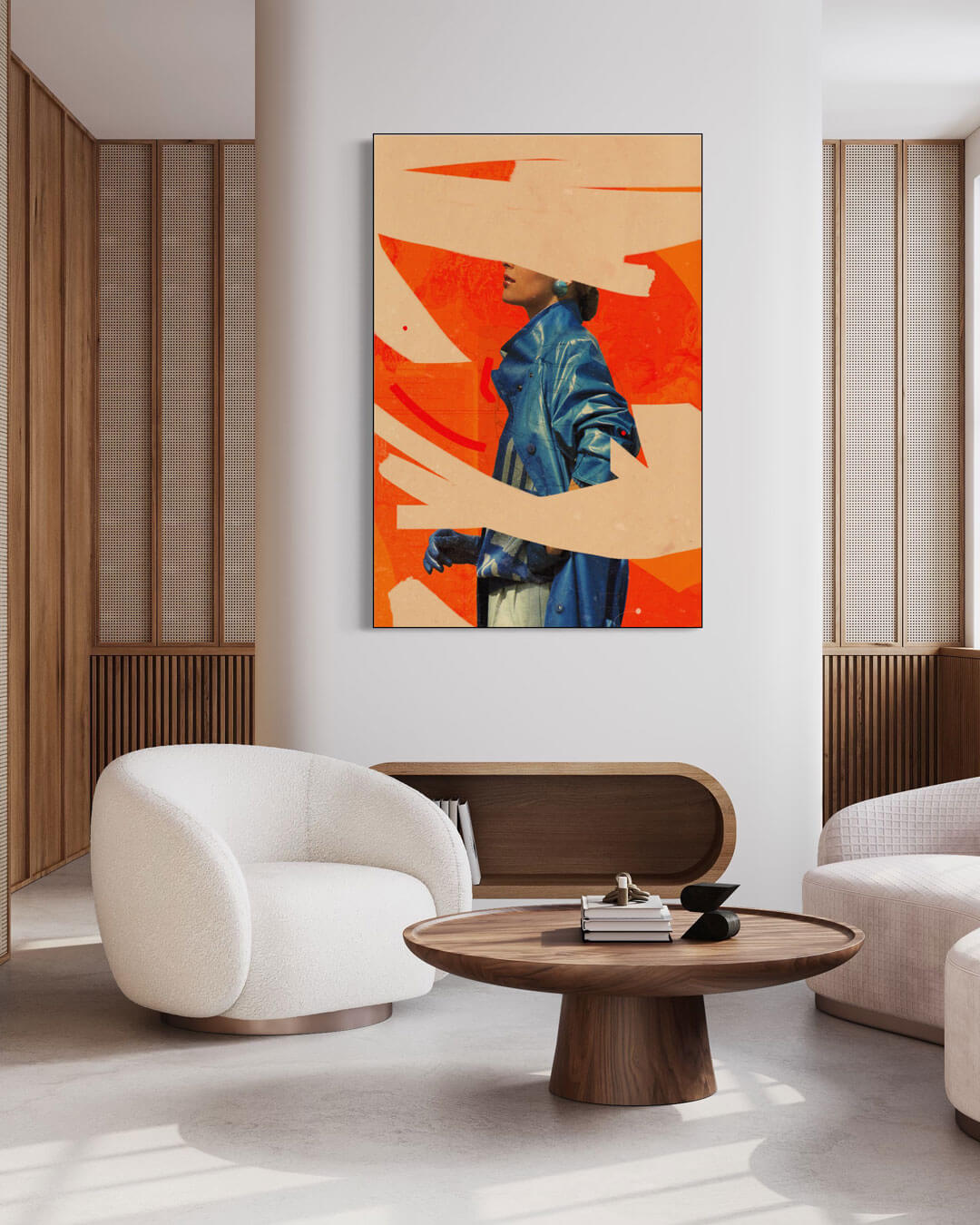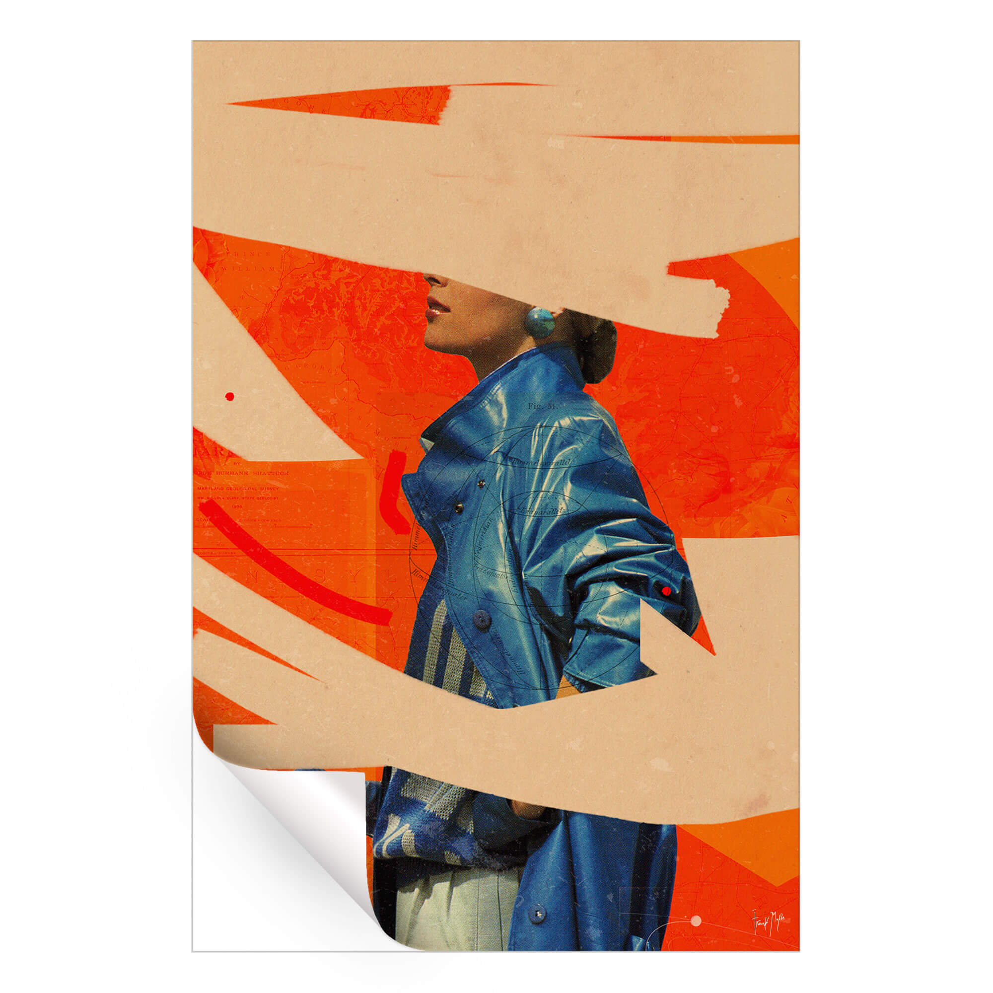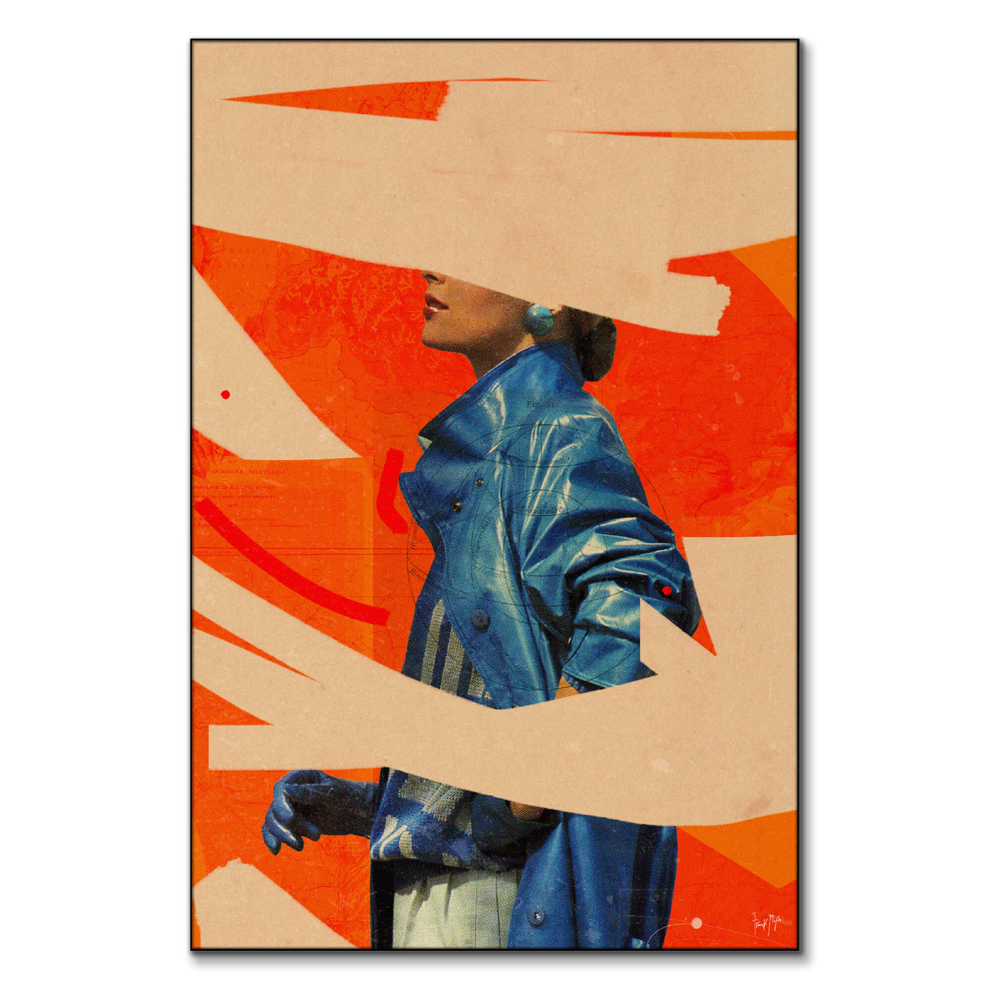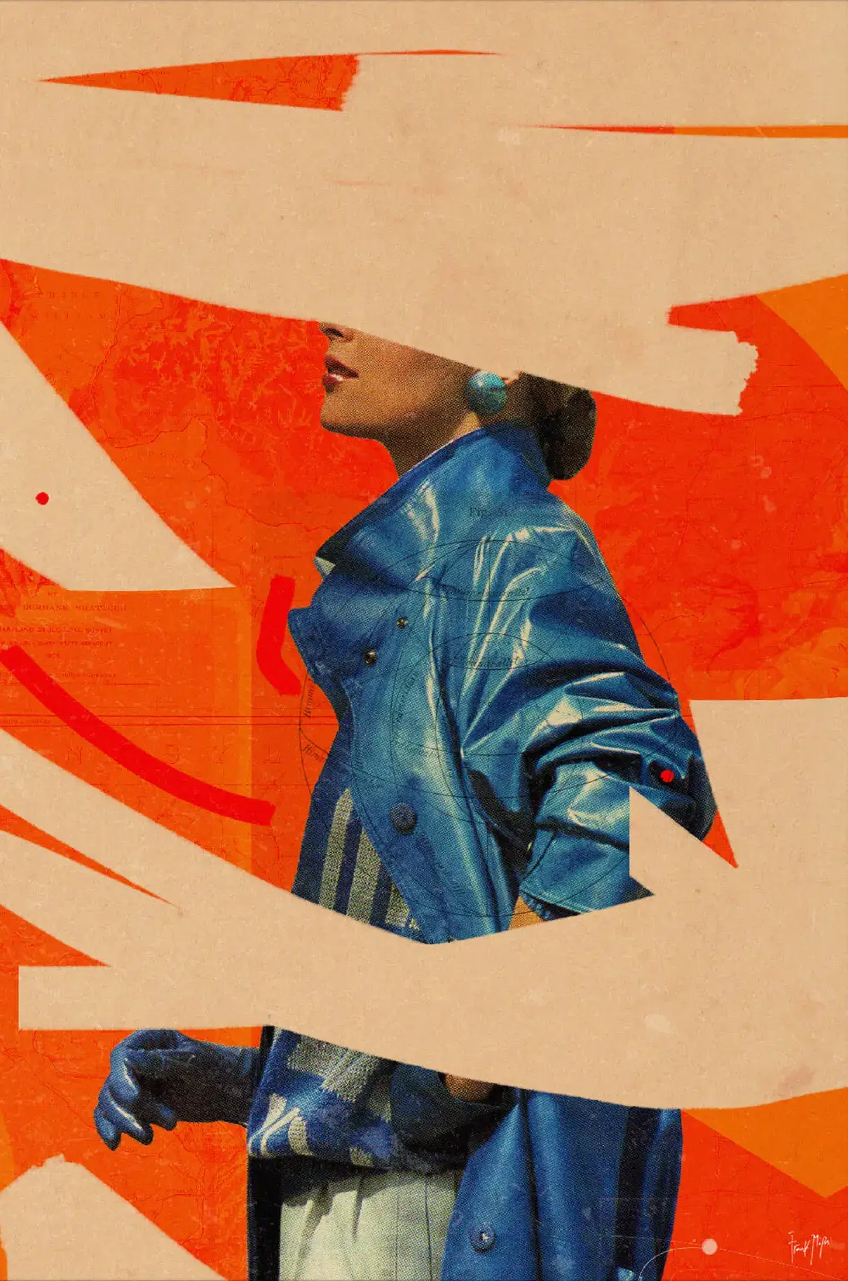 This bold collage plays with abstraction and fashion to create a striking visual moment. A woman in a blue coat is set against a field of bright orange, her face partially obscured by sweeping brushstrokes that feel spontaneous and deliberate at once. The contrast between texture and color gives the image a raw, editorial energy.