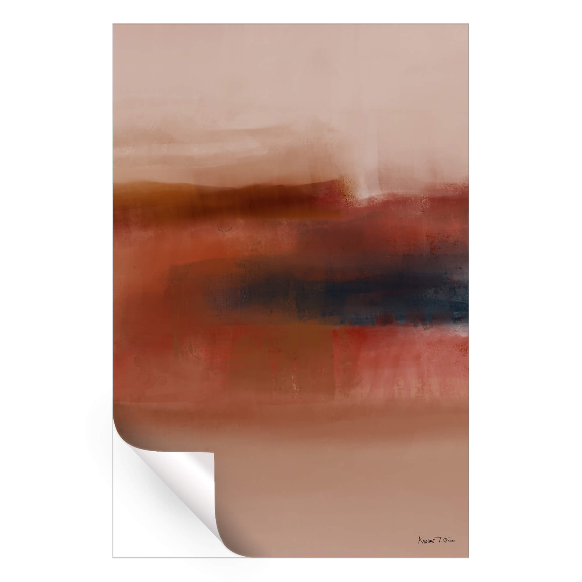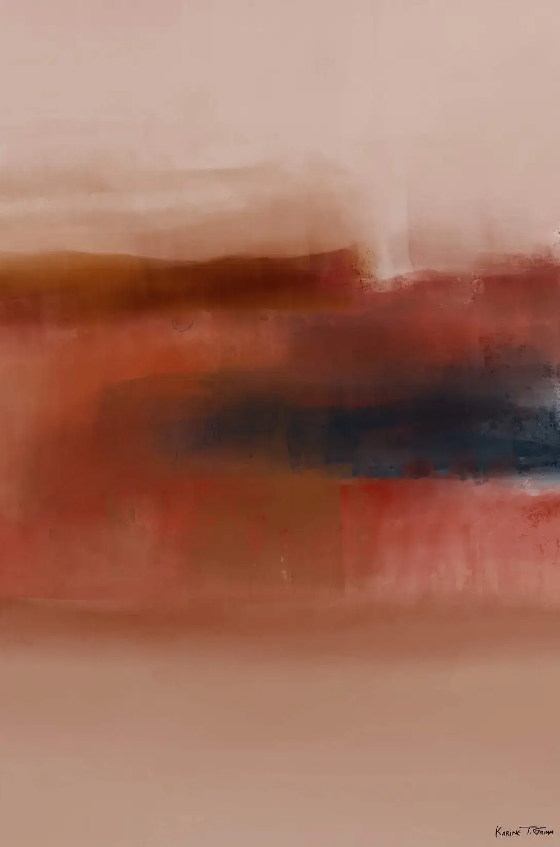 Horizontal bands of color stretch across, ranging from translucent to opaque. The earthy reds and browns meld into smoky greys and blacks, creating a horizon line that’s both stark yet subtle. The bands float on a creamy backdrop, their edges blurred, as if they’re part of a vast, unfolding landscape. The feeling is one of a natural expanse—quiet, still, and stretching beyond sight.