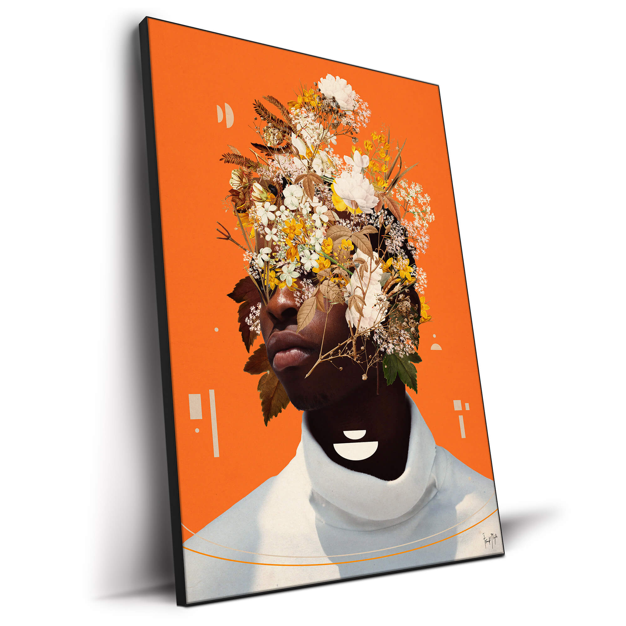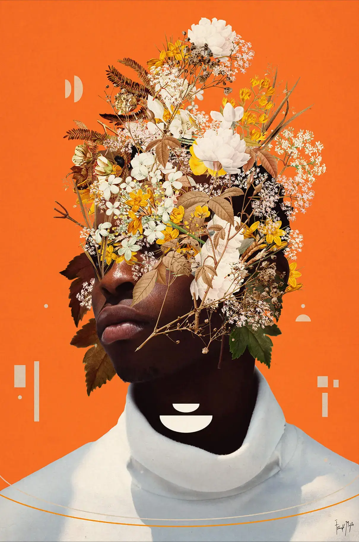 This surreal portrait transforms simplicity into power. Against a rich orange backdrop, soft blossoms in white, gold, and pale yellow bloom outward, forming a natural crown that contrasts with the subject’s calm expression and white turtleneck. The geometric shapes scattered across the composition bring precision and depth, complementing the organic energy of the flowers.