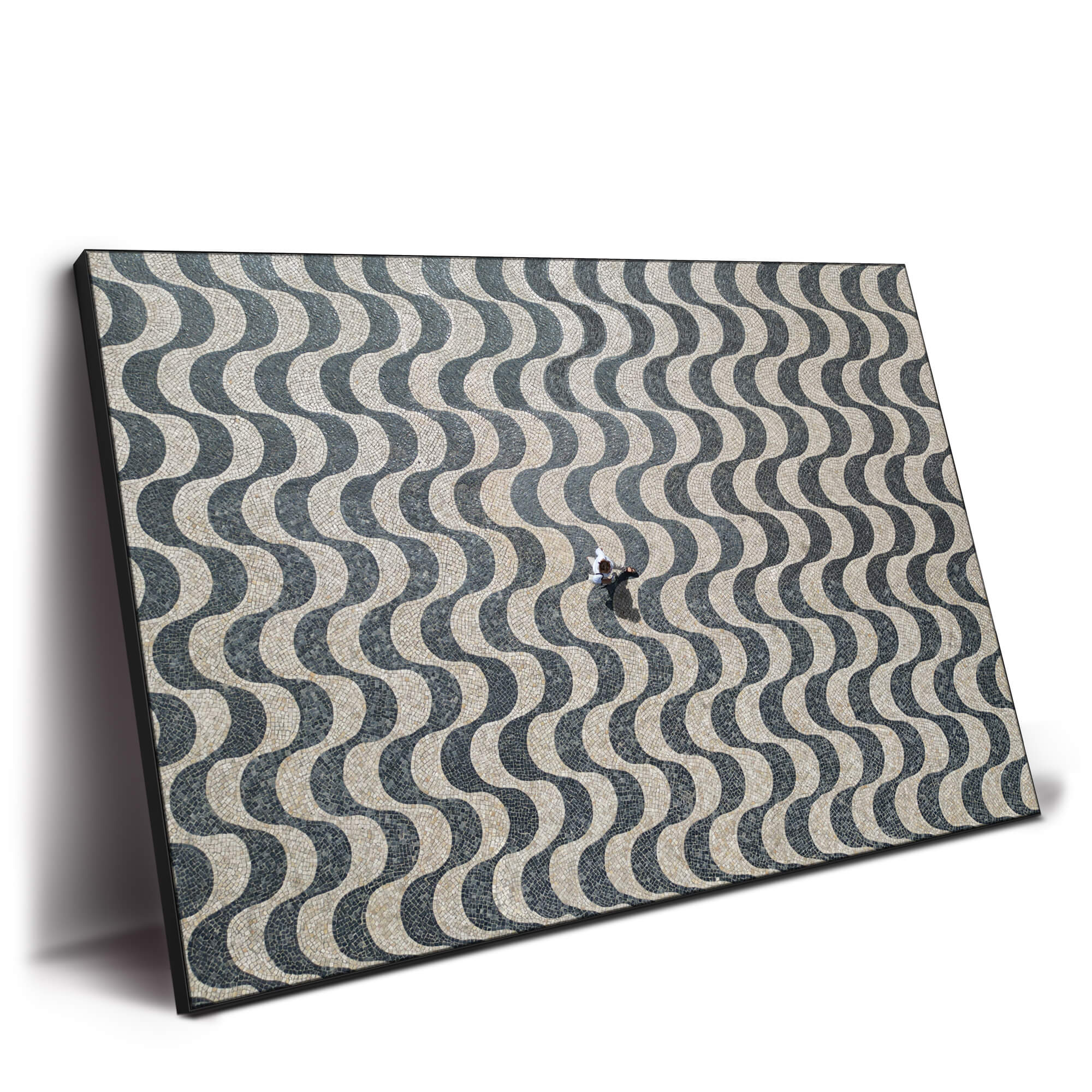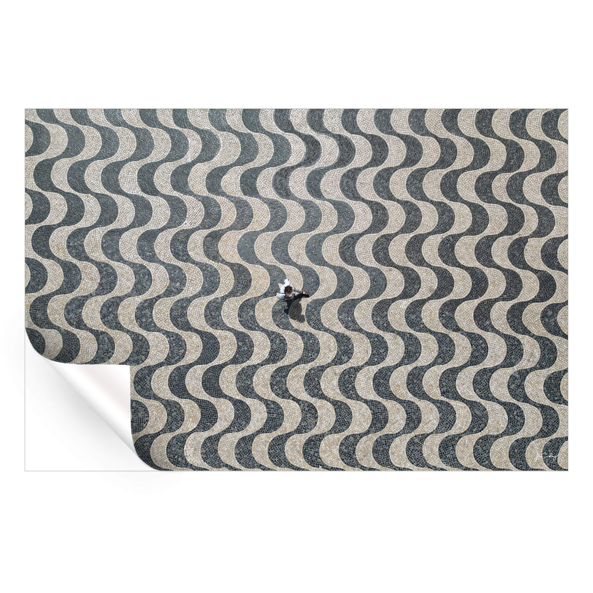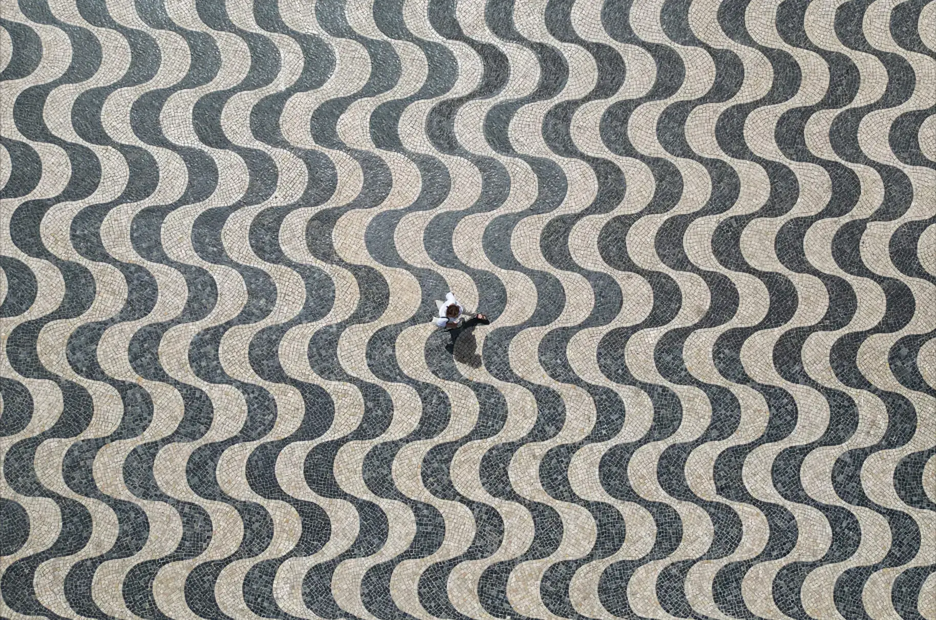 A bird’s-eye view reveals an individual traversing an expanse of cobblestone pavement, laid in a mesmerizing wave pattern that shifts between shades of gray and white. The person’s presence introduces a sense of scale to the undulating design of the pavement, which stretches across the work in rhythmic repetition.