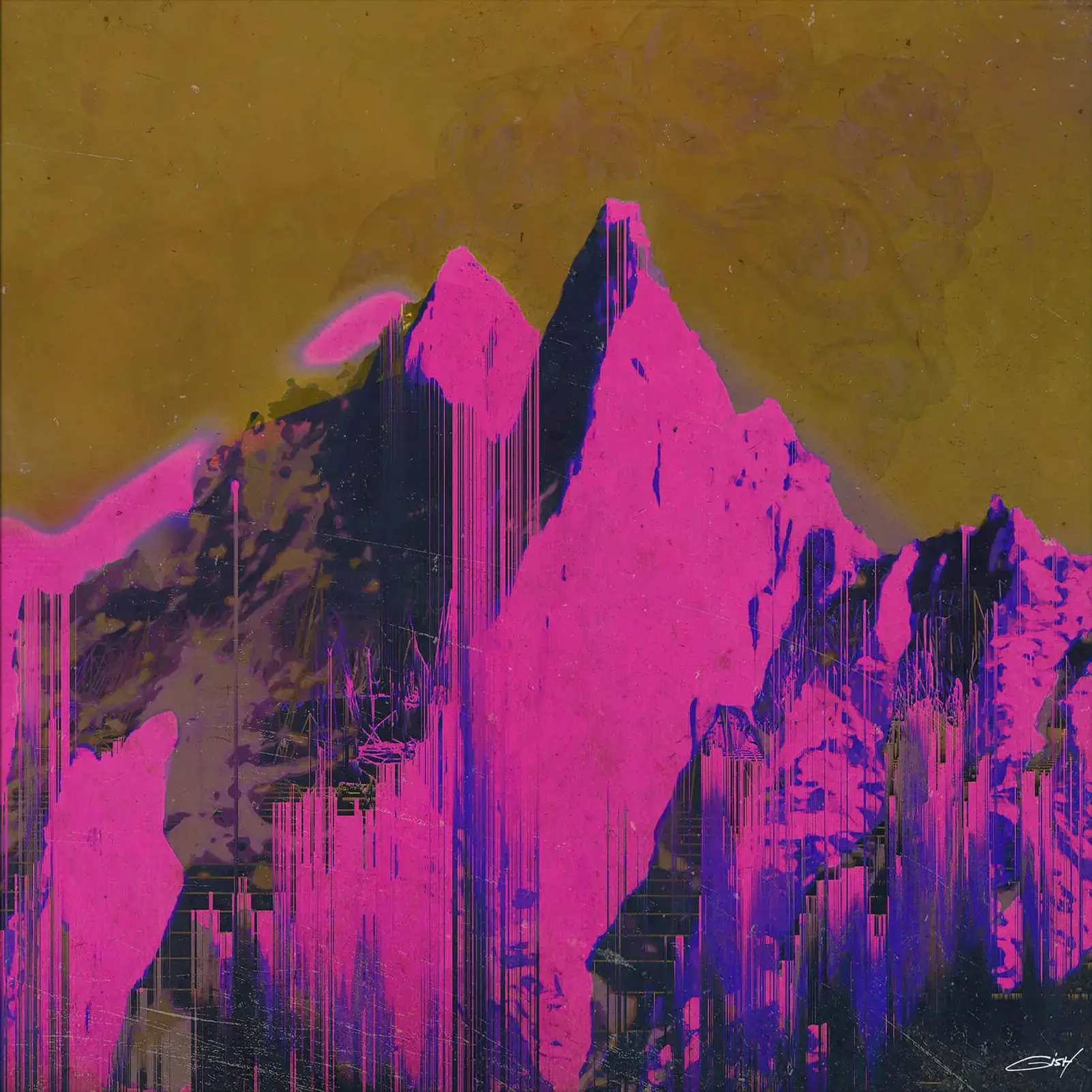 Pink mountains distorted with vertical lines create motion, as if the colors are running down the artwork. The texture is rich, layers of effects added to the surface adding intrigue. The dark, mustard background has subtle variations in tone, providing a contrast to the sharpness of the pink mountains.