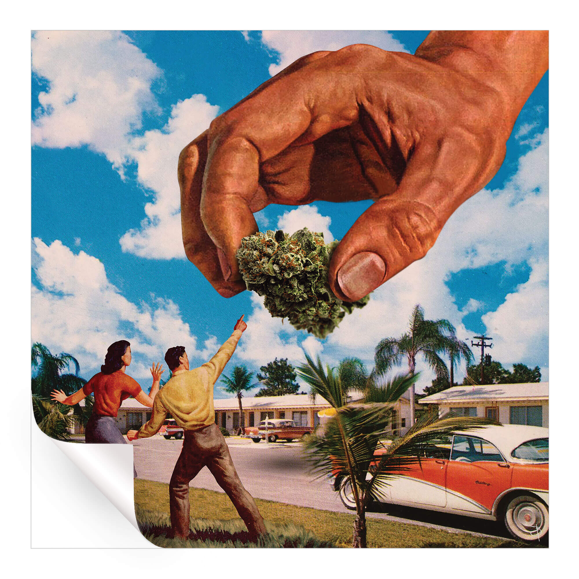 Mixing a vintage-looking suburban scene with a giant hand from the sky holding what appears to be a clump of greenery. A man and woman in retro clothing look up in awe or shock at the oversized hand. The artwork combines everyday life with an unexpected, oversized element, creating a whimsical and thought-provoking scene.