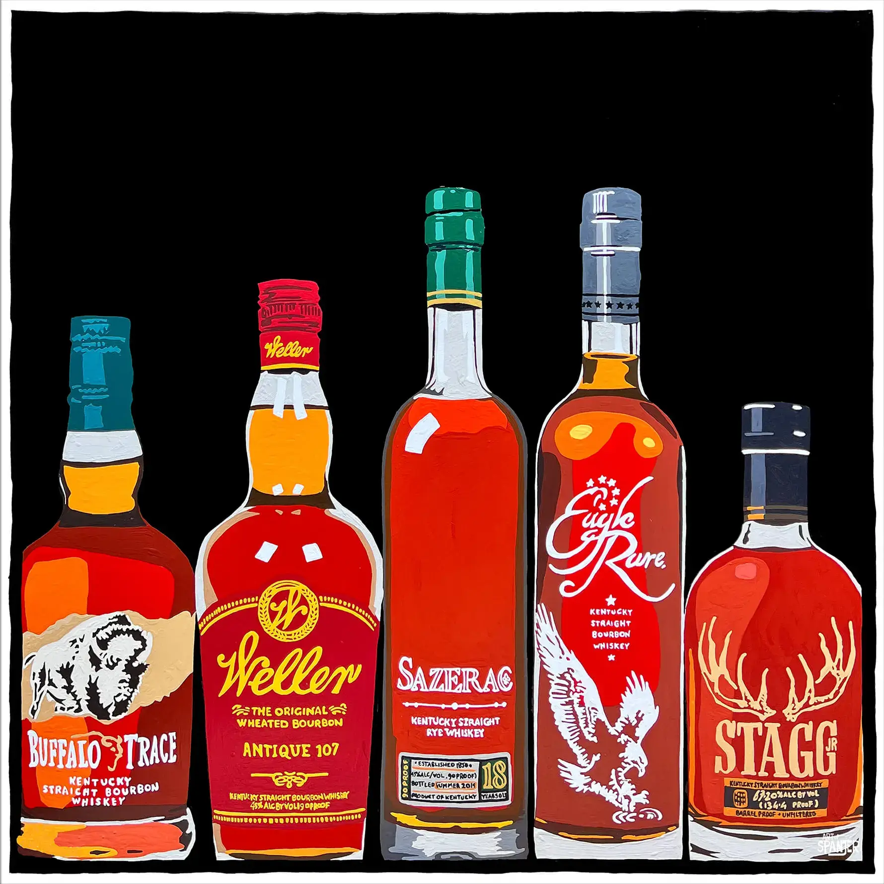 Elevate your space with this stunning artwork showcasing a collection of premium bourbon bottles. Featuring renowned labels like Buffalo Trace, Stagg, and Sazerac, this piece brings a touch of sophistication and warmth to any bar or living area. Ideal for bourbon enthusiasts, this artwork is a celebration of craftsmanship and quality.