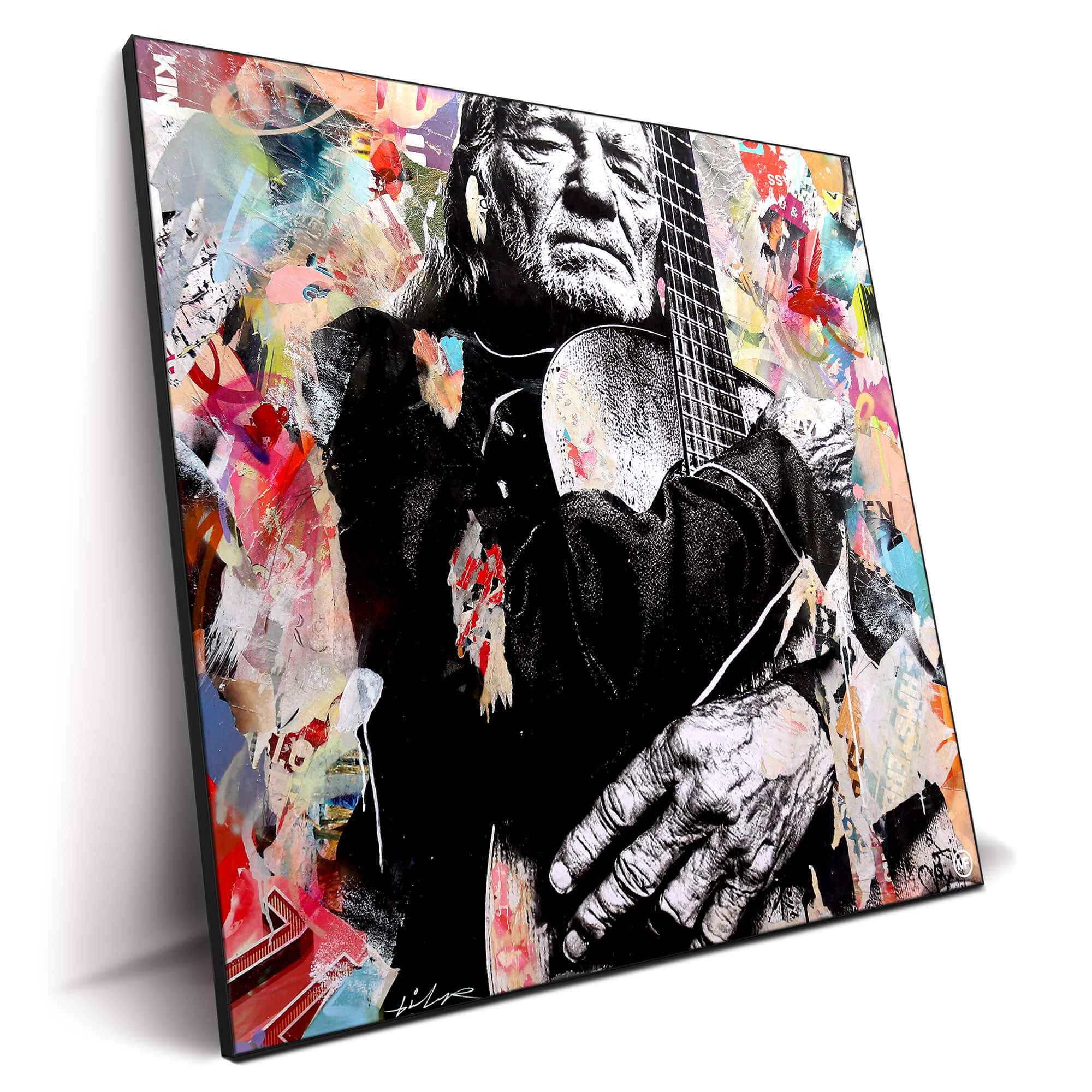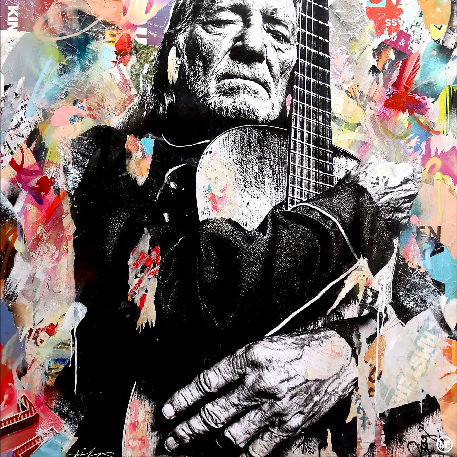 This mixed media artwork of Willie Nelson captures the spirit of the iconic musician with vibrant colors and dynamic textures. The portrayal highlights his passion for music and creates a lively atmosphere.