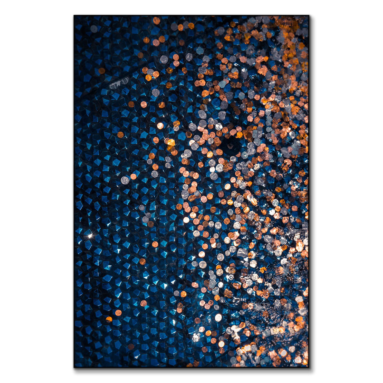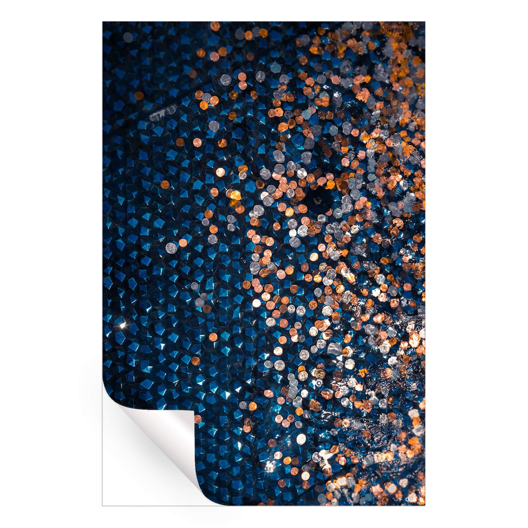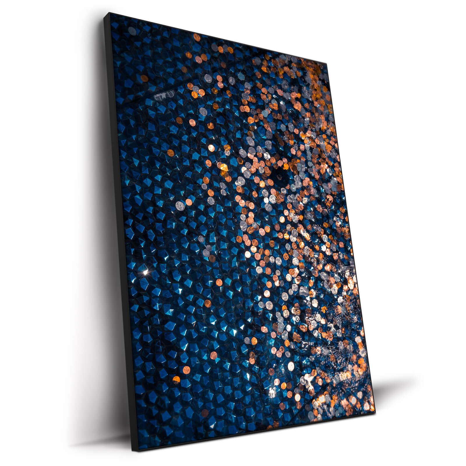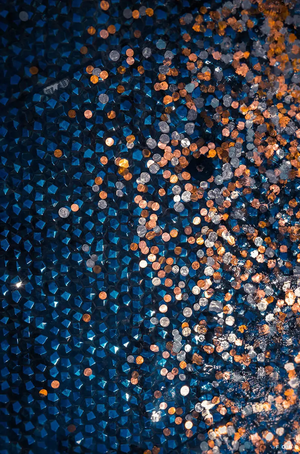 Thousands of small, geometric shapes cover the frame, creating a mosaic of blues with sprinkles of copper and gold. The colors transition smoothly from a dense navy at one edge to lighter hues, with the copper and gold elements clustered in an arc that sweeps across the image. Light reflects off these metallic-colored shapes, giving them a sparkling appearance against the matte blue background.